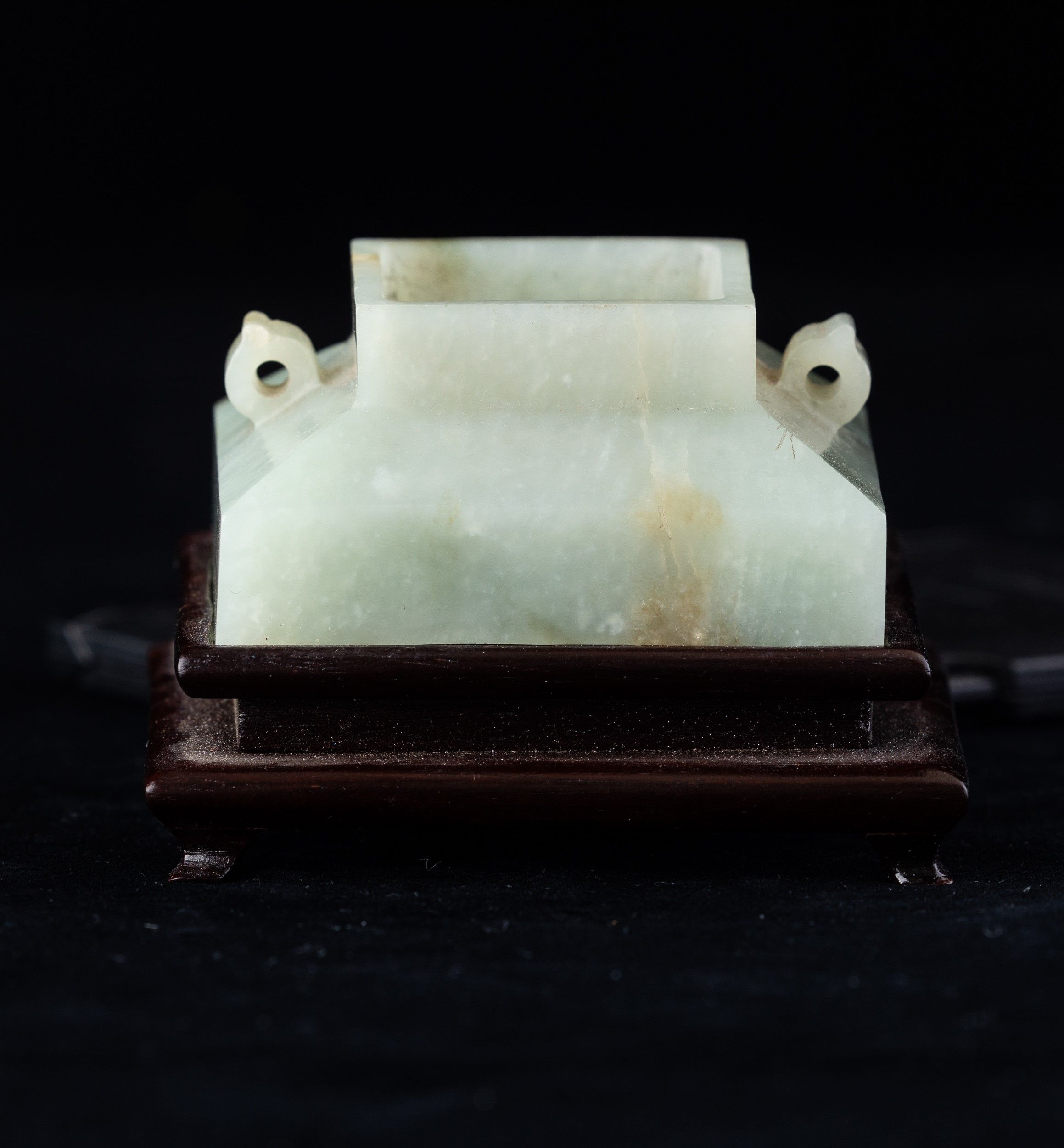 Vasetto a sezione quadrata con piccole anse scolpito in giada Celadon, Cina, Dinastia [..]