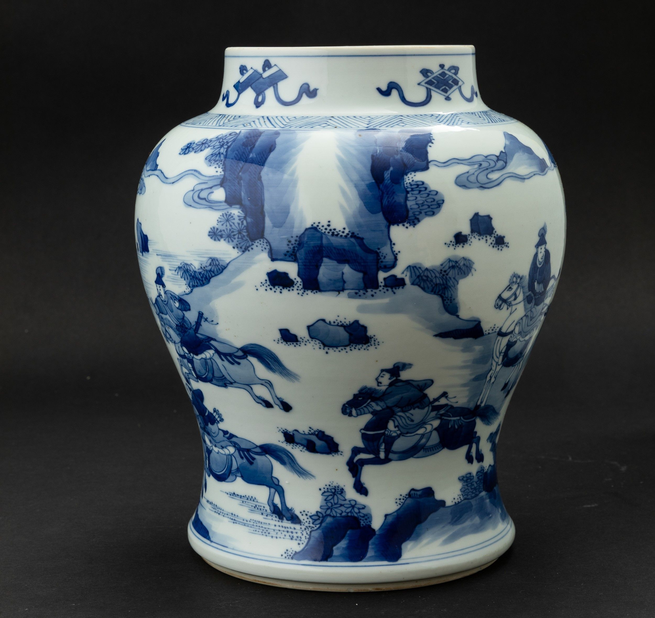 Vaso in porcellana bianca e blu con figure di cavalieri entro paesaggio e simboli [..]