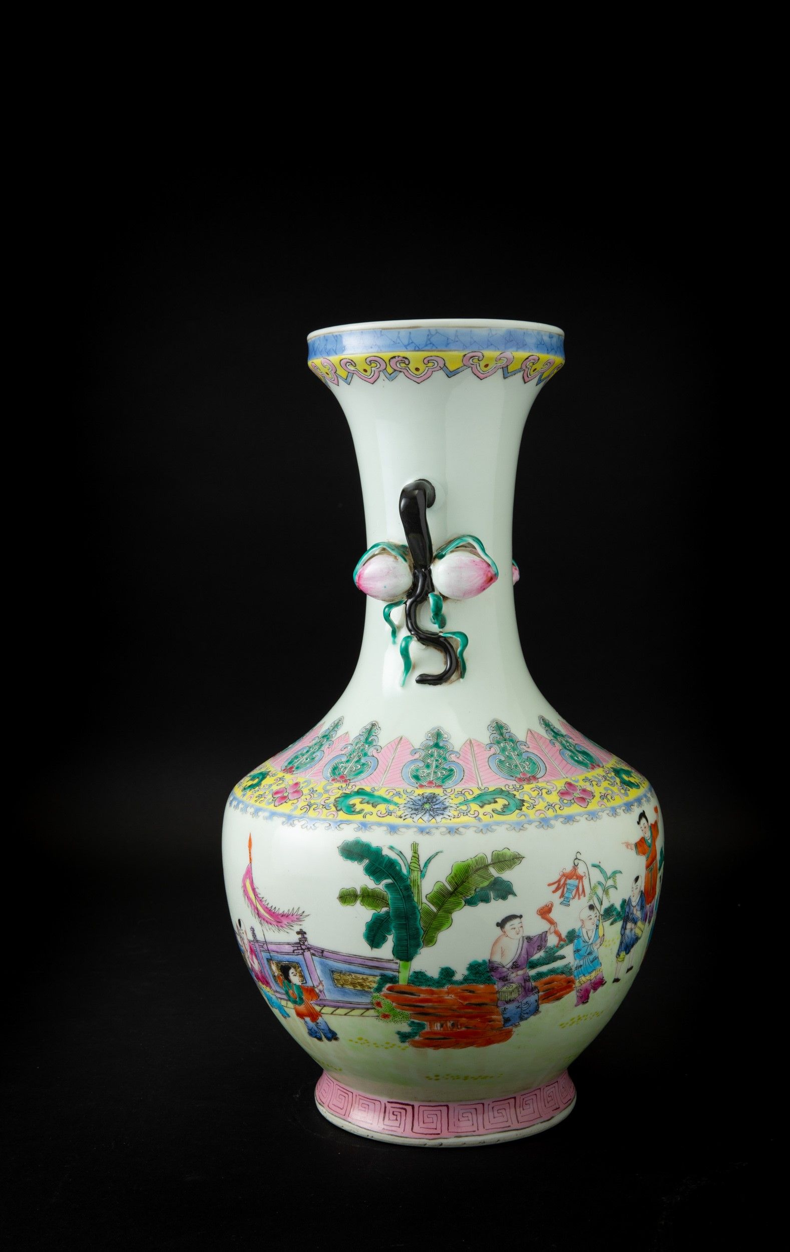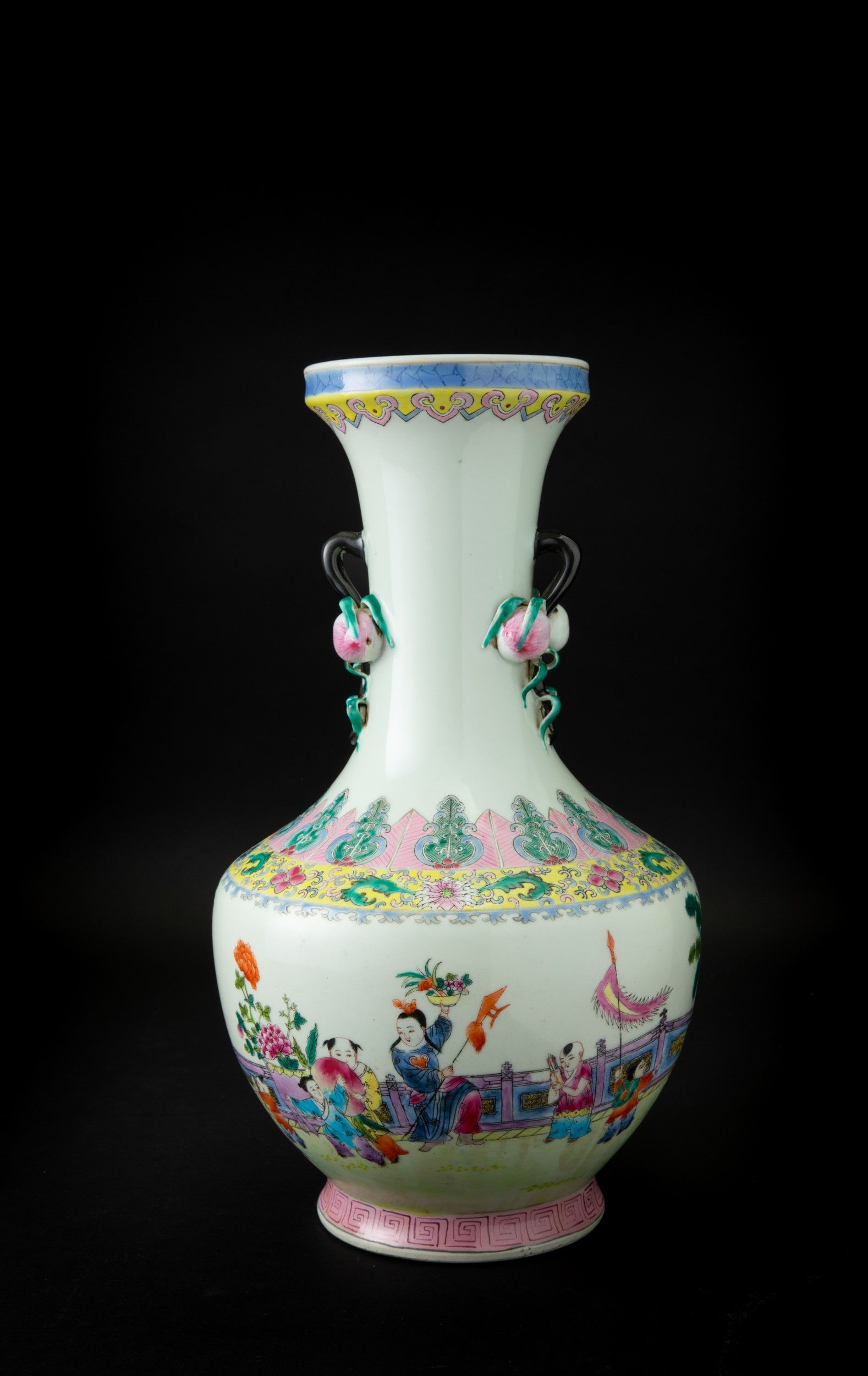 Vaso in porcellana con anse a foggia di pesche e raffigurazione di saggi con fanciulli [..]