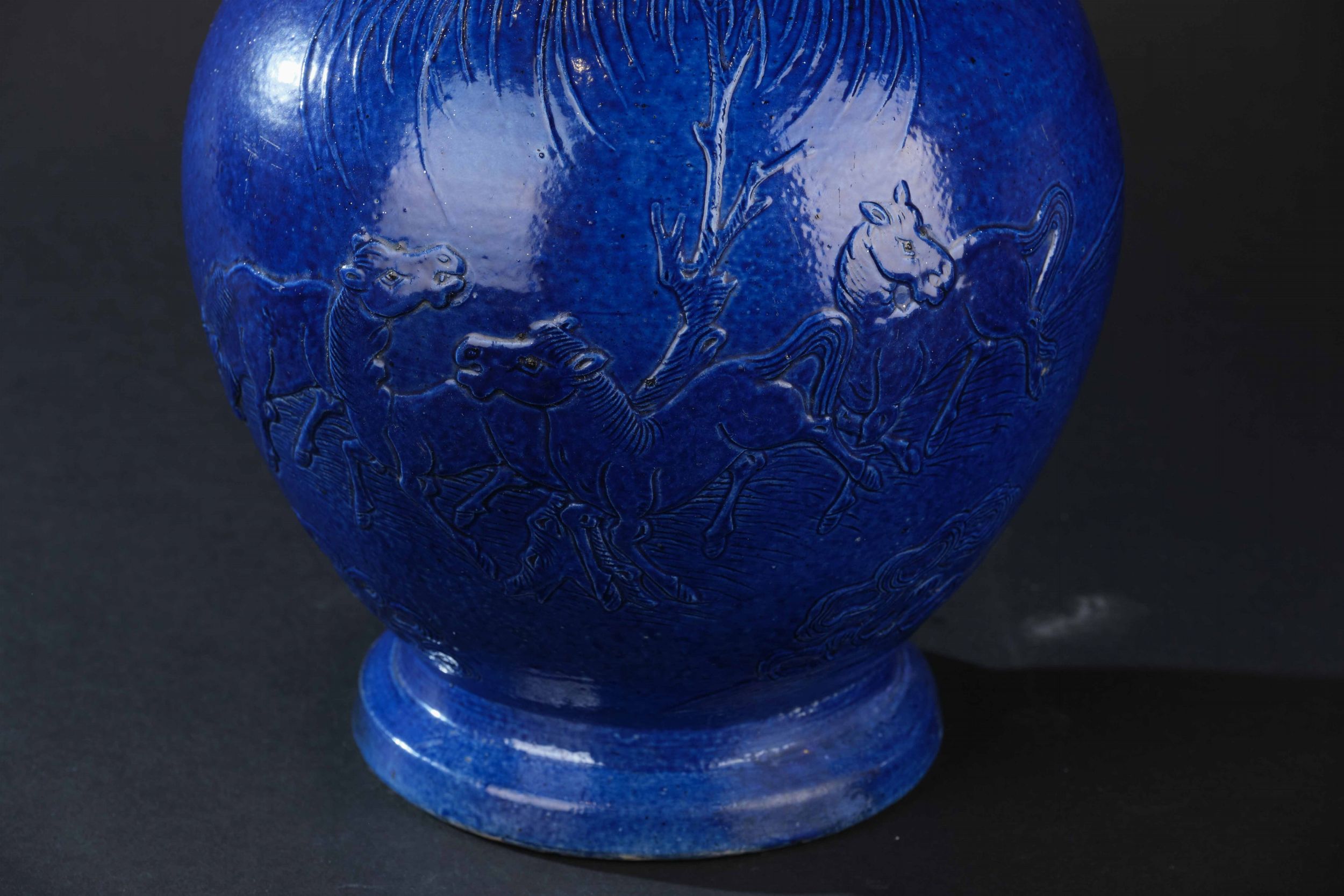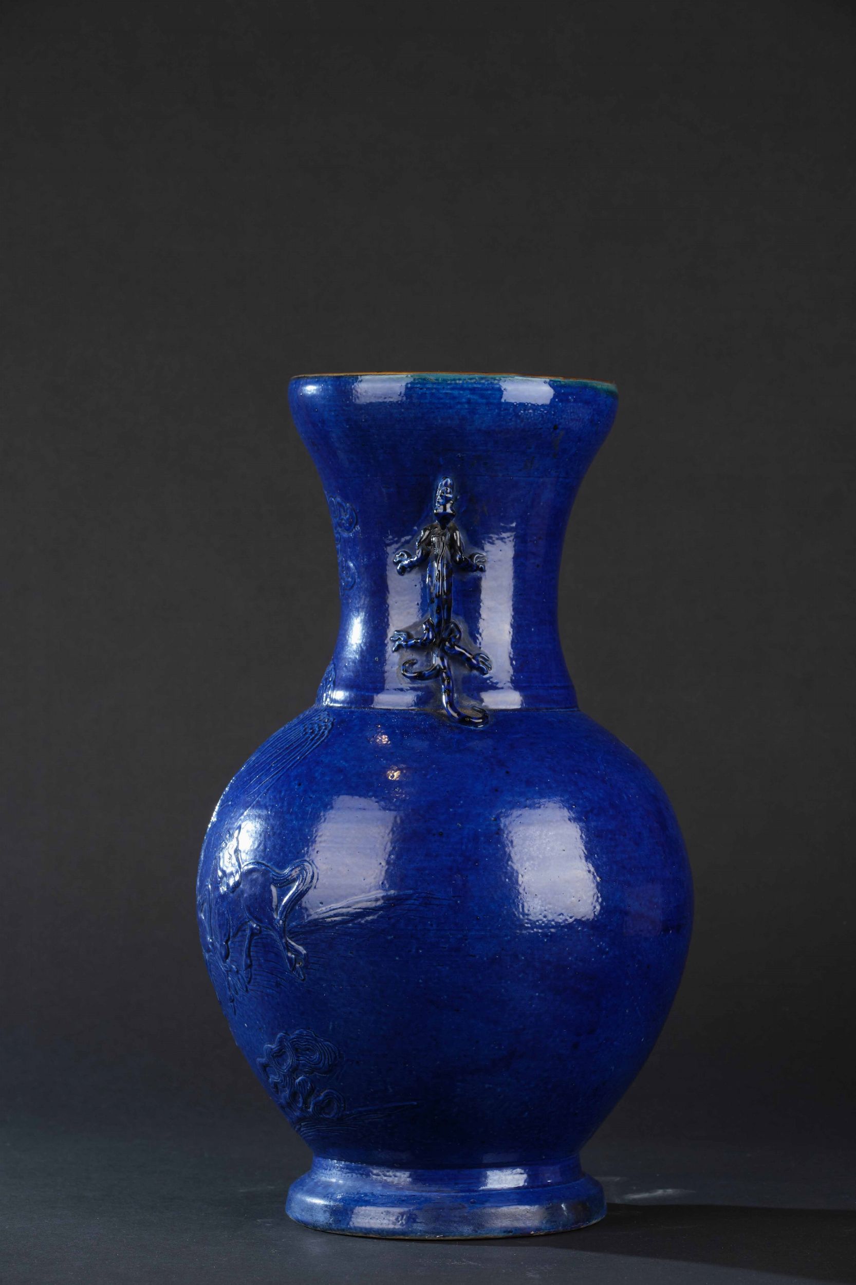 Vaso in porcellana monocroma blu con anse sagomate a foggia di drago e raffigutazioni [..]