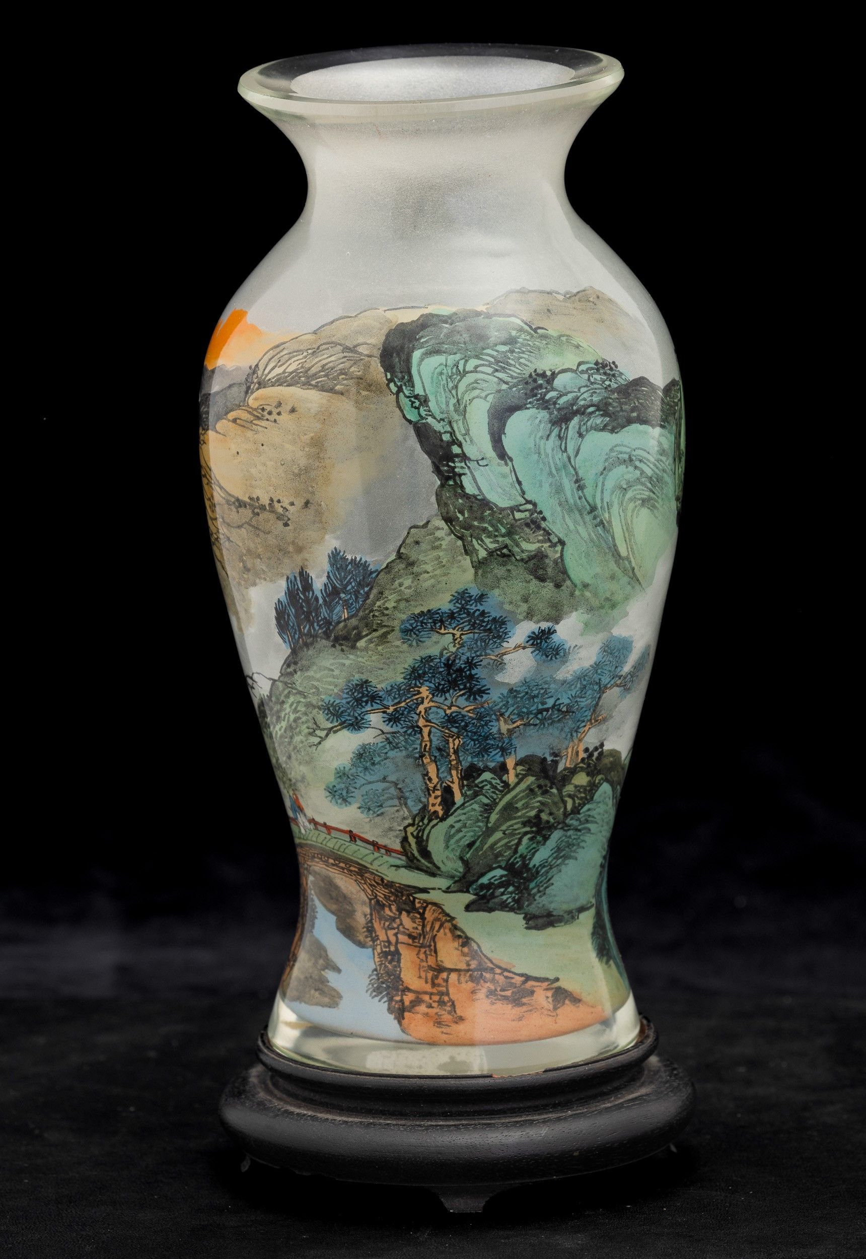 Vaso in vetro dipinto raffigurante paesaggio con figure e iscrizioni, Cina, Dinastia [..]