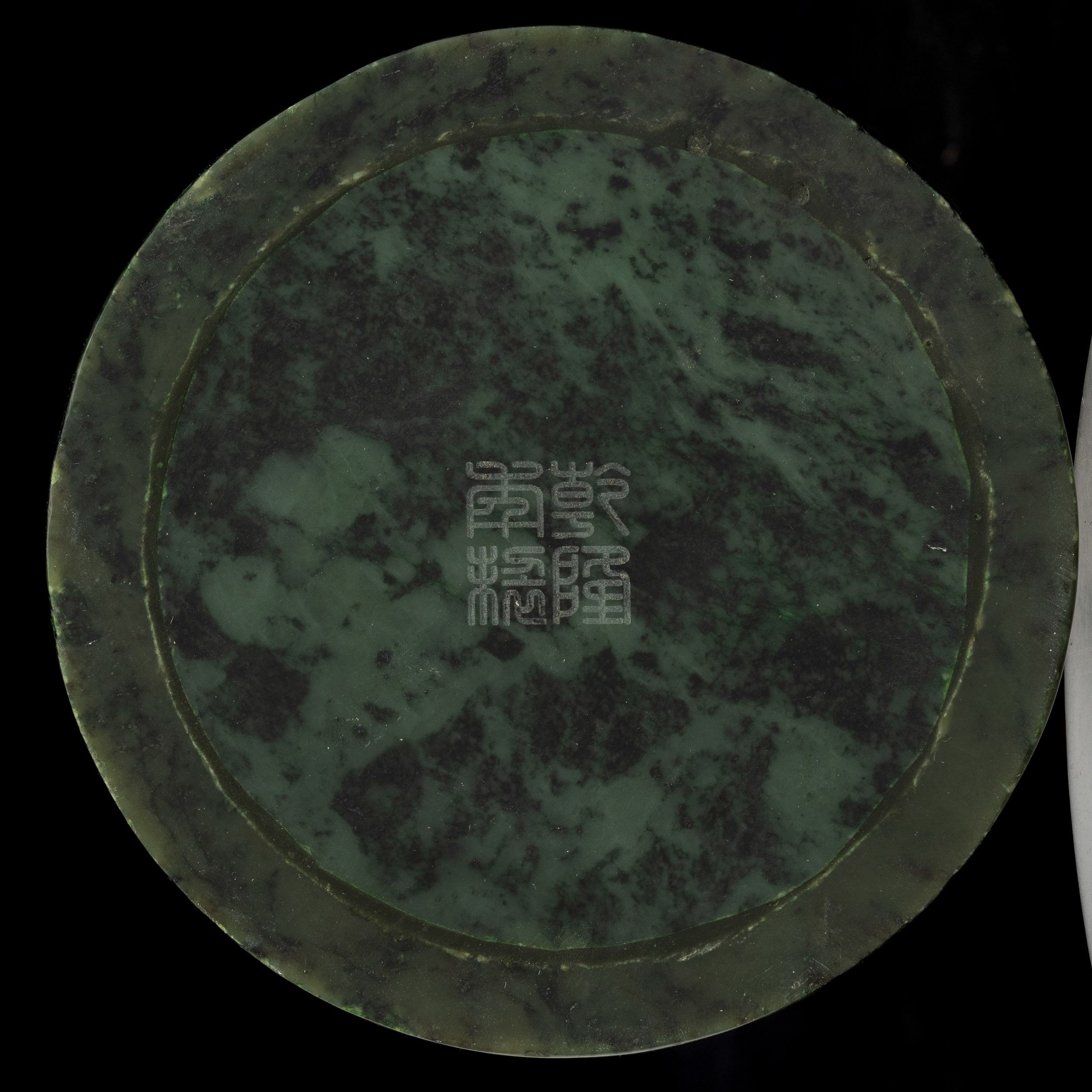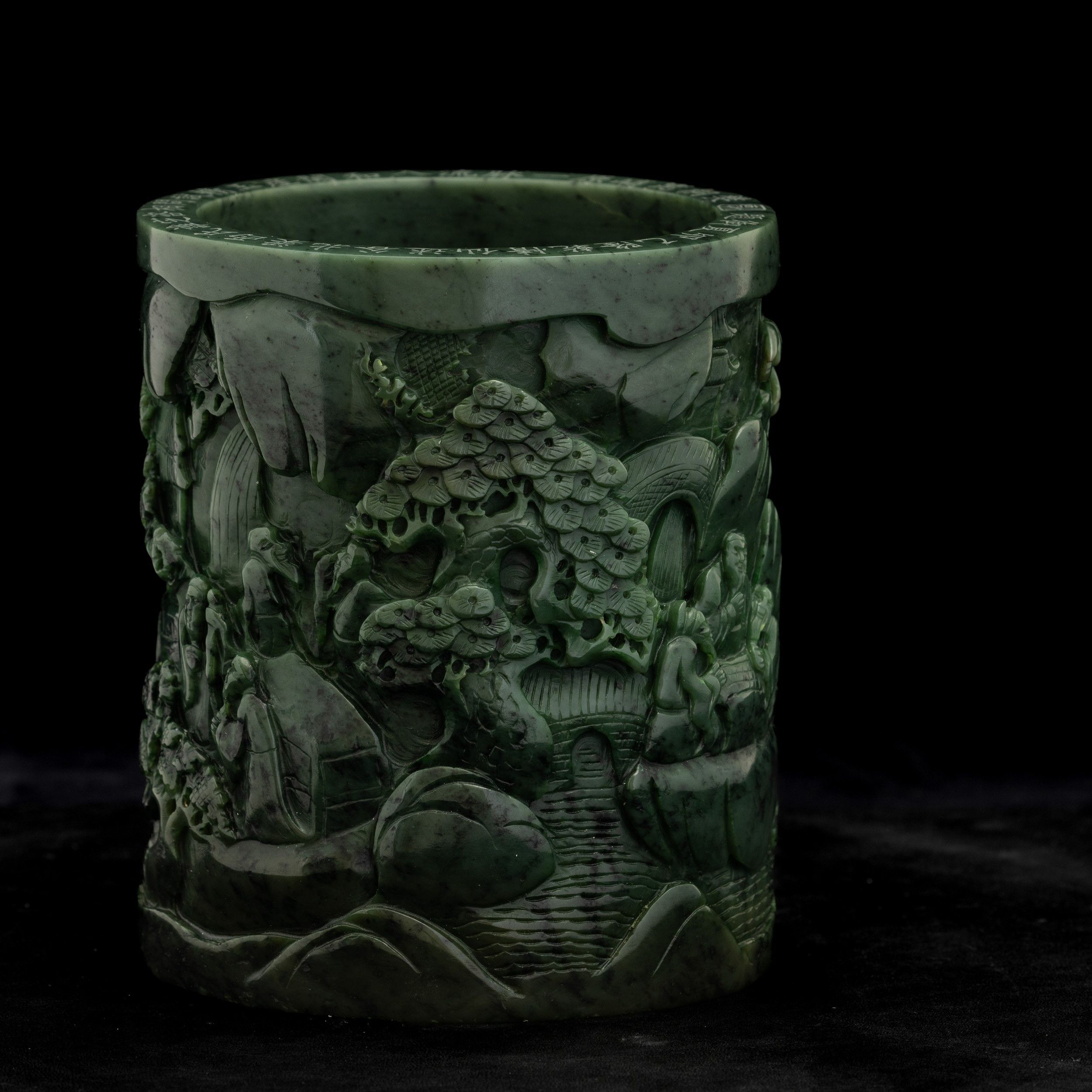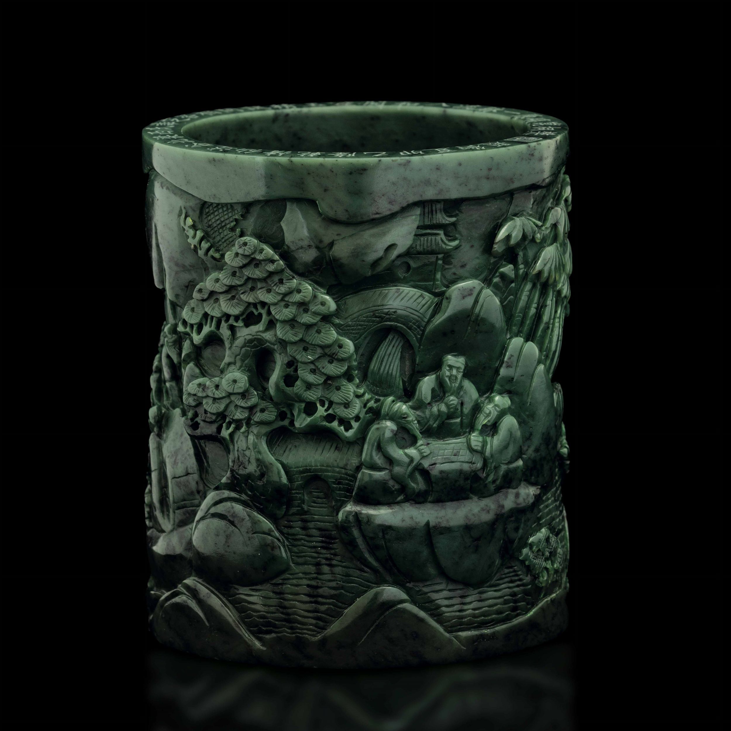 Brushpot scolpito in giada spinacio con figure di personaggi entro paesaggio e iscrizioni, [..]