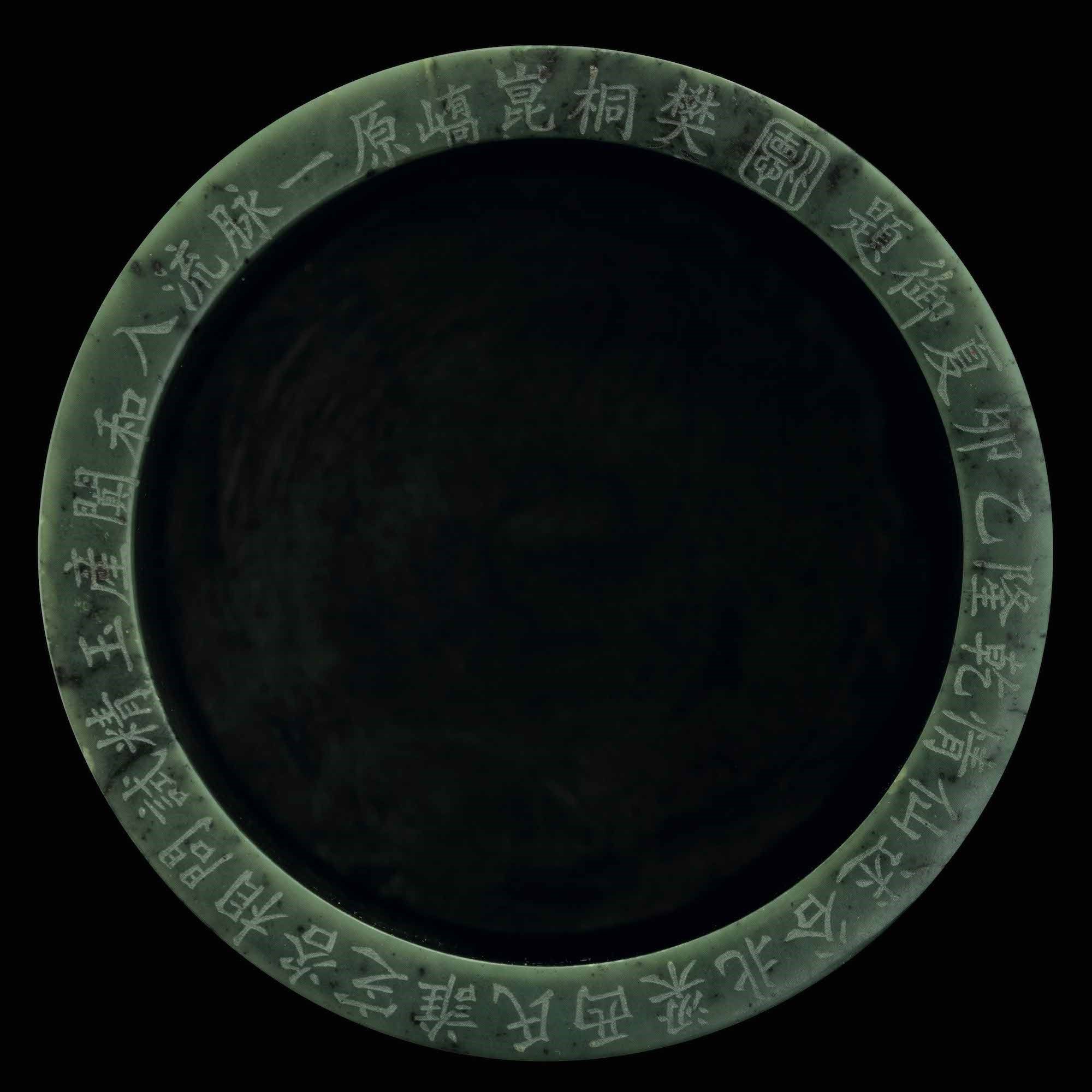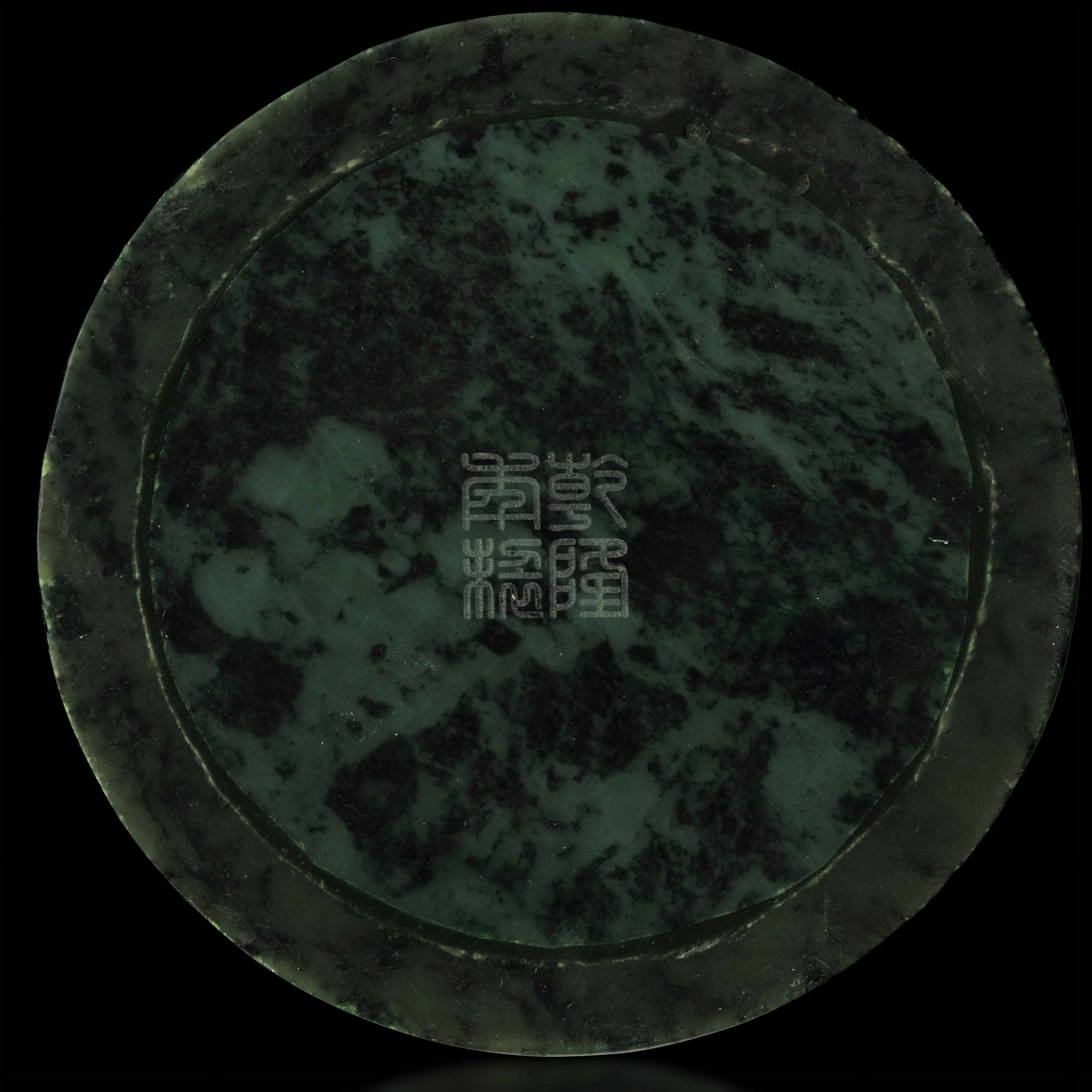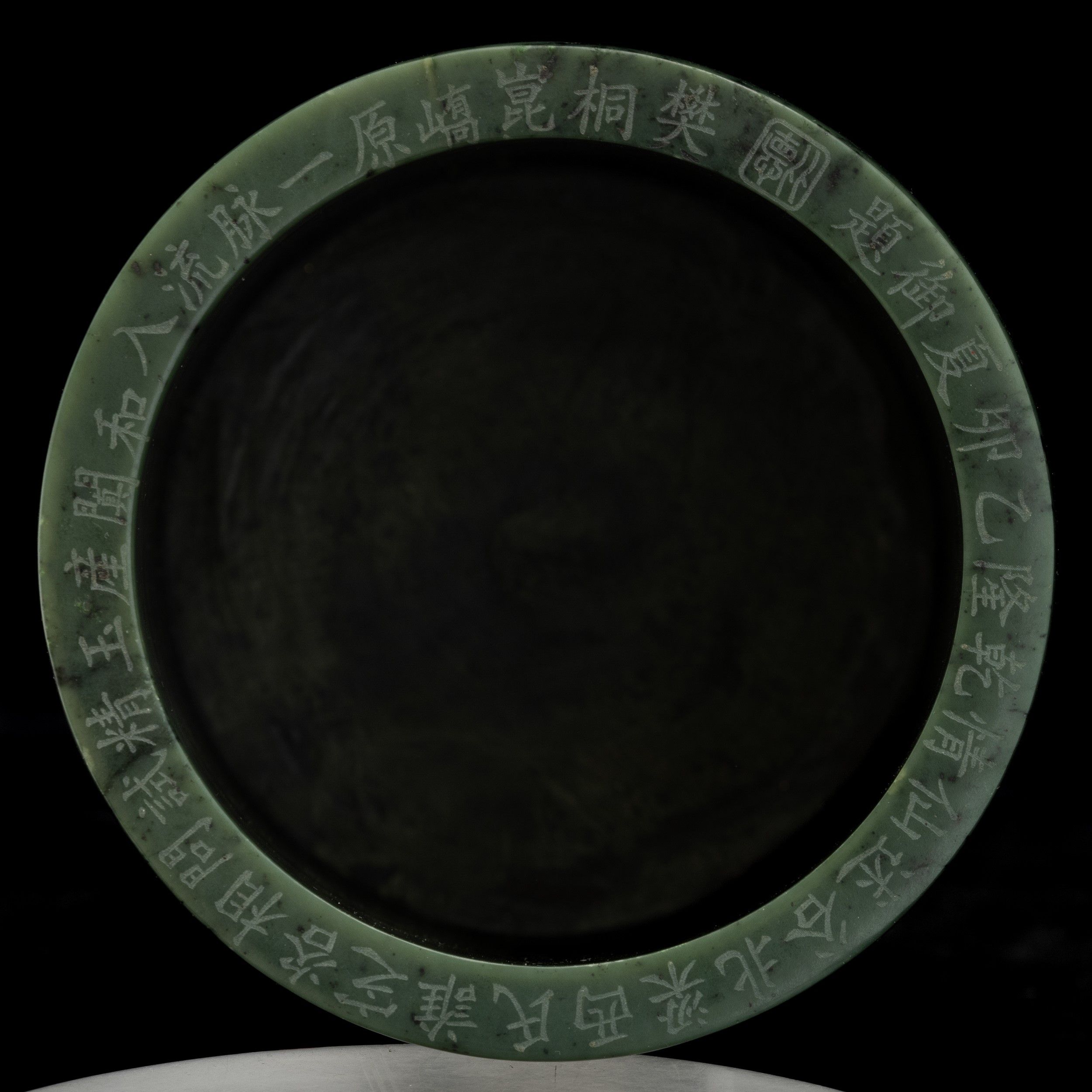 Brushpot scolpito in giada spinacio con figure di personaggi entro paesaggio e iscrizioni, [..]
