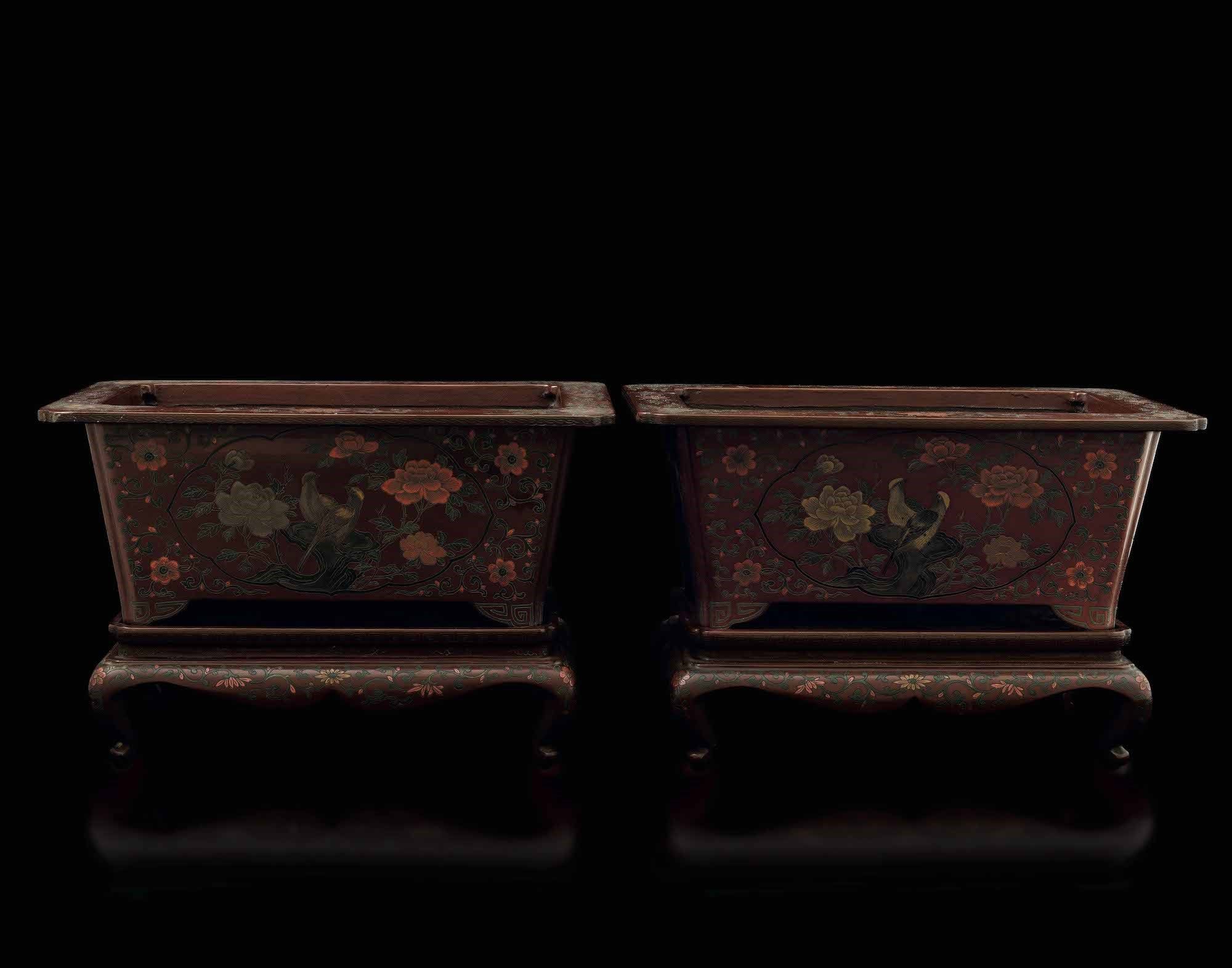 Coppia di giardiniere in legno laccato con decorazioni floreali e uccelli, Cina, [..]