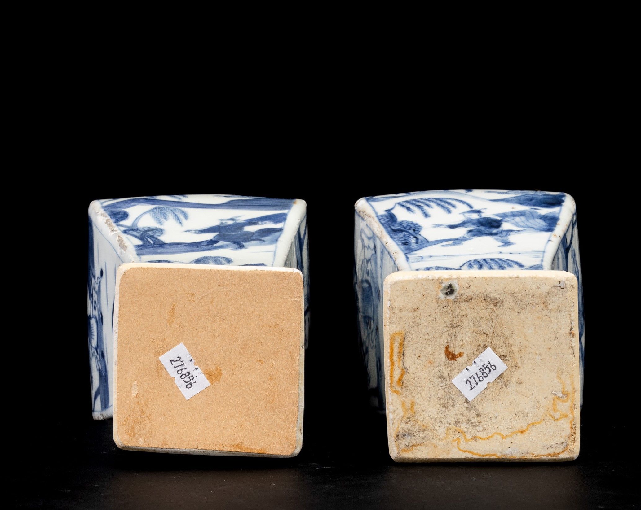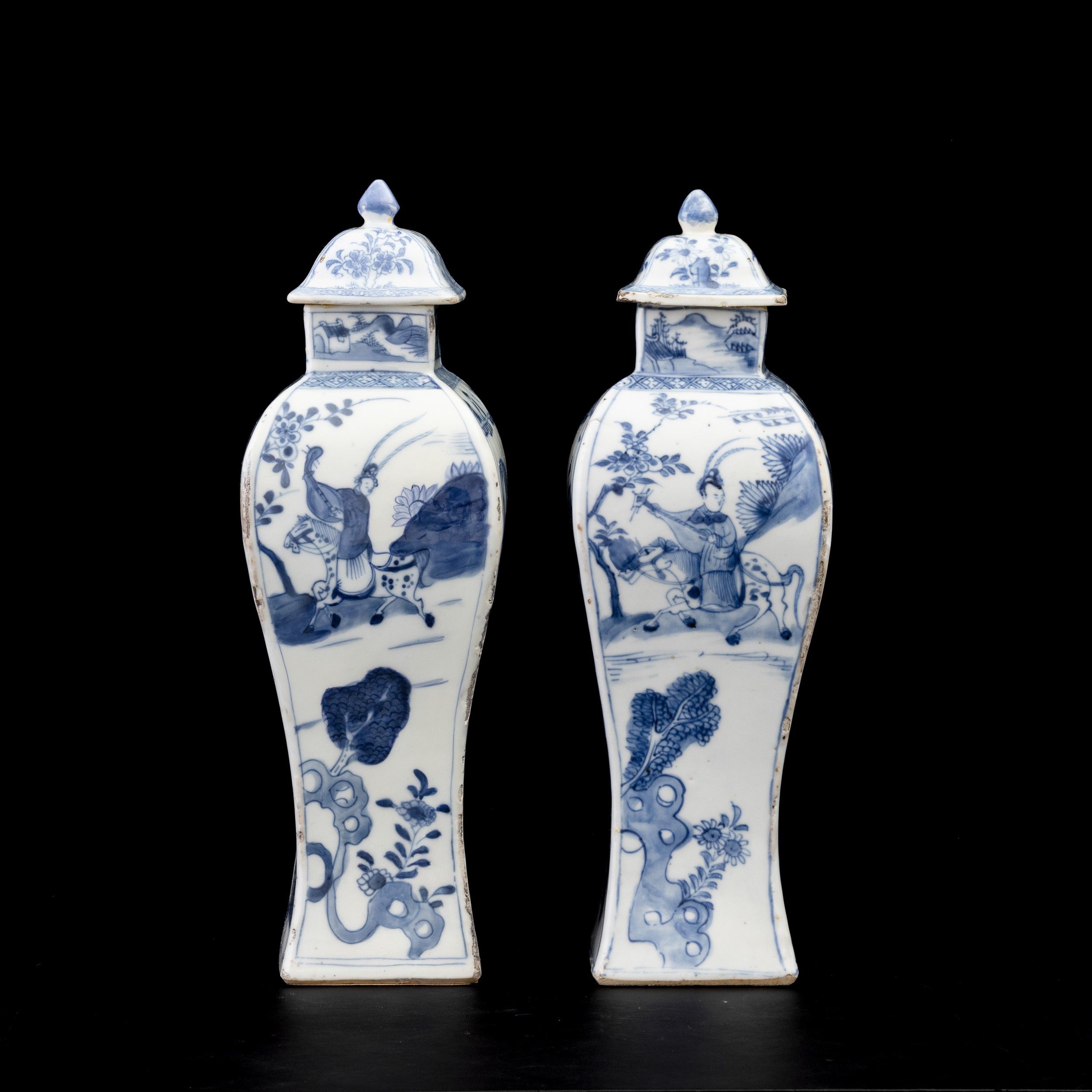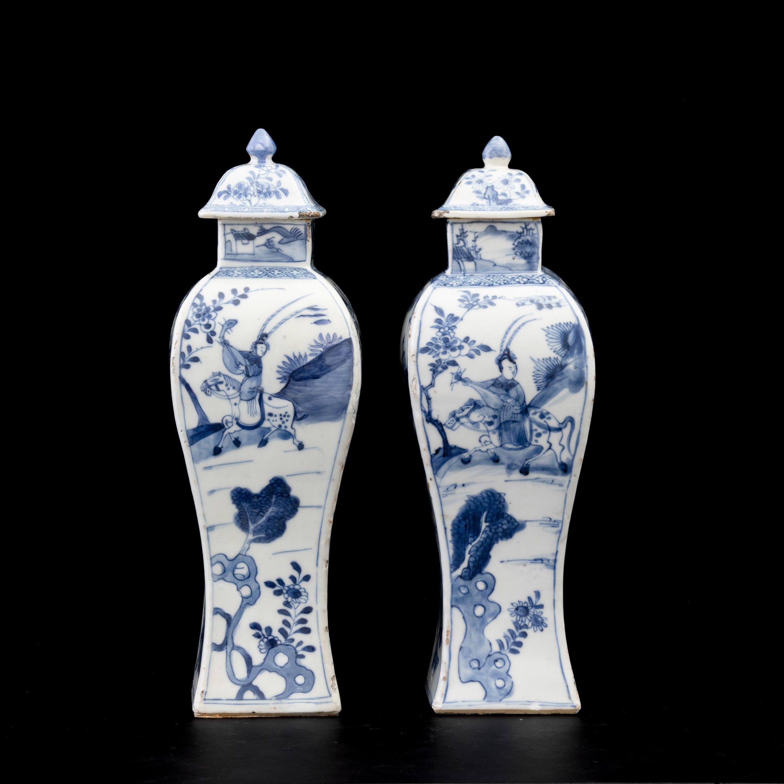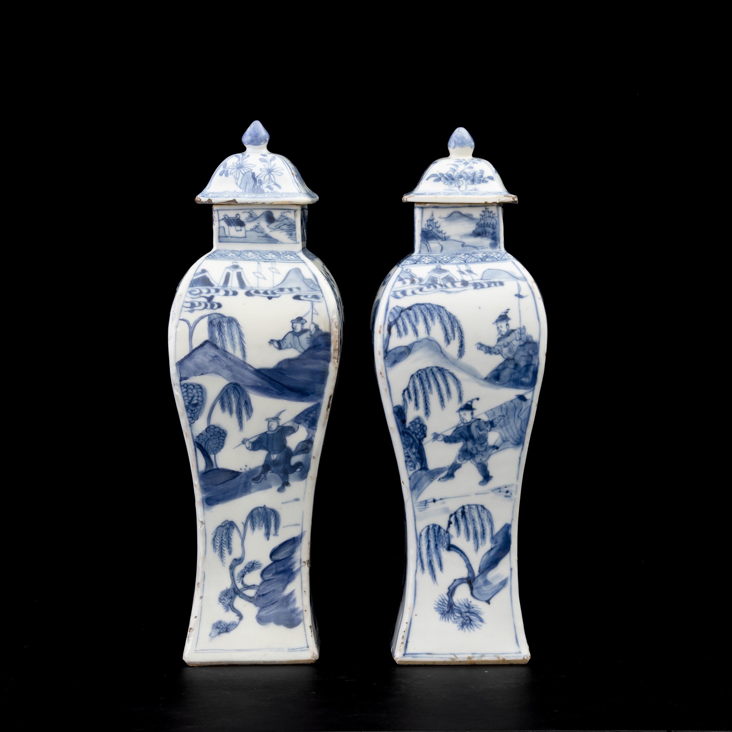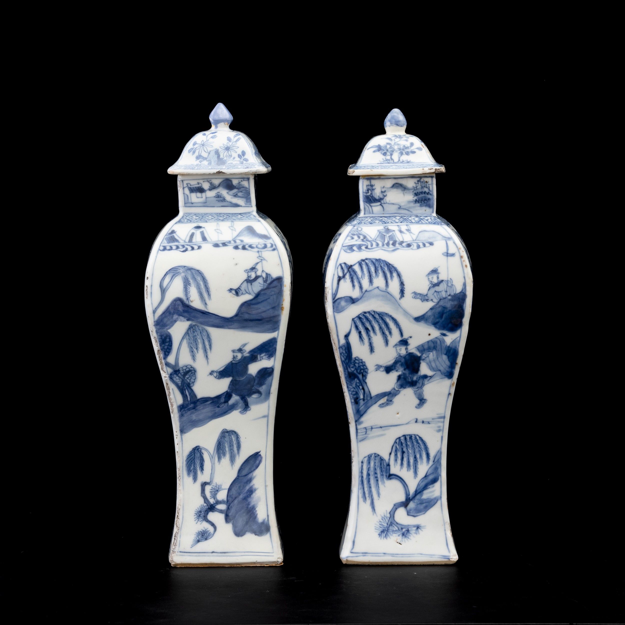 Coppia di potiches in porcellana bianca e blu con personaggi entro paesaggio, Cina, [..]