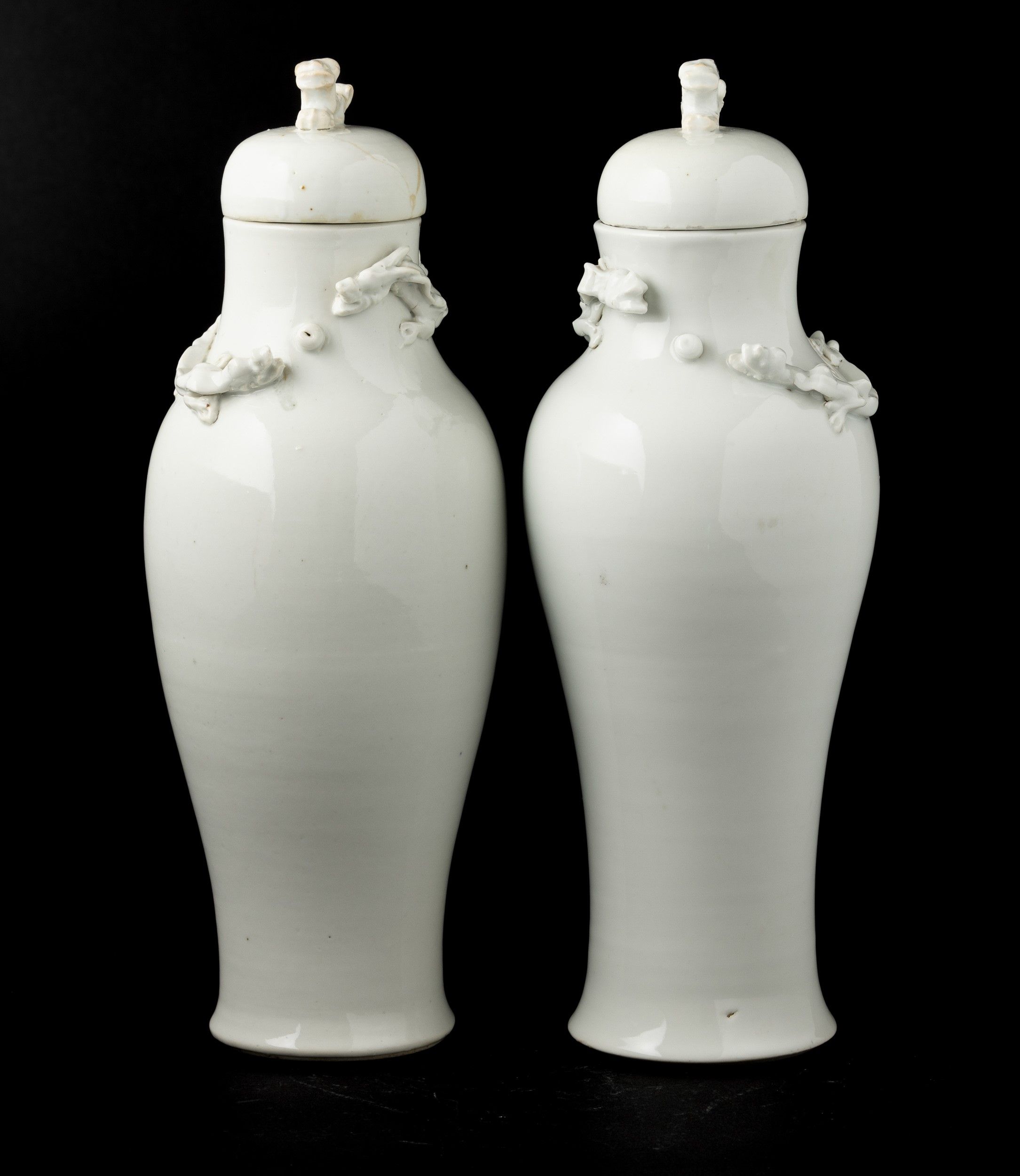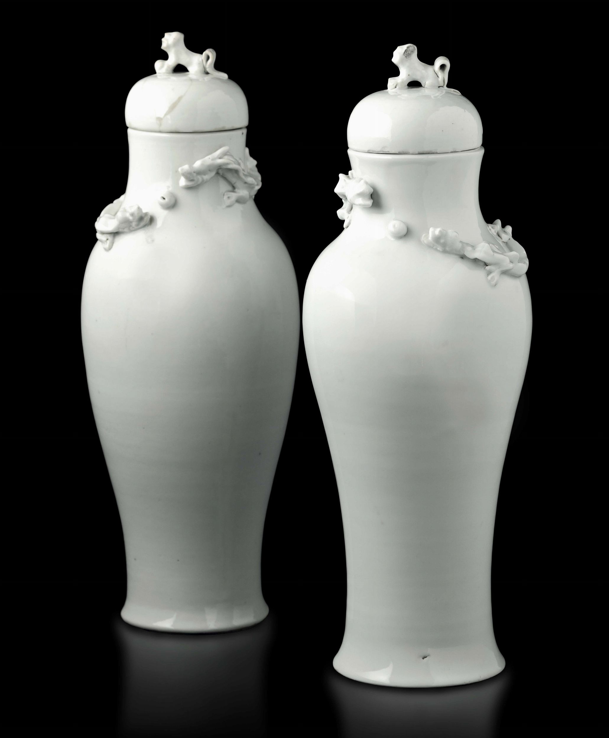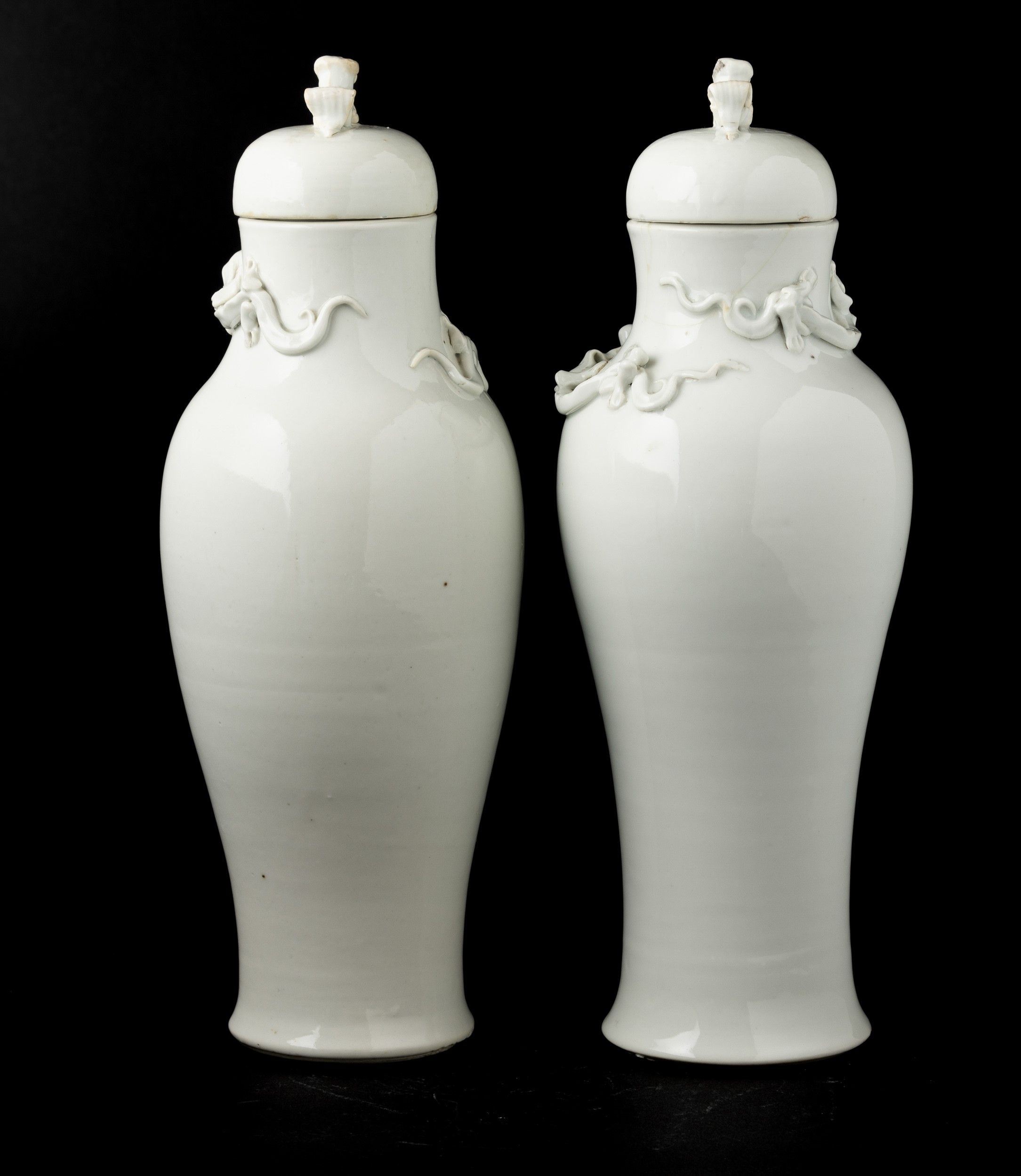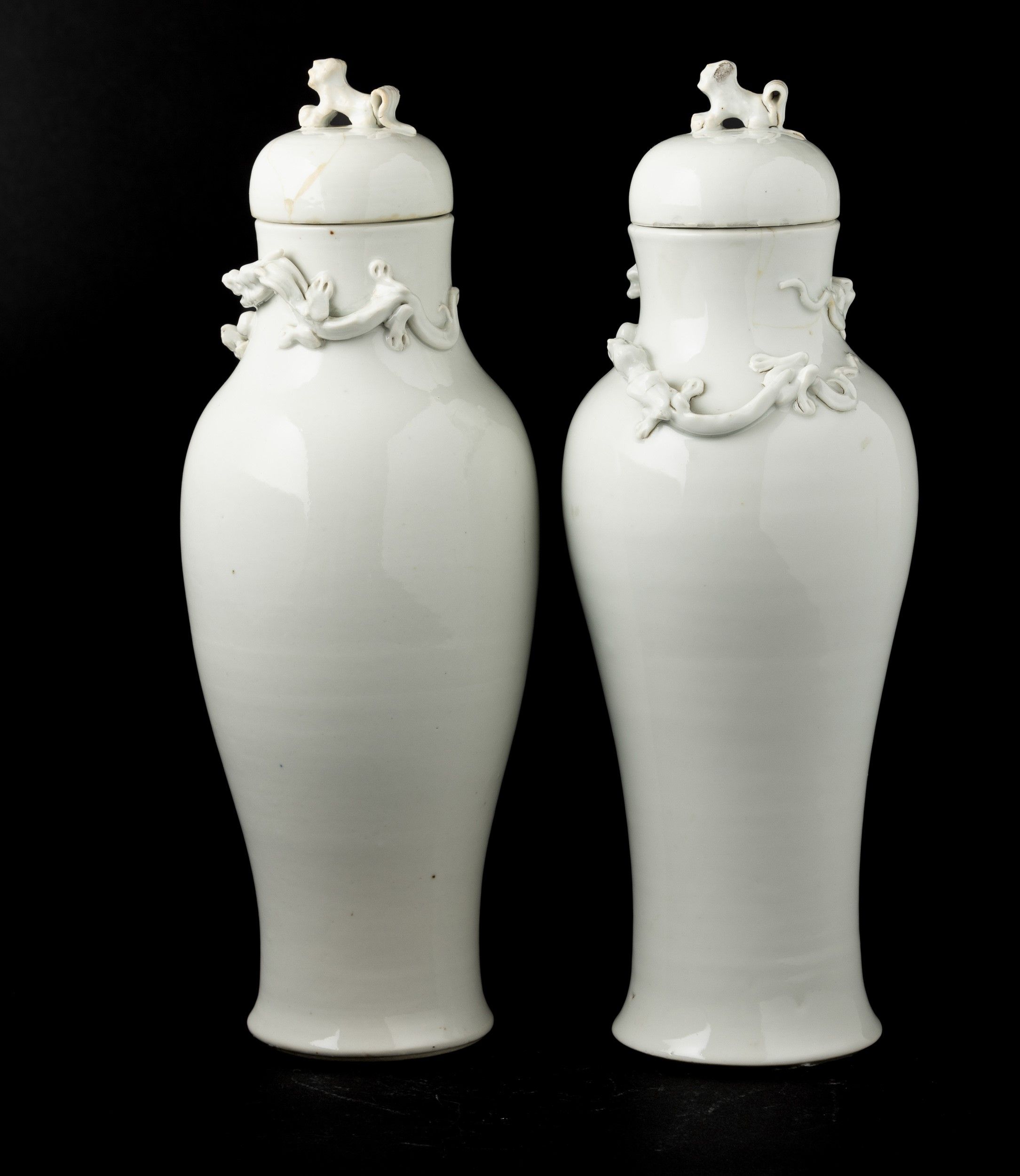 Coppia di potiches in porcellana Blanc de Chine con figure di draghetti a rilievo, [..]