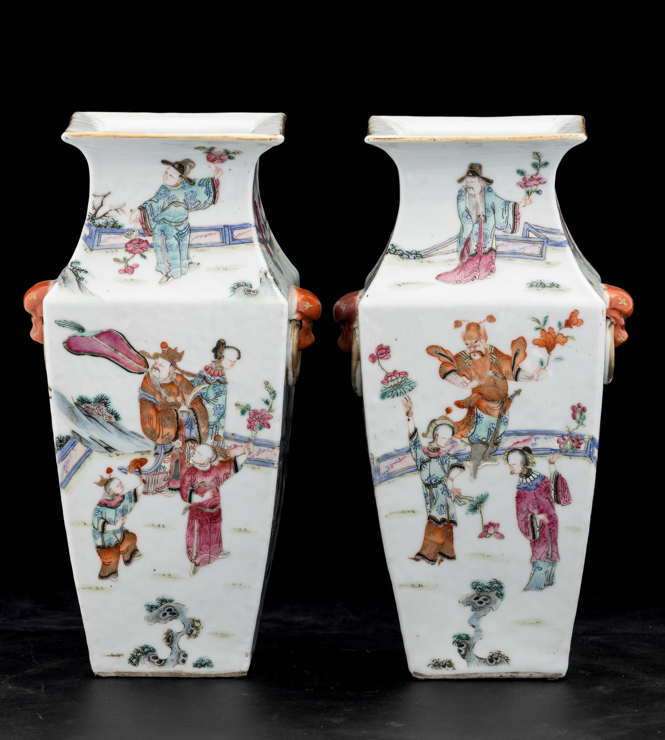 Coppia di vasi in porcellana Famiglia Rosa con mascheroni, anse ad anello e figure [..]