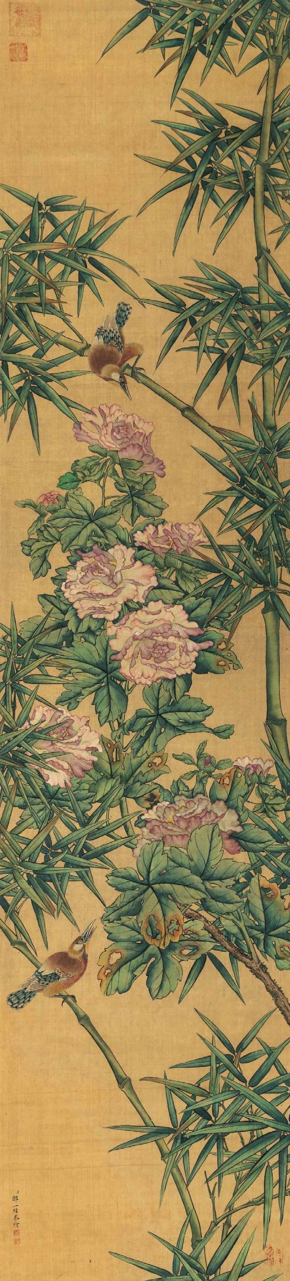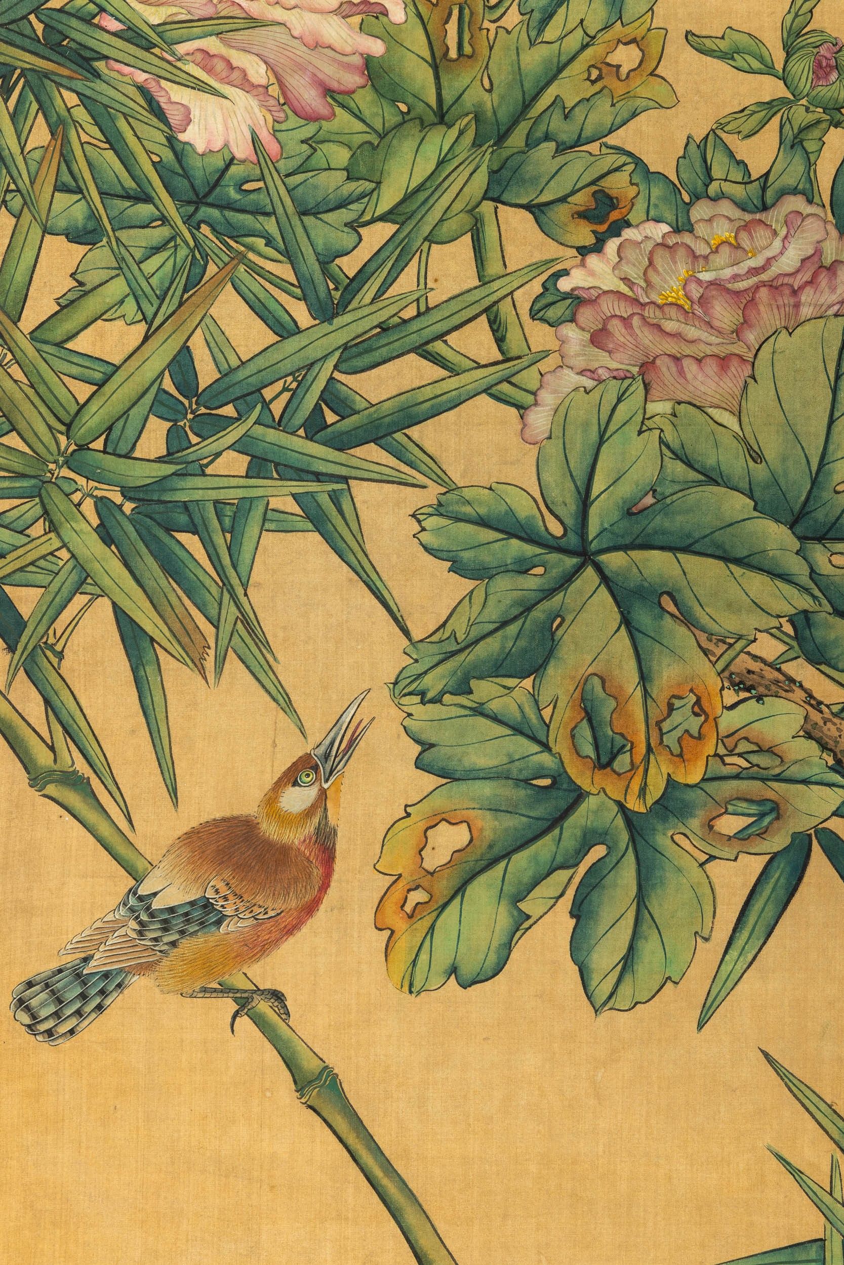 Dipinto su seta raffigurante uccellini tra rami in fiore e iscrizione, Cina, Dinastia [..]