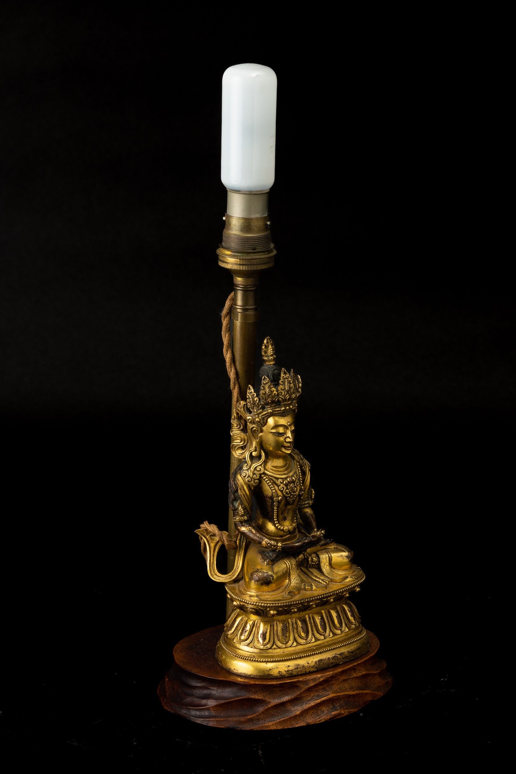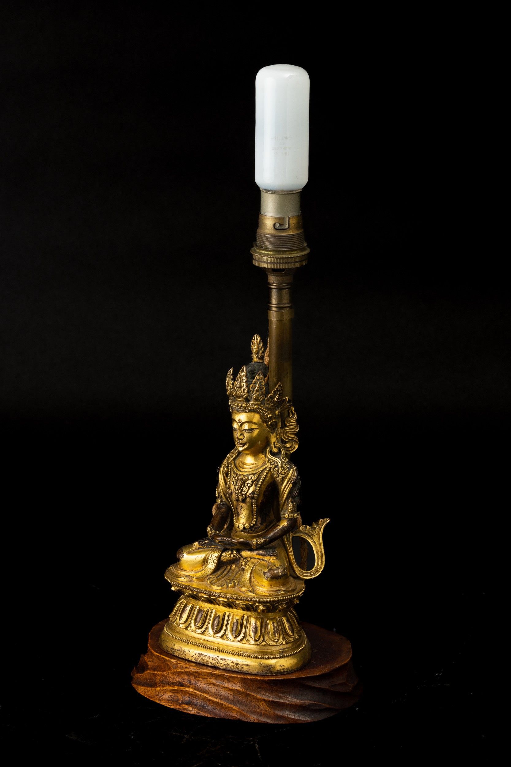 Figura di Buddha Amitayus seduto su doppio fiore di loto in bronzo dorato, Cina, [..]