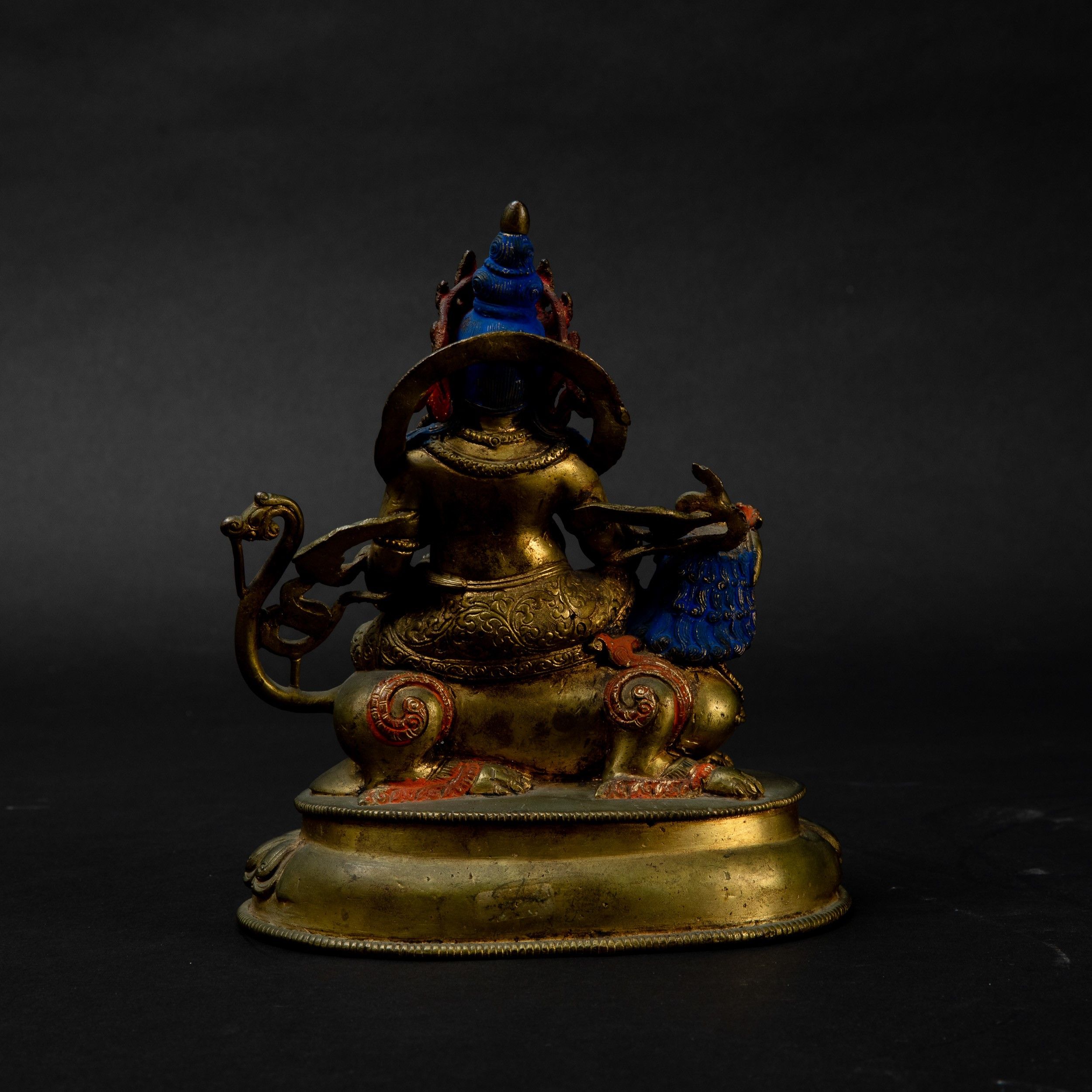 Figura di Sita-Jambhala seduto su drago in bronzo dorato con tracce di policromia, [..]