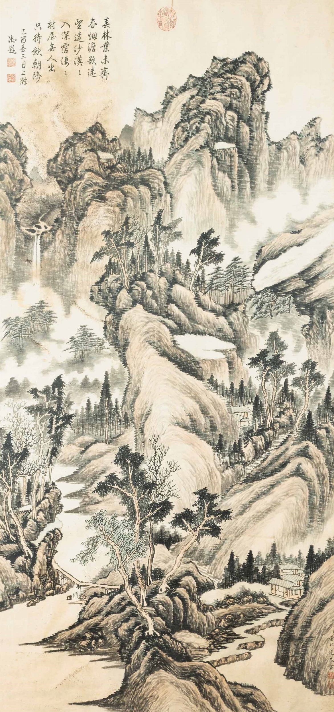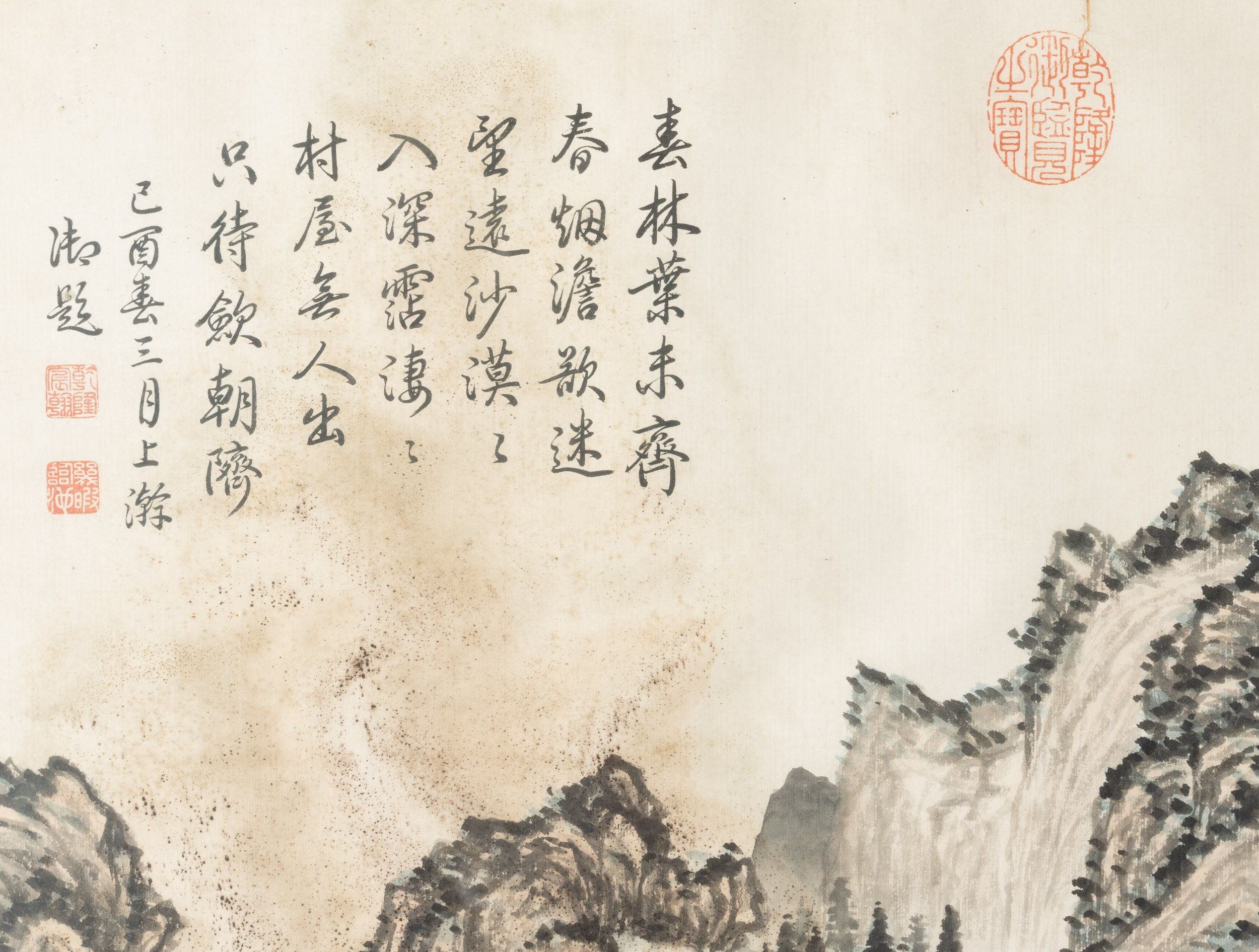 Grande dipinto su carta raffigurante paesaggio montano con iscrizione, Cina, Dinastia [..]