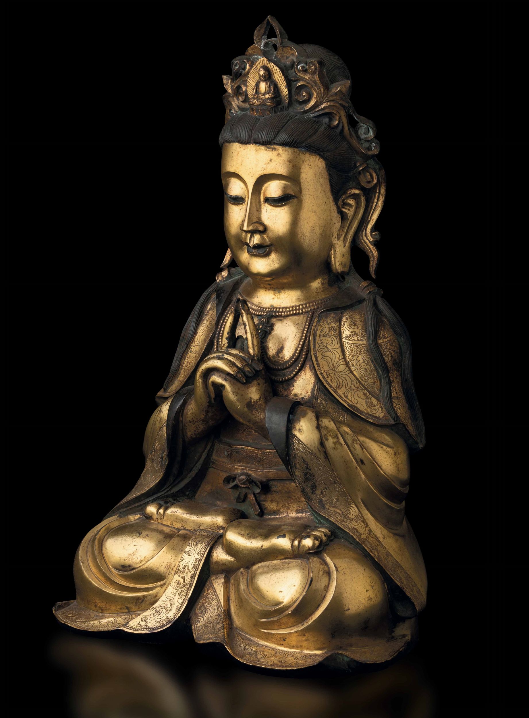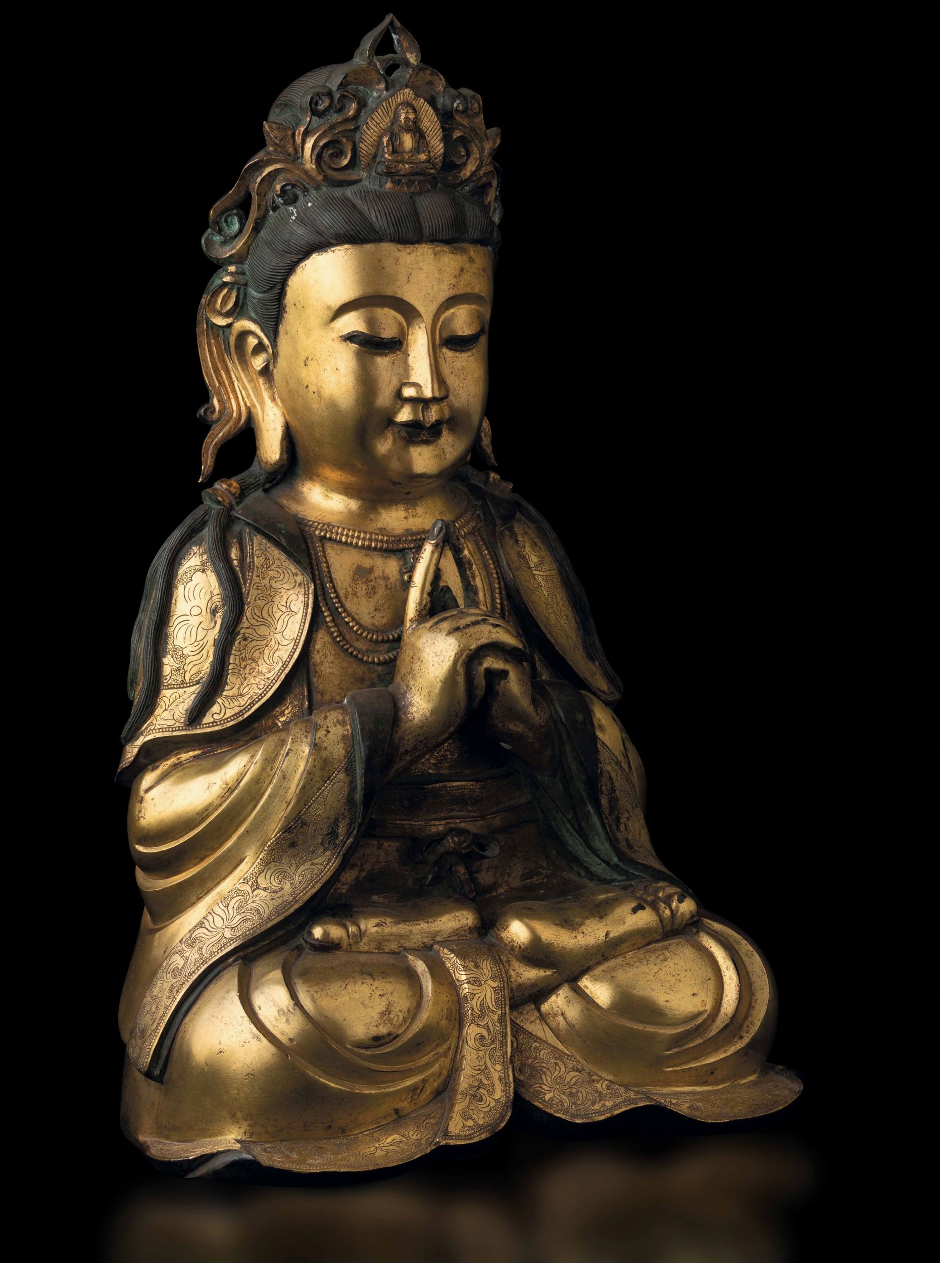 Grande figura di Guanyin incoronata in bronzo parzialmente dorato, Cina, XX seco [..]