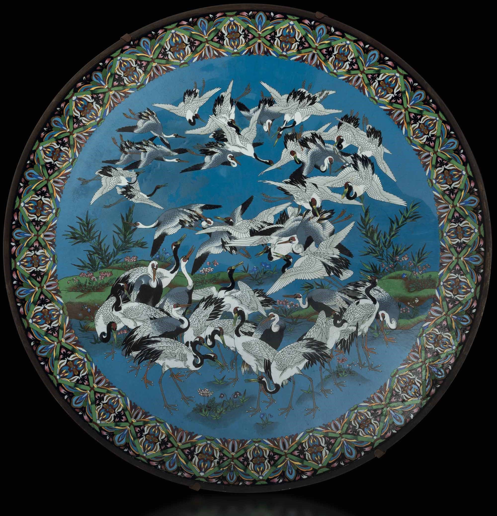 Grande piatto in smalto con figure di aironi entro paesaggio, Giappone, periodo [..]