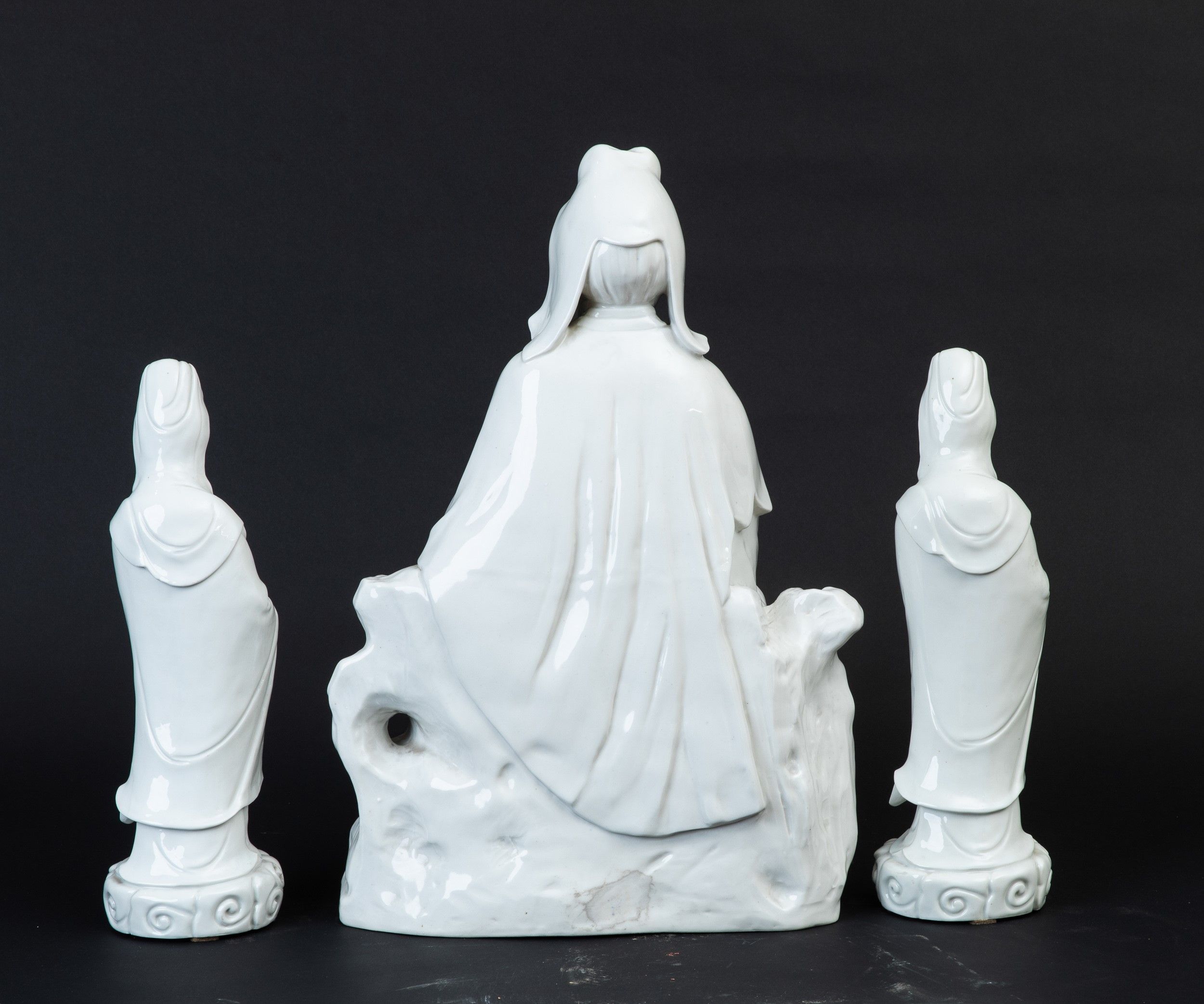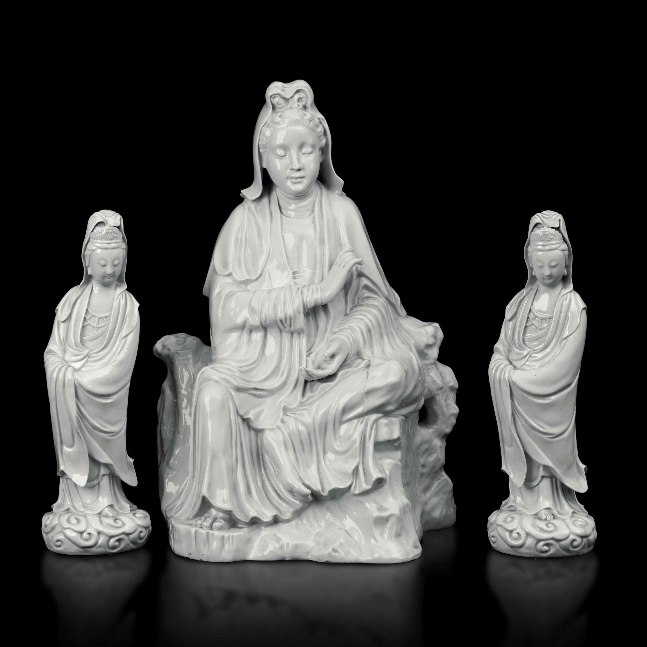 Lotto composto da tre figure di Guanyin in porcellana Blanc de Chine, Cina, Dinastia [..]