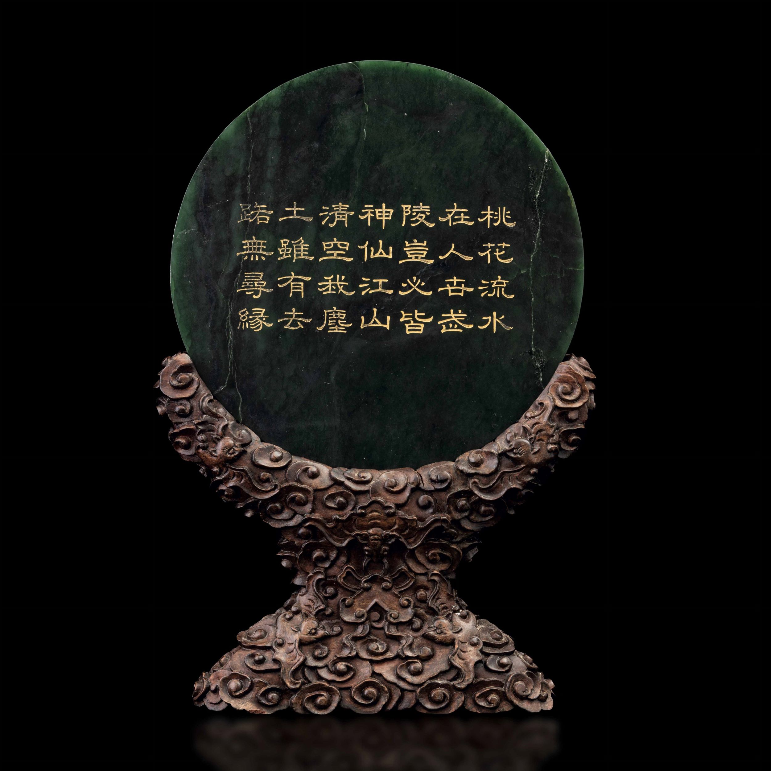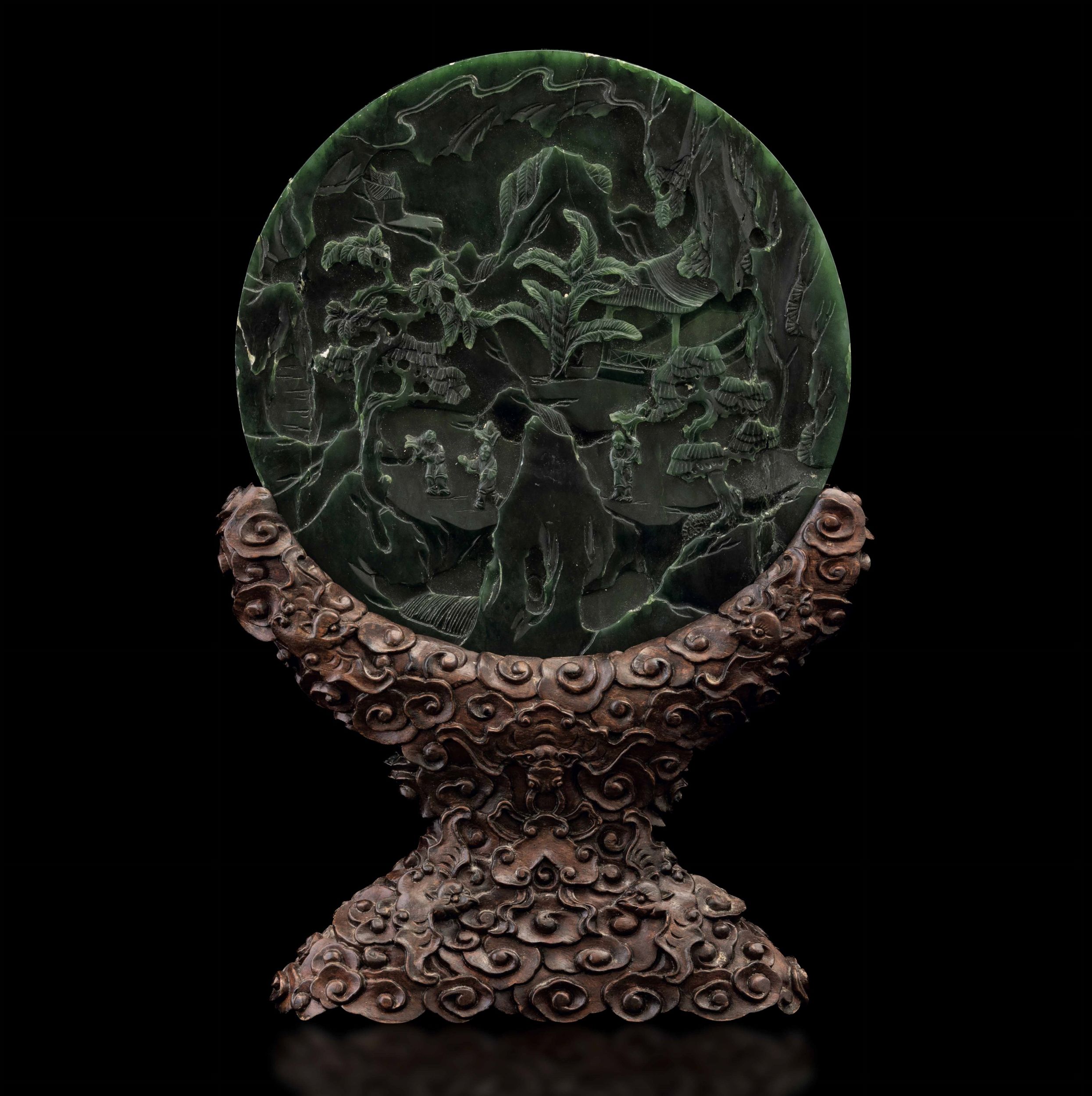 Paravento da tavolo con placca circolare scolpita in giada spinacio raffigurante [..]