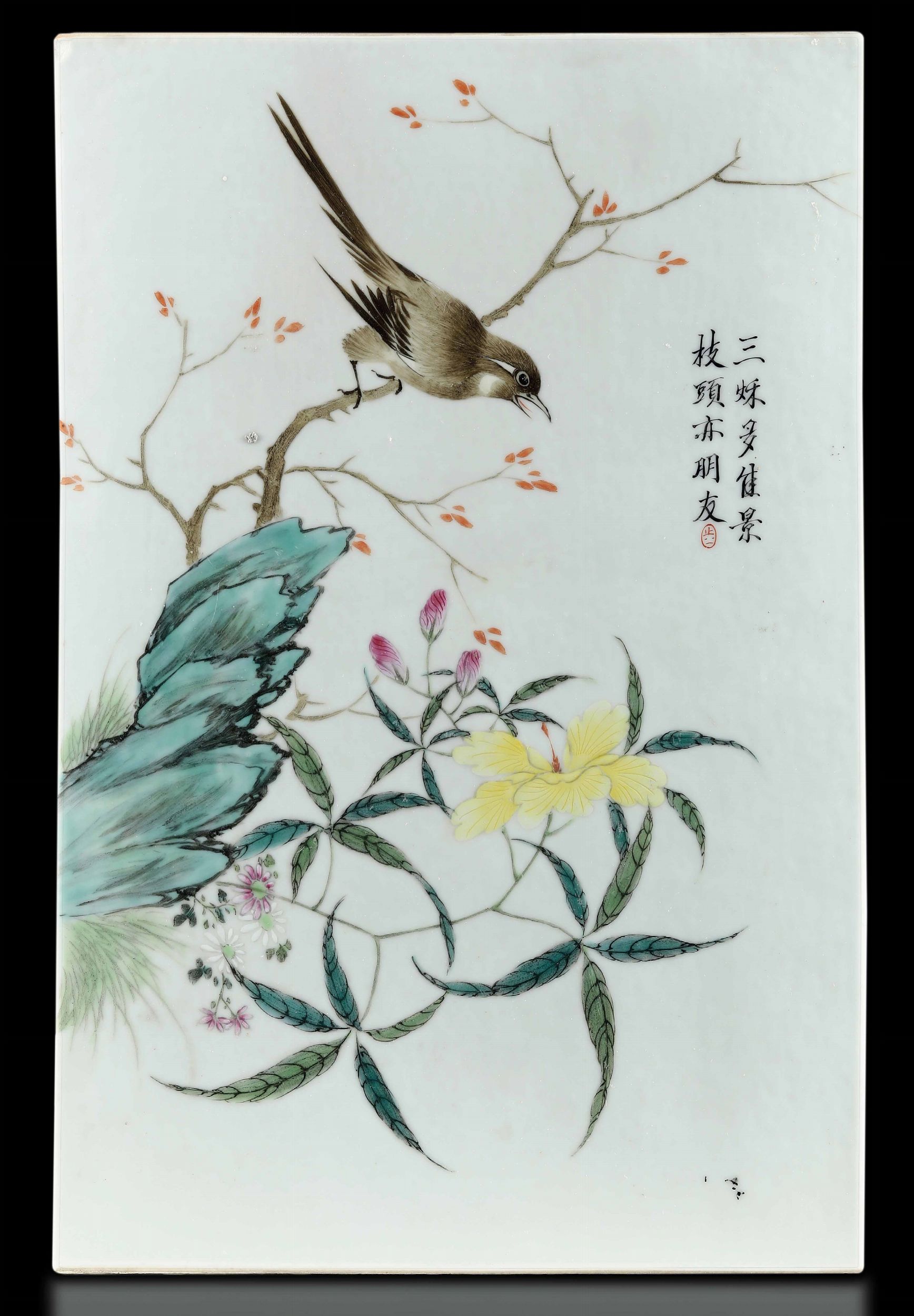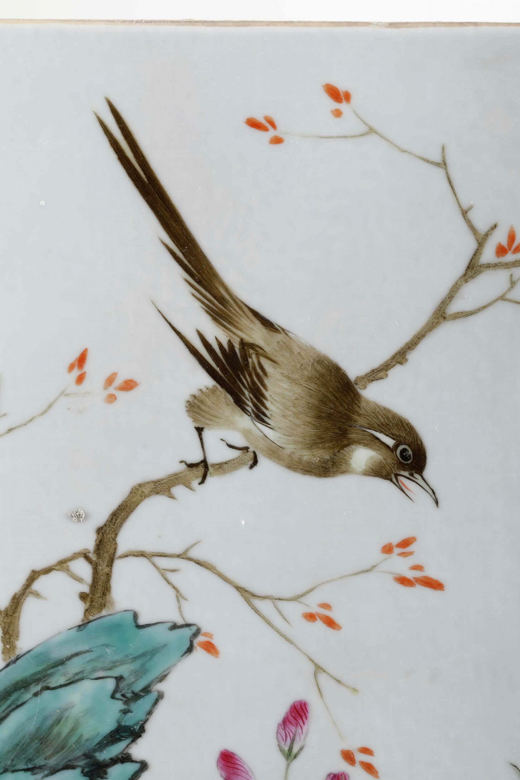 Placca in porcellana raffigurante uccellino tra i rami, fiori e iscrizione, Cina, [..]