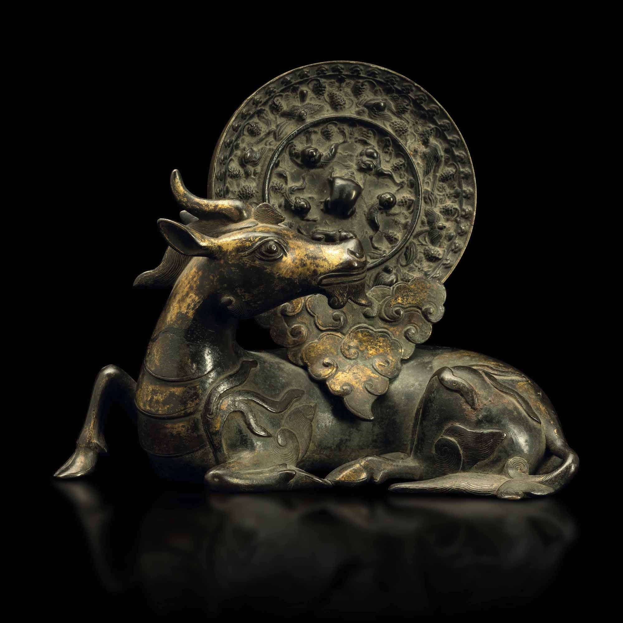 Portaspecchio in bronzo parzialmente dorato a forma di bufalo e placca da specchio [..]
