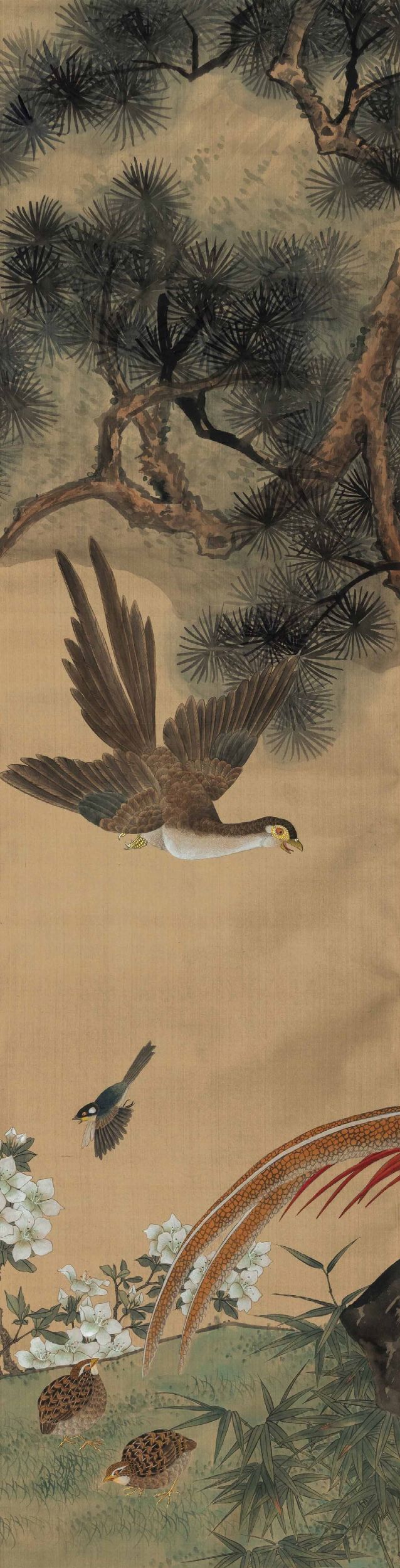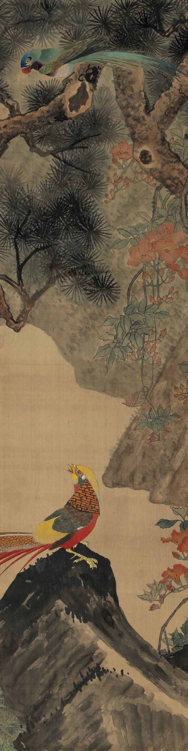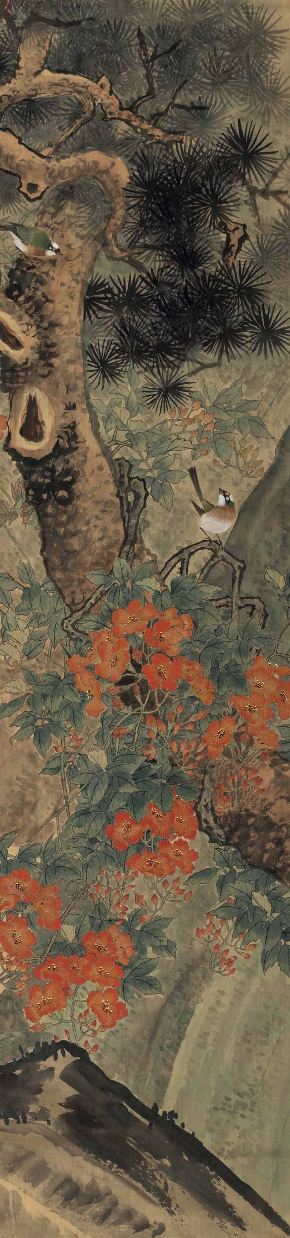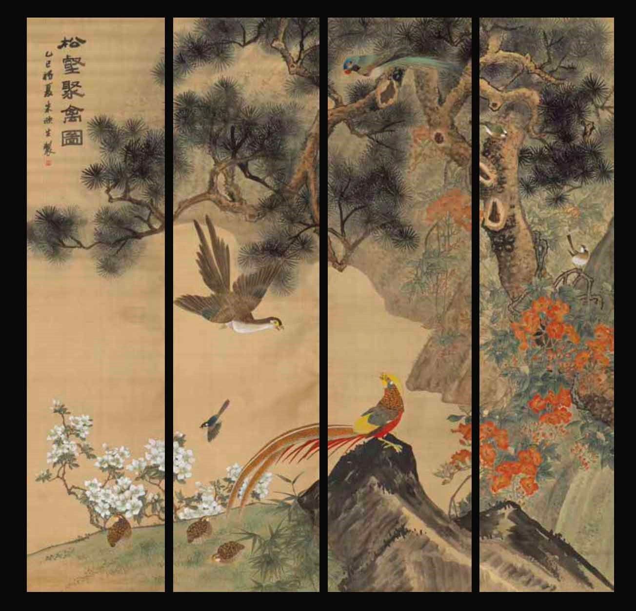 Quattro dipinti su seta raffiguranti uccellini tra rami in fiore e iscrizioni, Cina, [..]