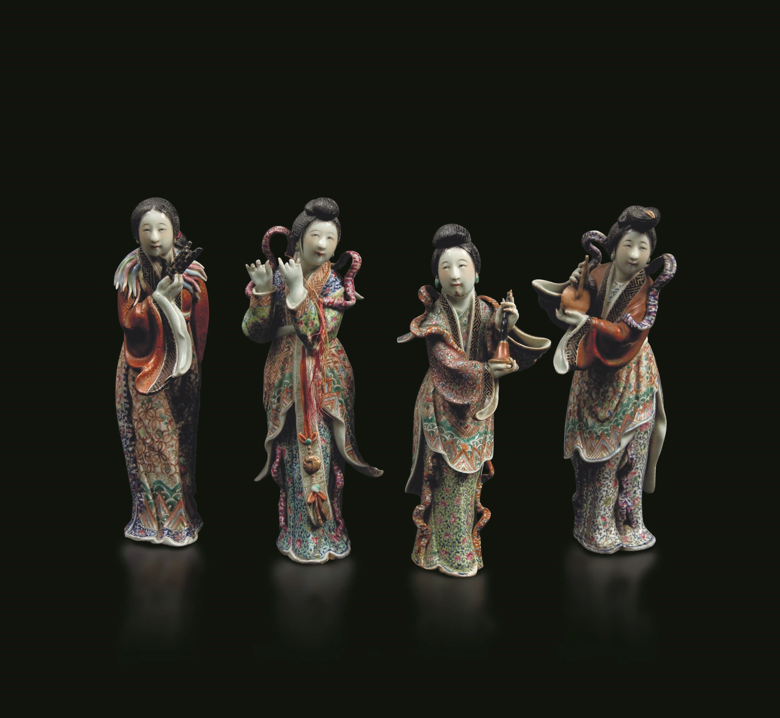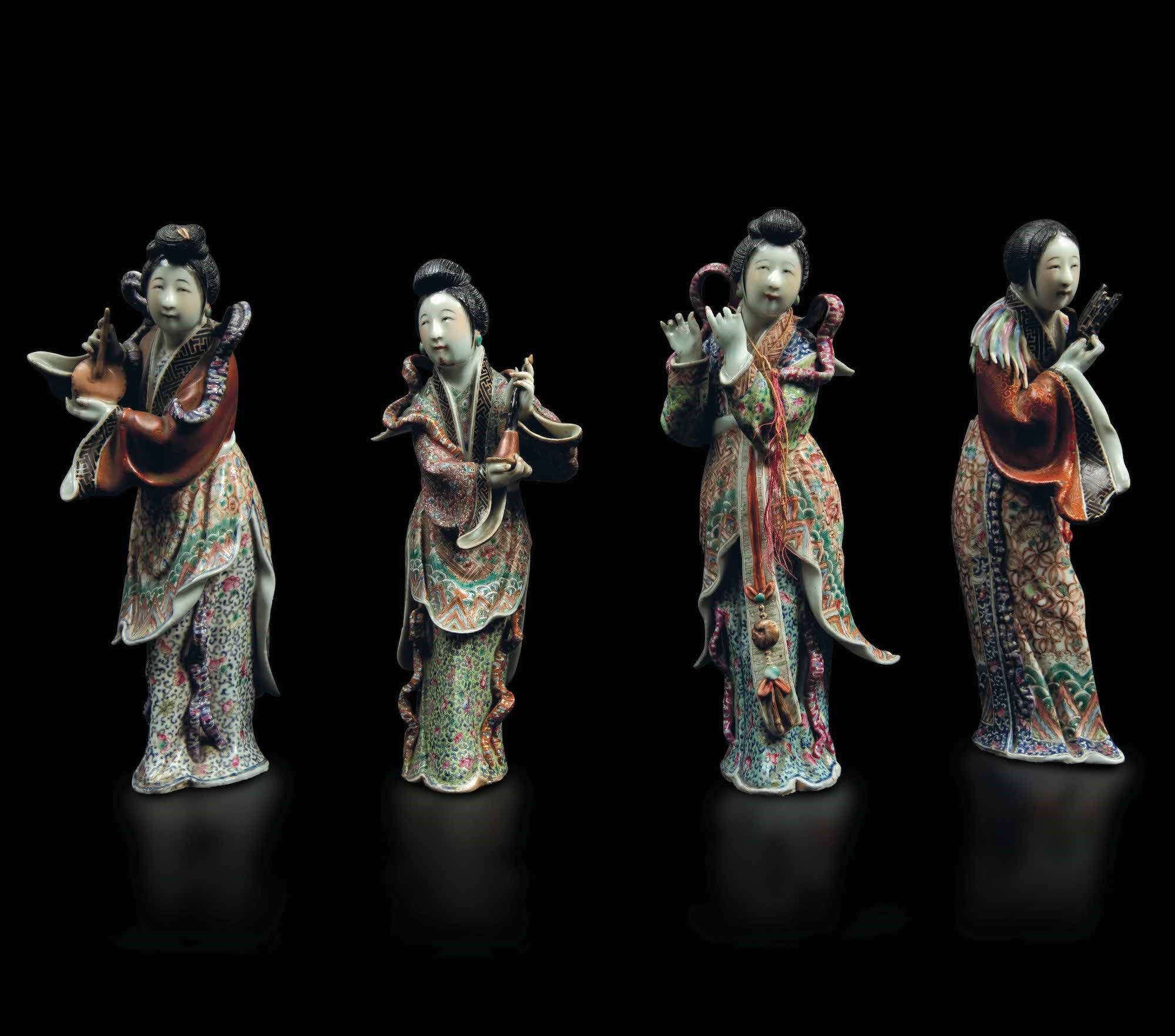 Quattro fanciulle con strumenti musicali in porcellana a smalti policromi, Cina, [..]