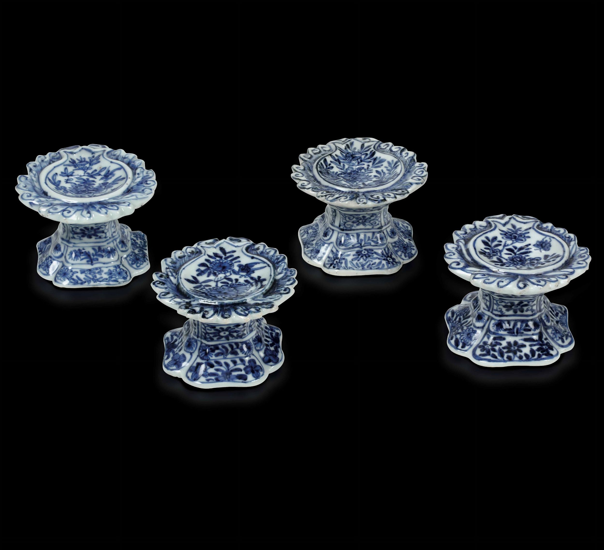 Quattro saliere in porcellana bianca e blu con decori floreali, Cina, Dinastia Qing, [..]