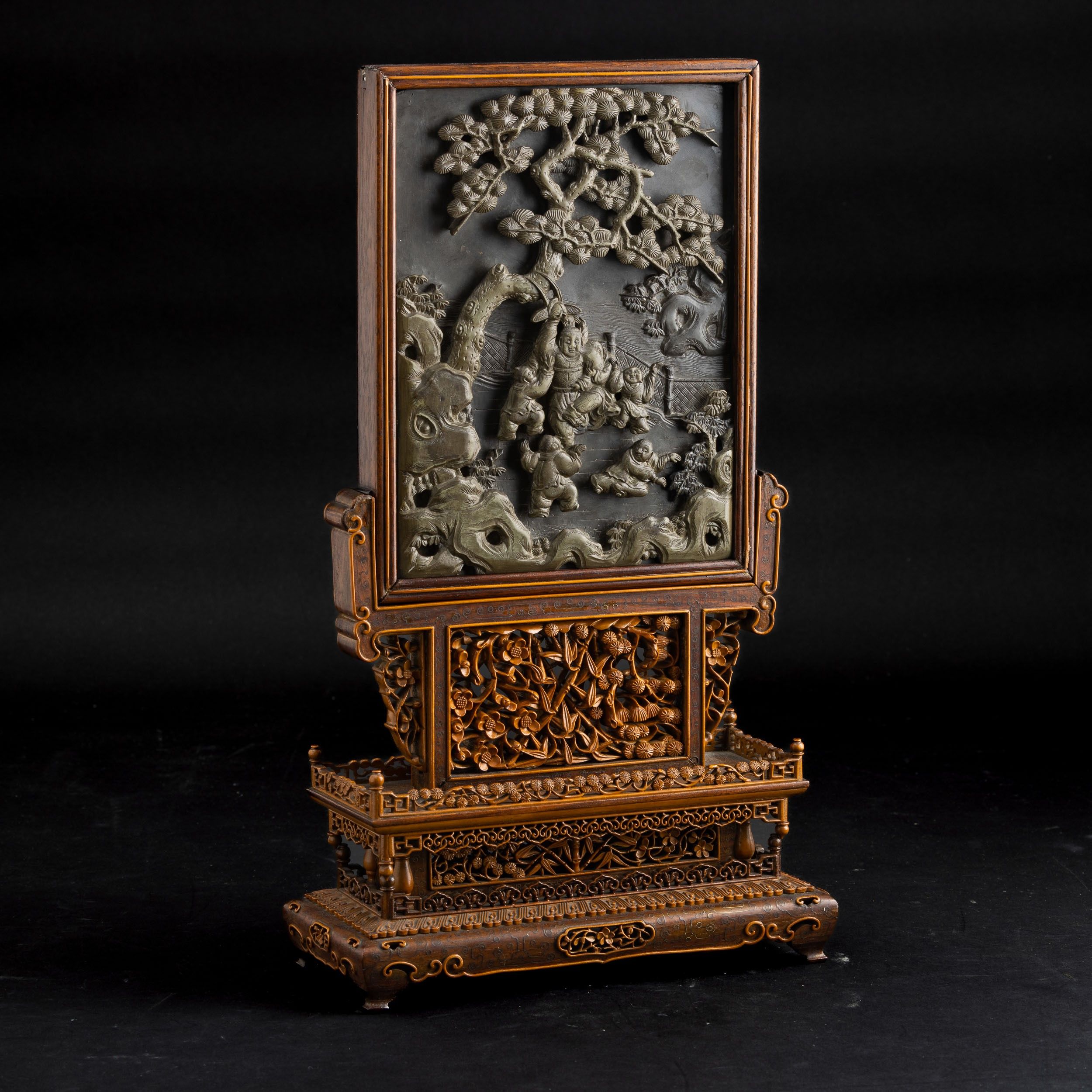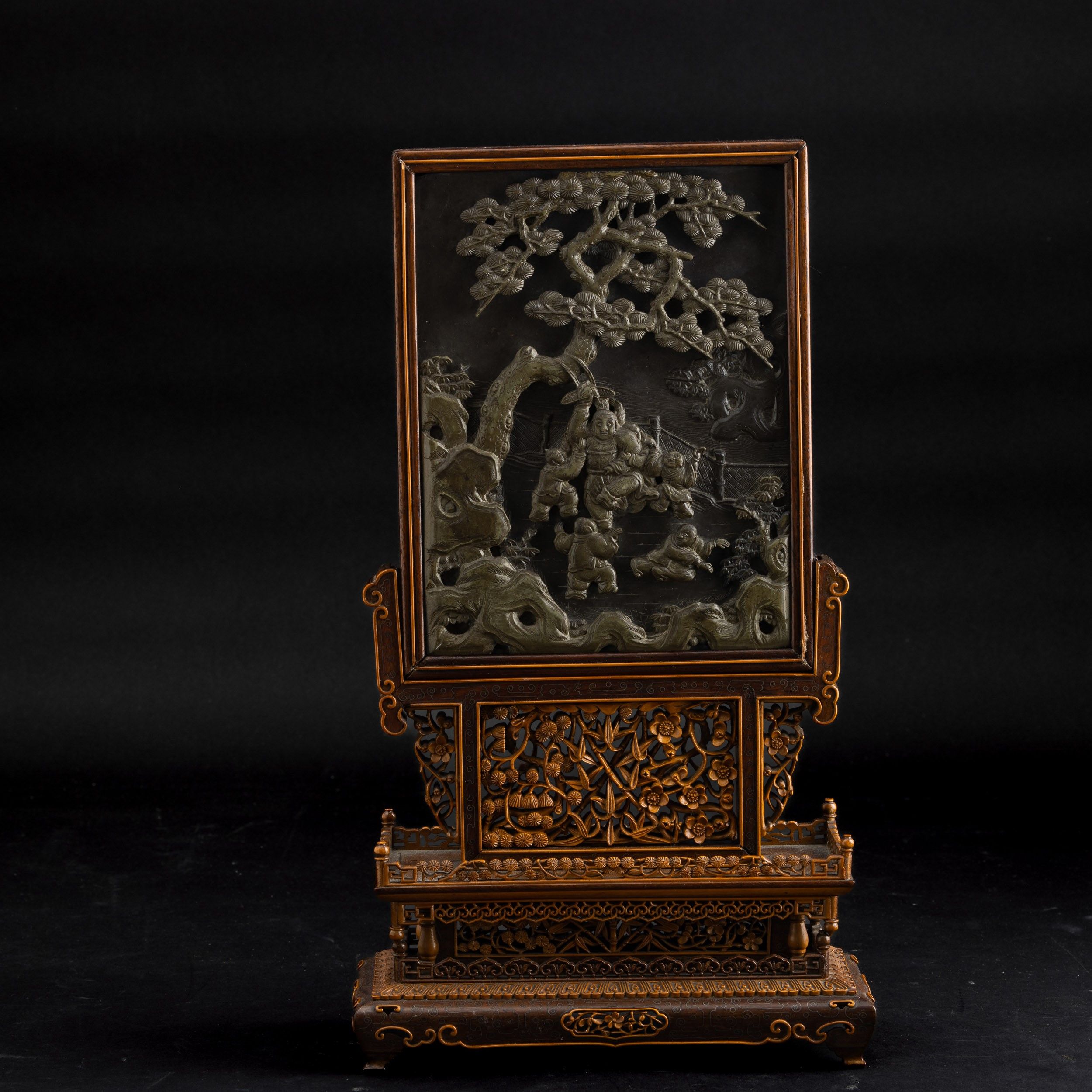 Rarissimo paravento da tavolo scolpito in legno con placca in pietra da inchiostro [..]