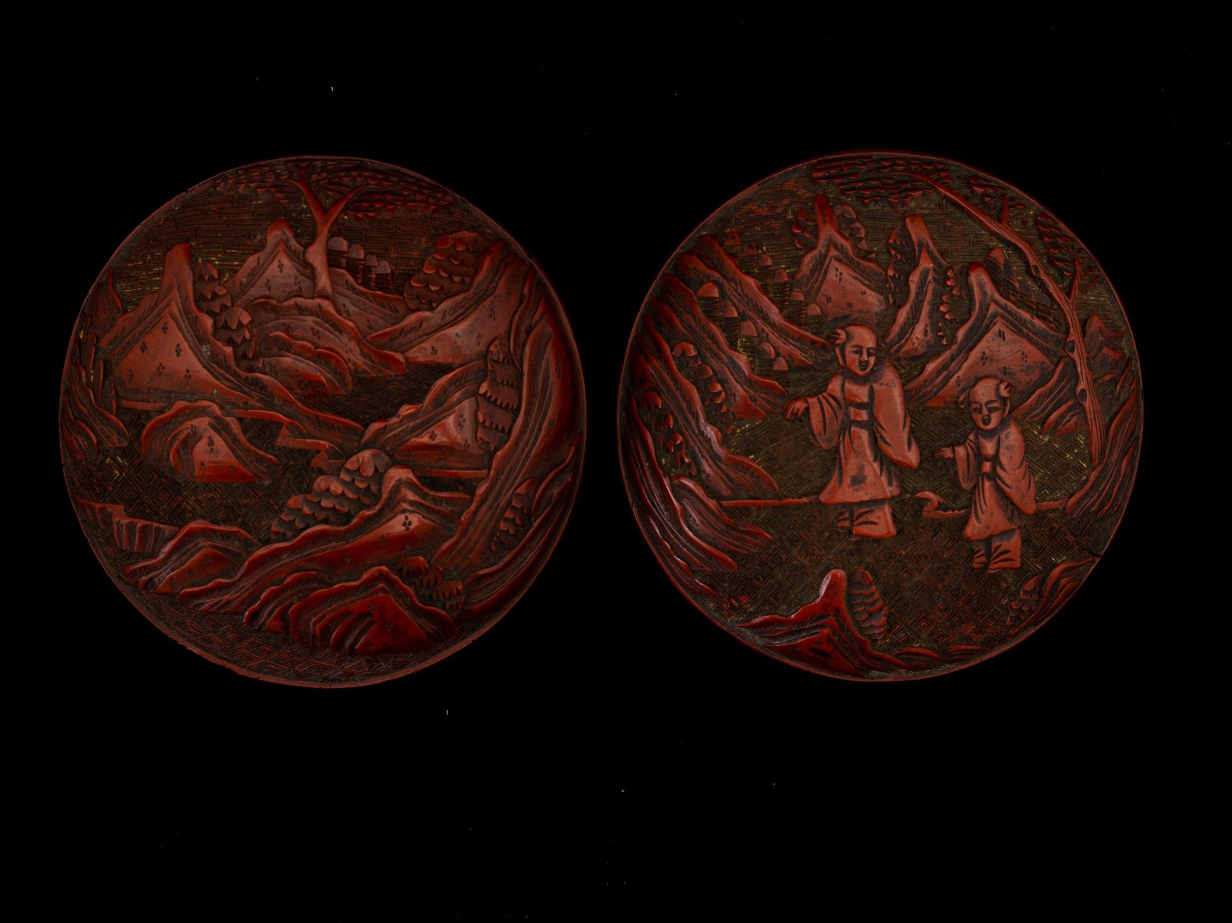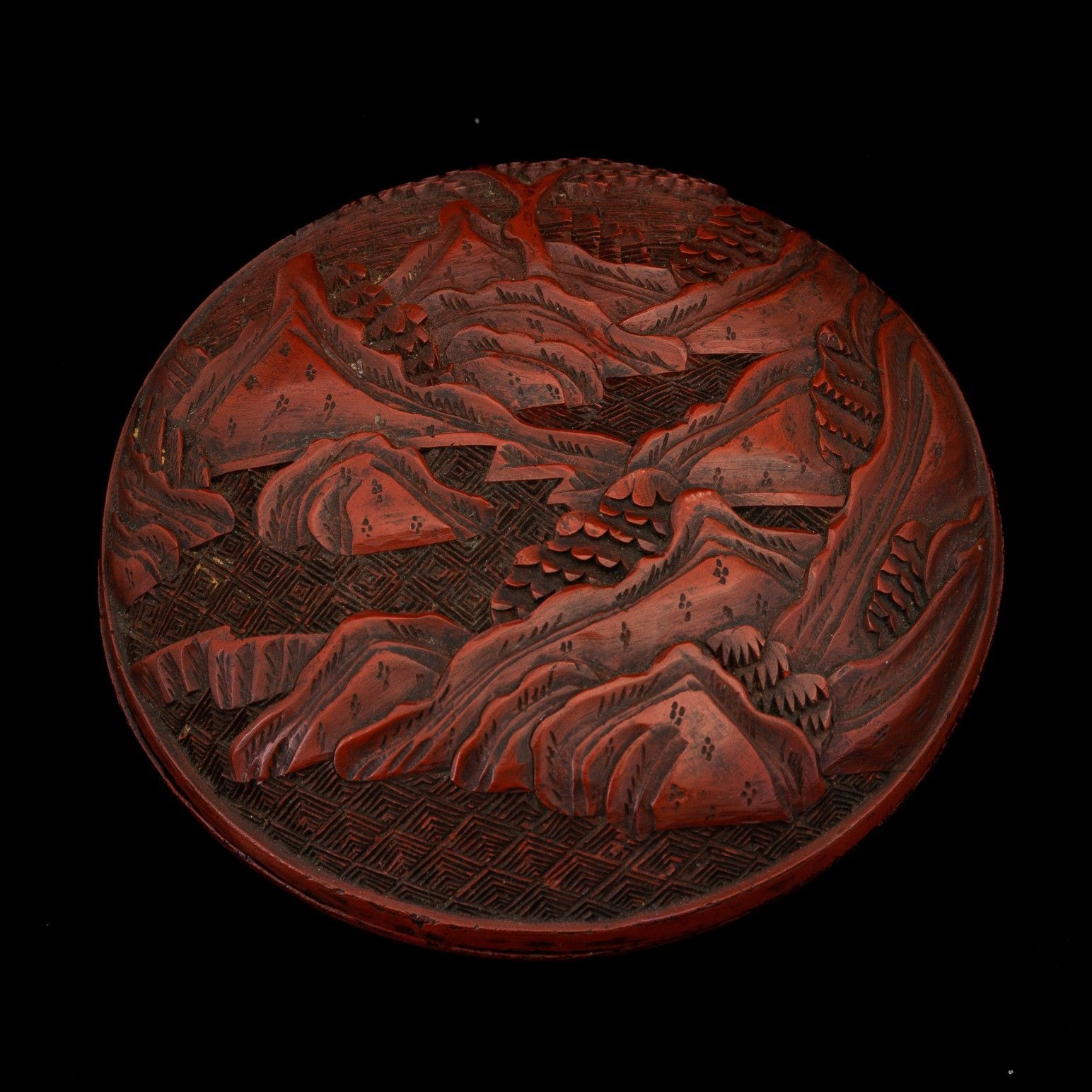 Scatola circolare in lacca rossa con figure di saggi entro paesaggio, Cina, Dinastia [..]