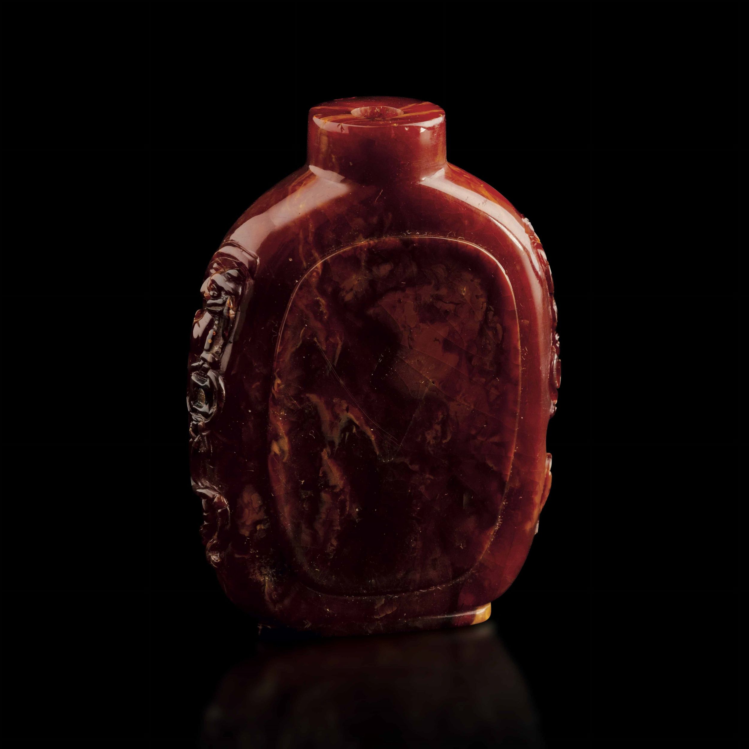 Snuff bottle in ambra con decori naturalistici a rilievo, Cina, Dinastia Qing, XIX [..]
