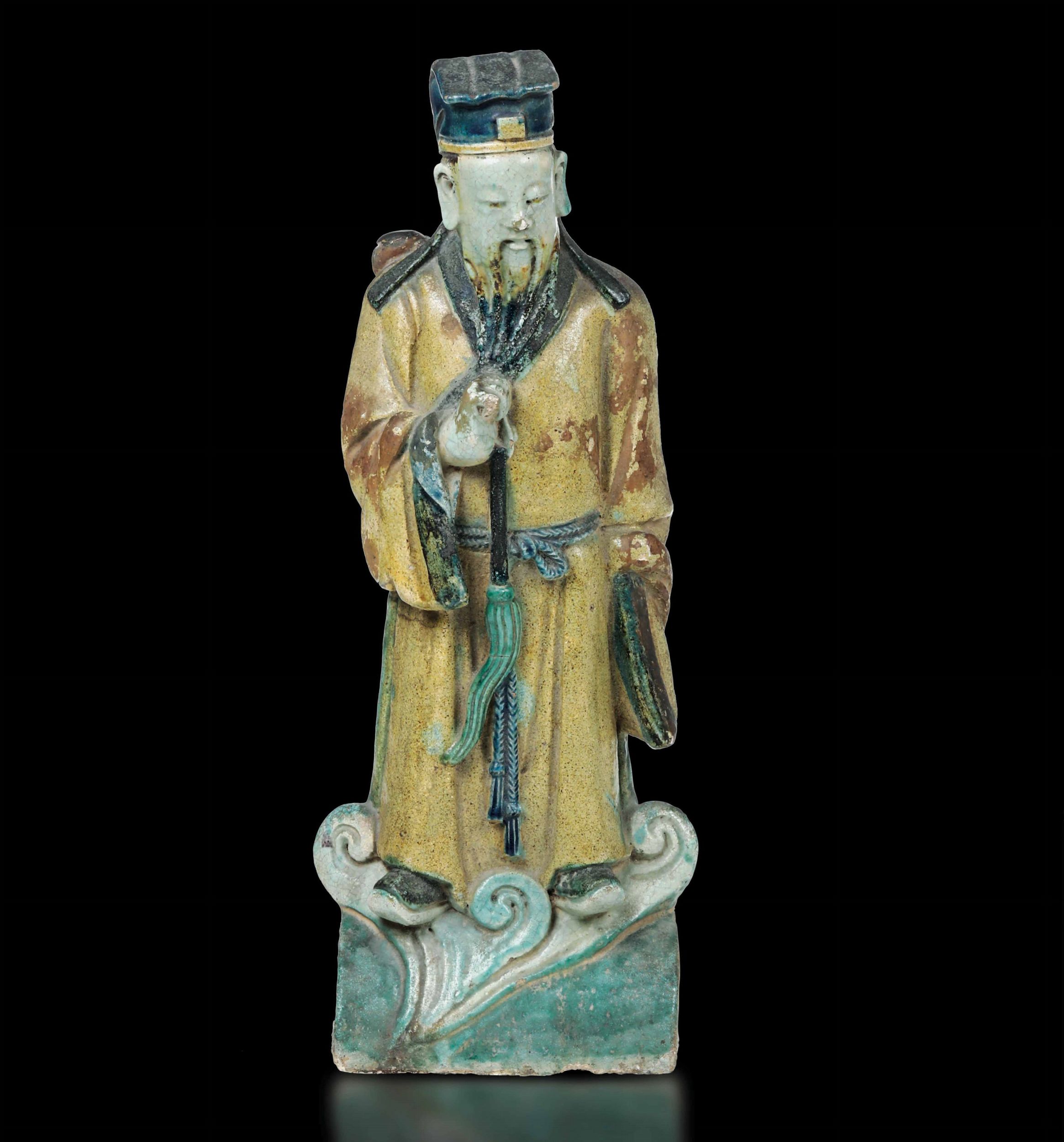 Tegola con figura di saggio stante in terracotta invetriata, Cina, Dinastia Ming, [..]