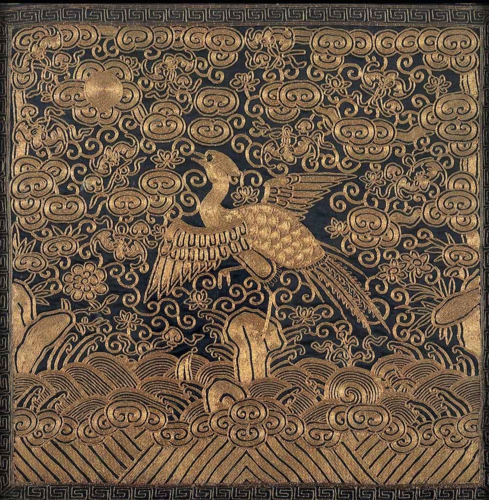 Tessuto in seta finemente ricamato raffigurante airone in volo, Cina, Dinastia Qing, [..]