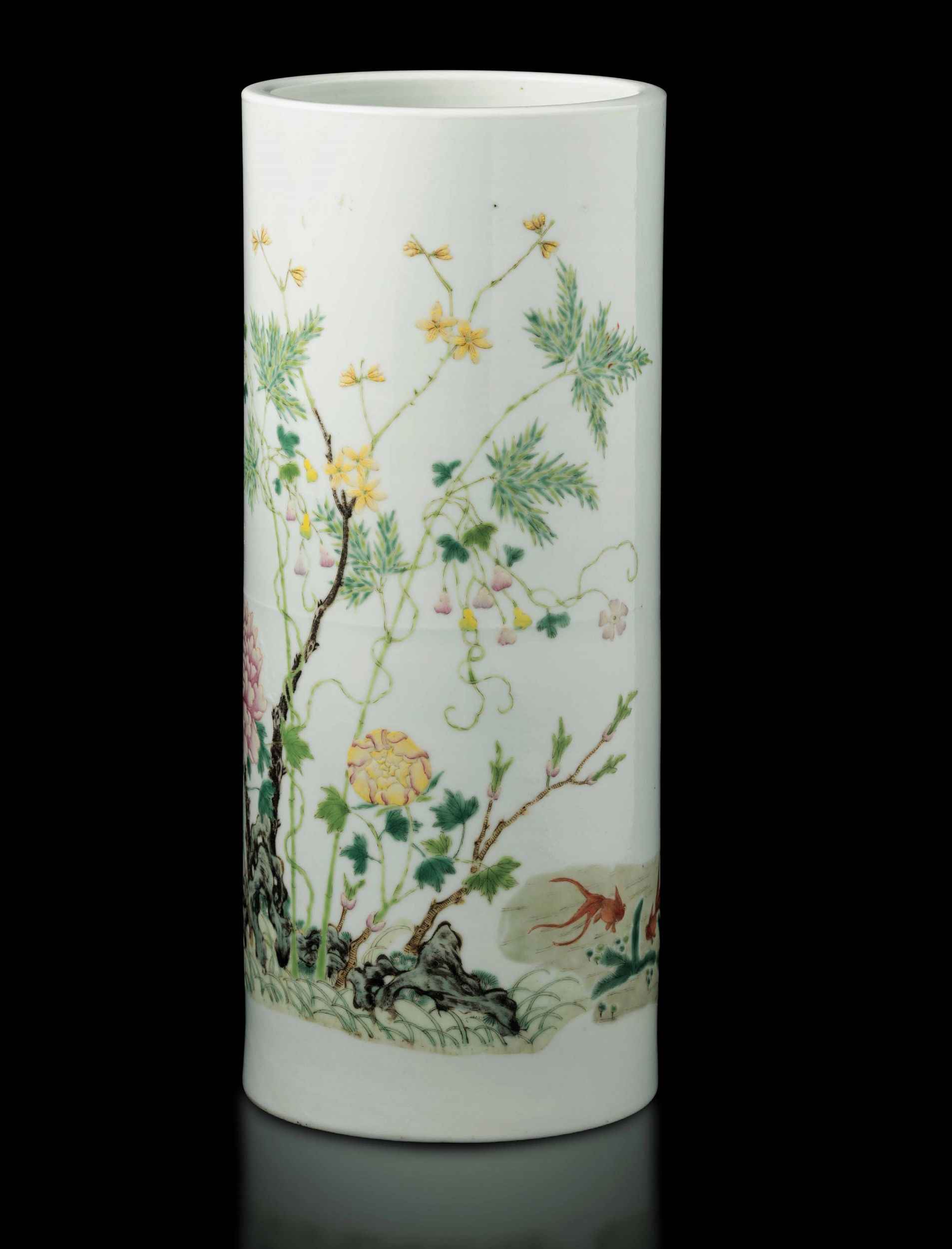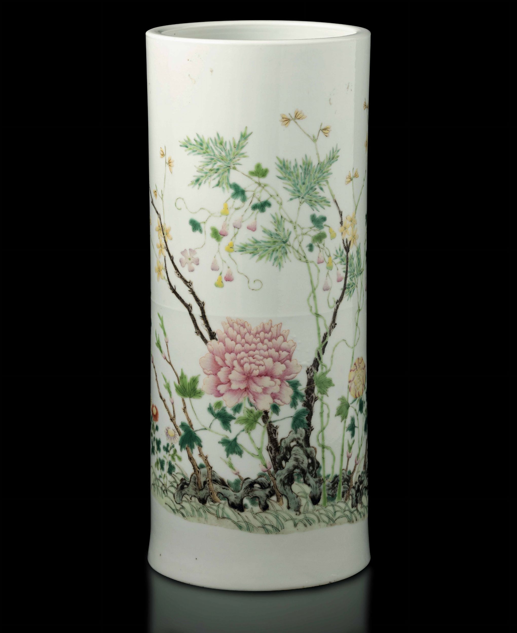 Vaso cilindrico in porcellana con decoro naturalistico e peonie in fiore, Cina, [..]