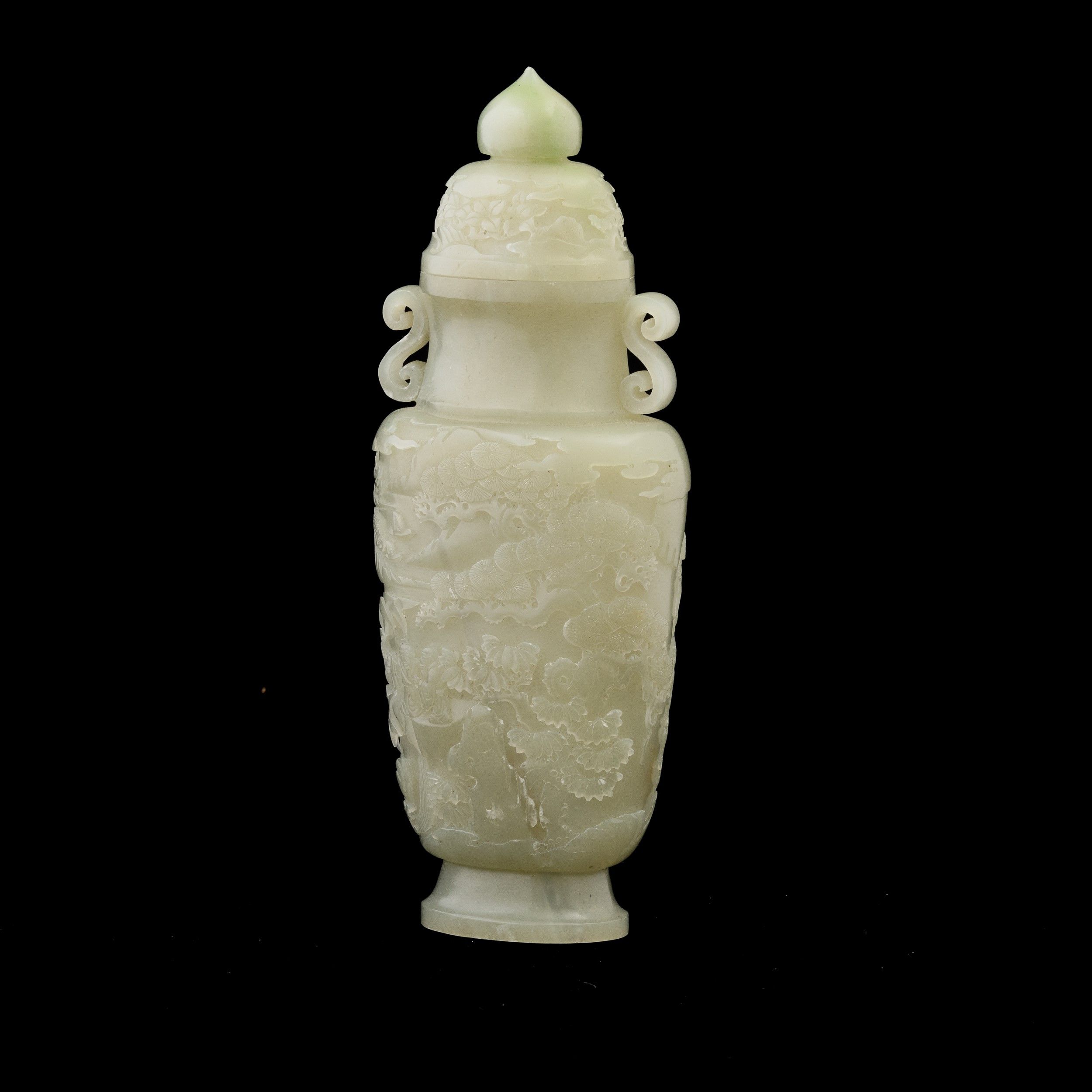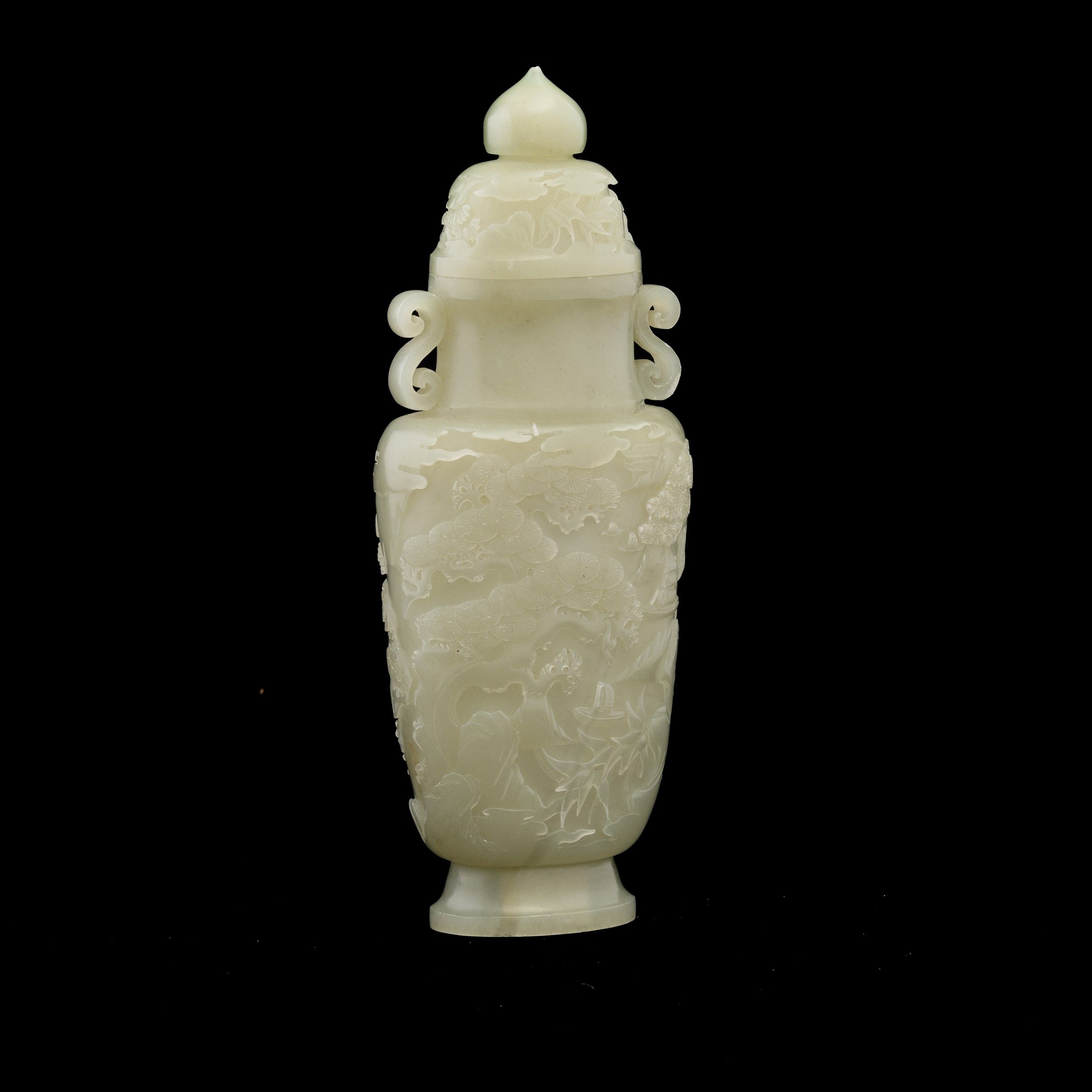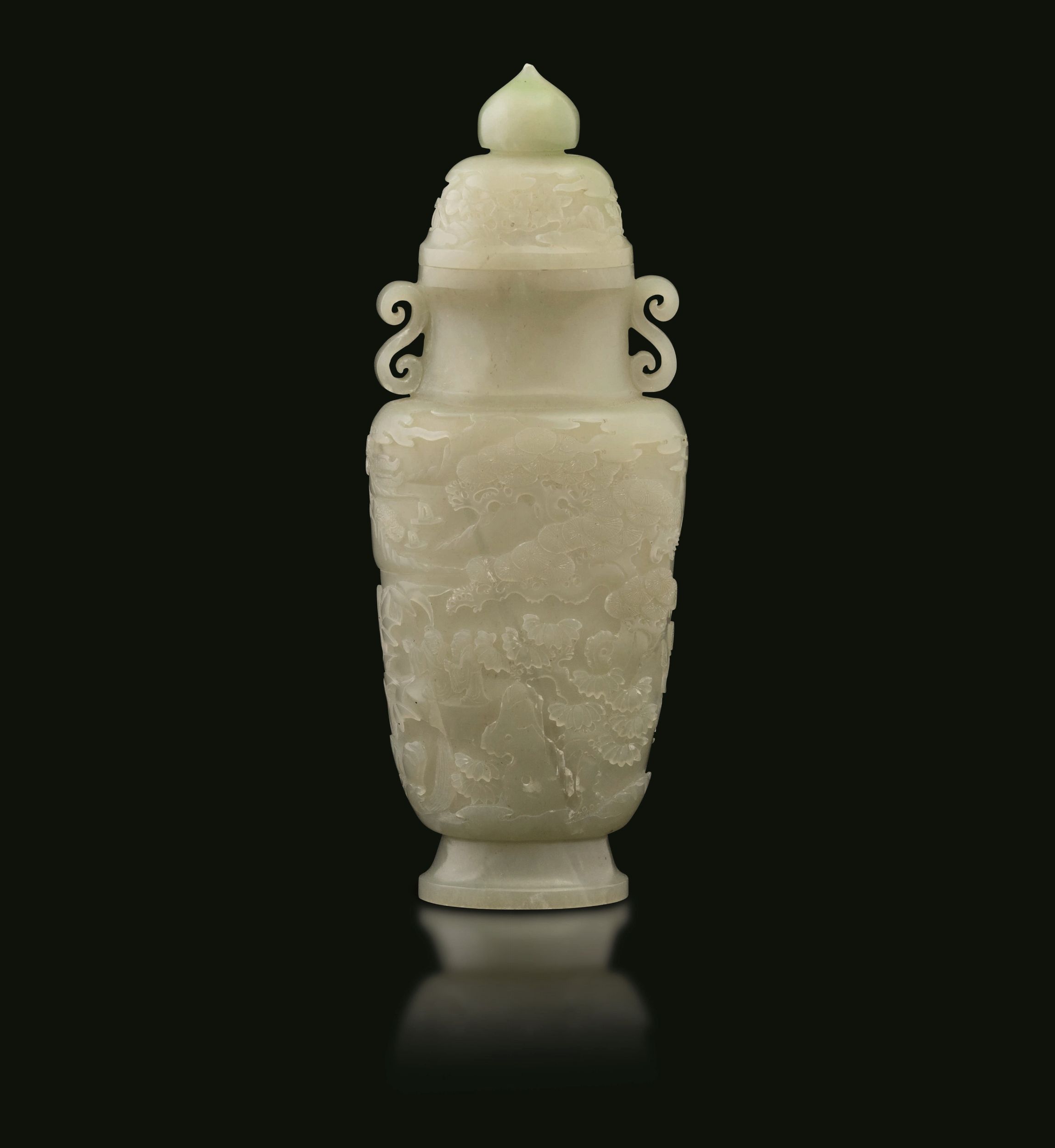 Vaso con coperchio scolpito in giada bianca Celadon con decoro di paesaggio, Cina, [..]
