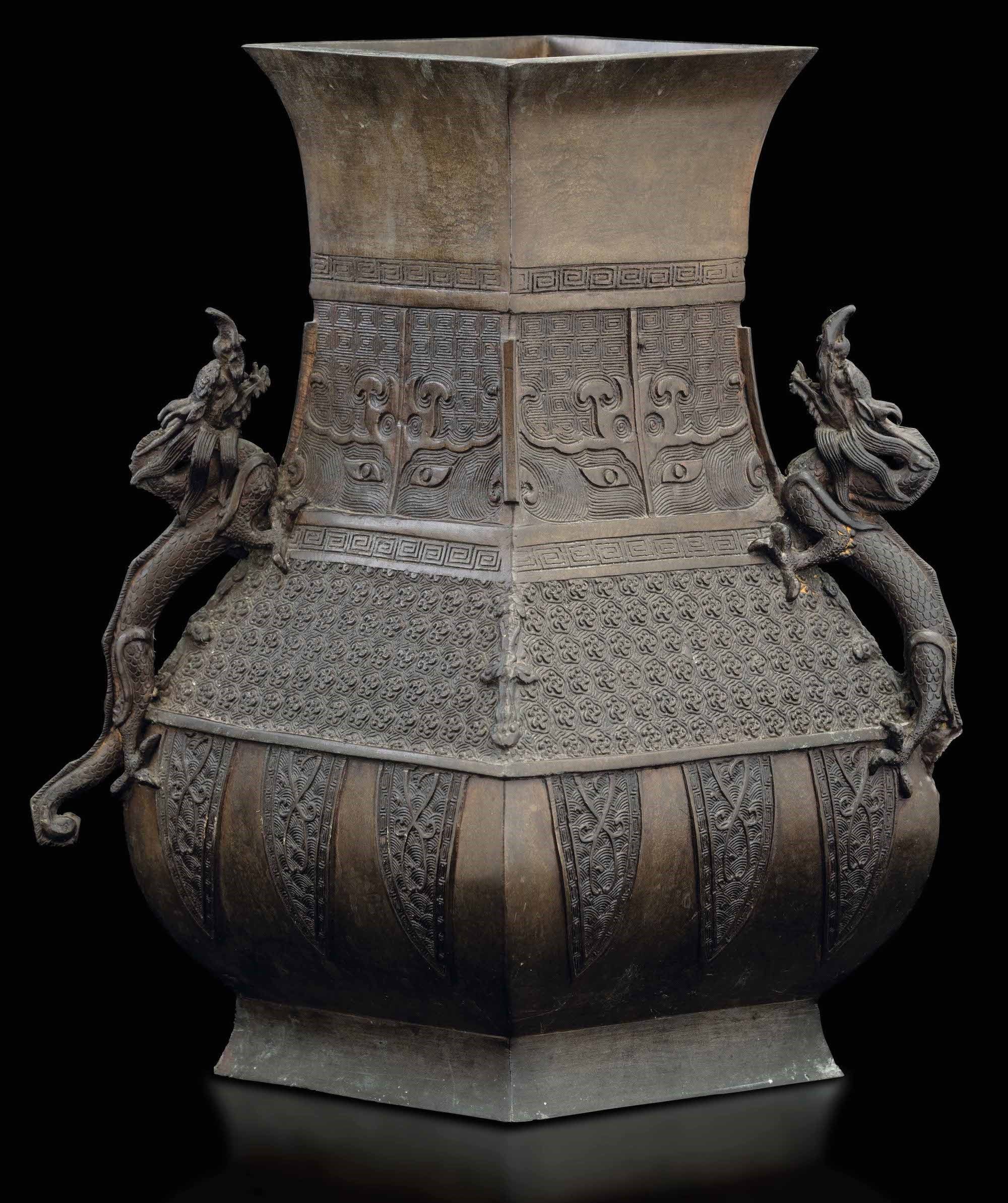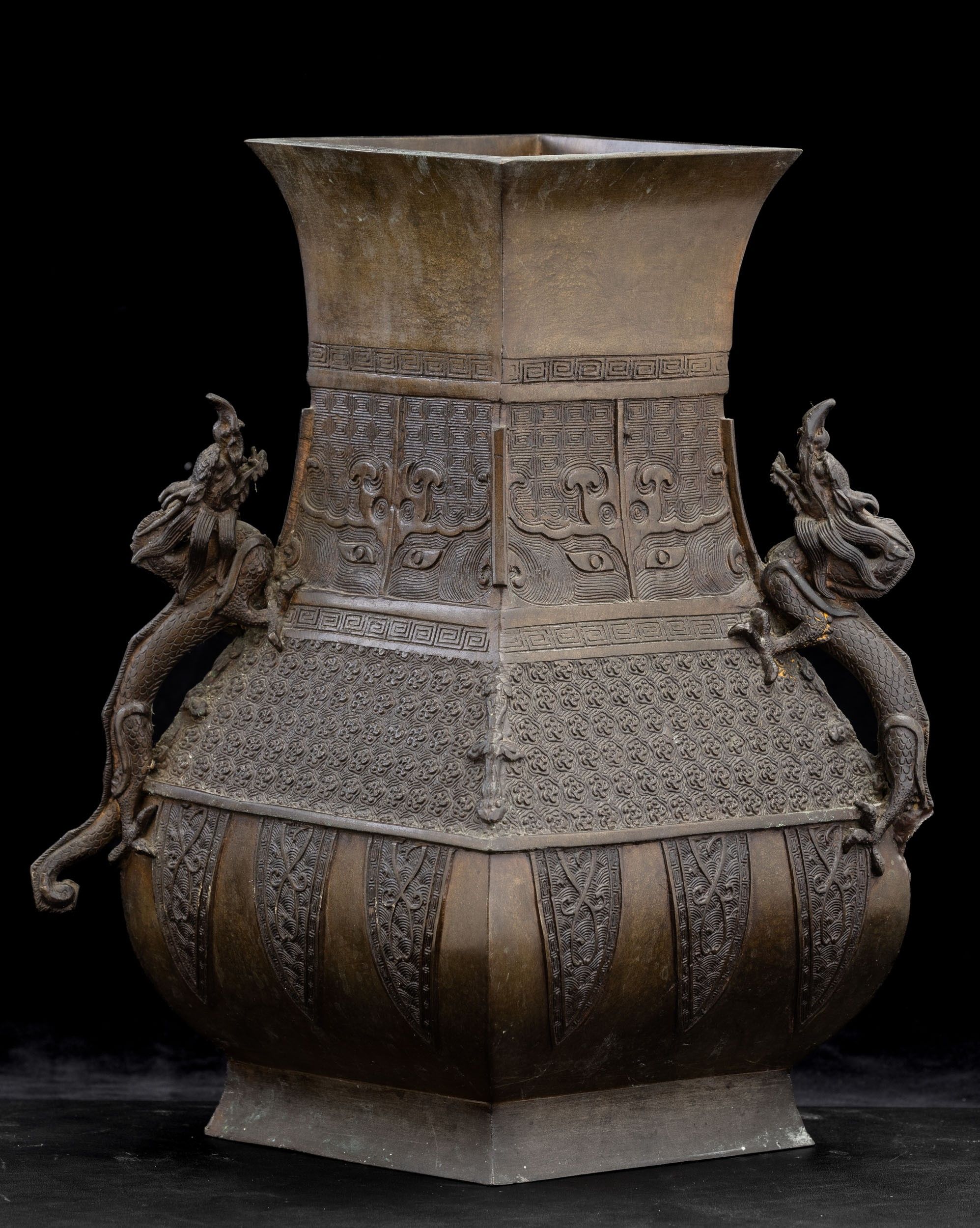 Vaso in bronzo con anse a foggia di draghetto e decori incisi d'ispirazione arcaica, [..]