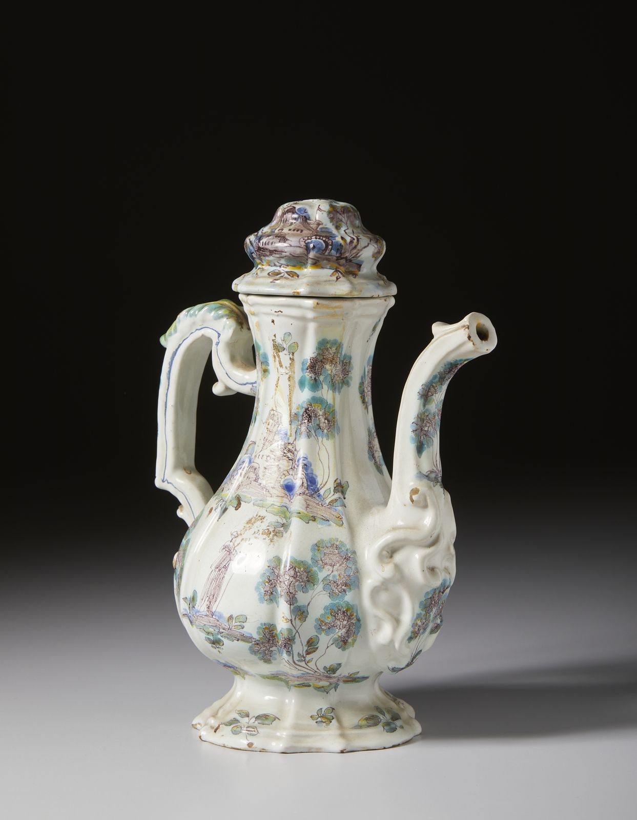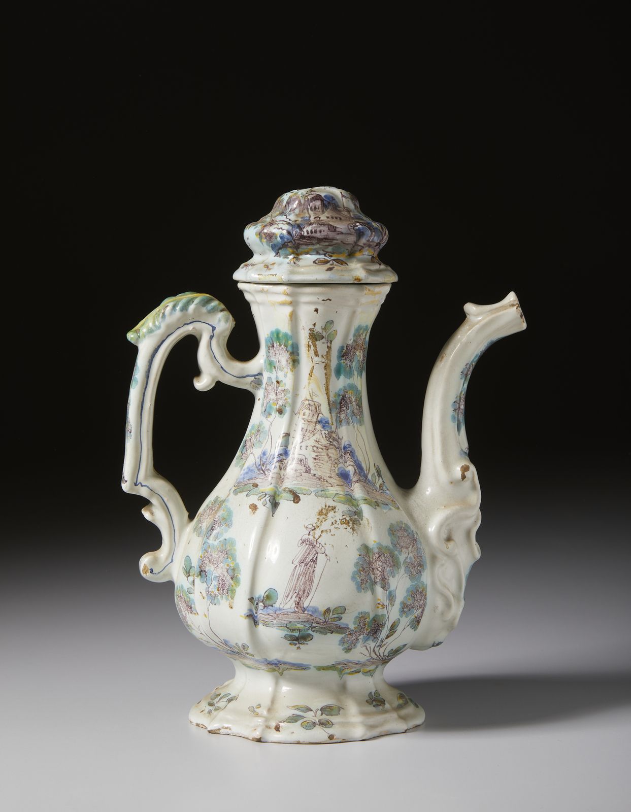 Caffettiera in maiolica con corpo piriforme e costolato, decorato con motivo 'a [..]