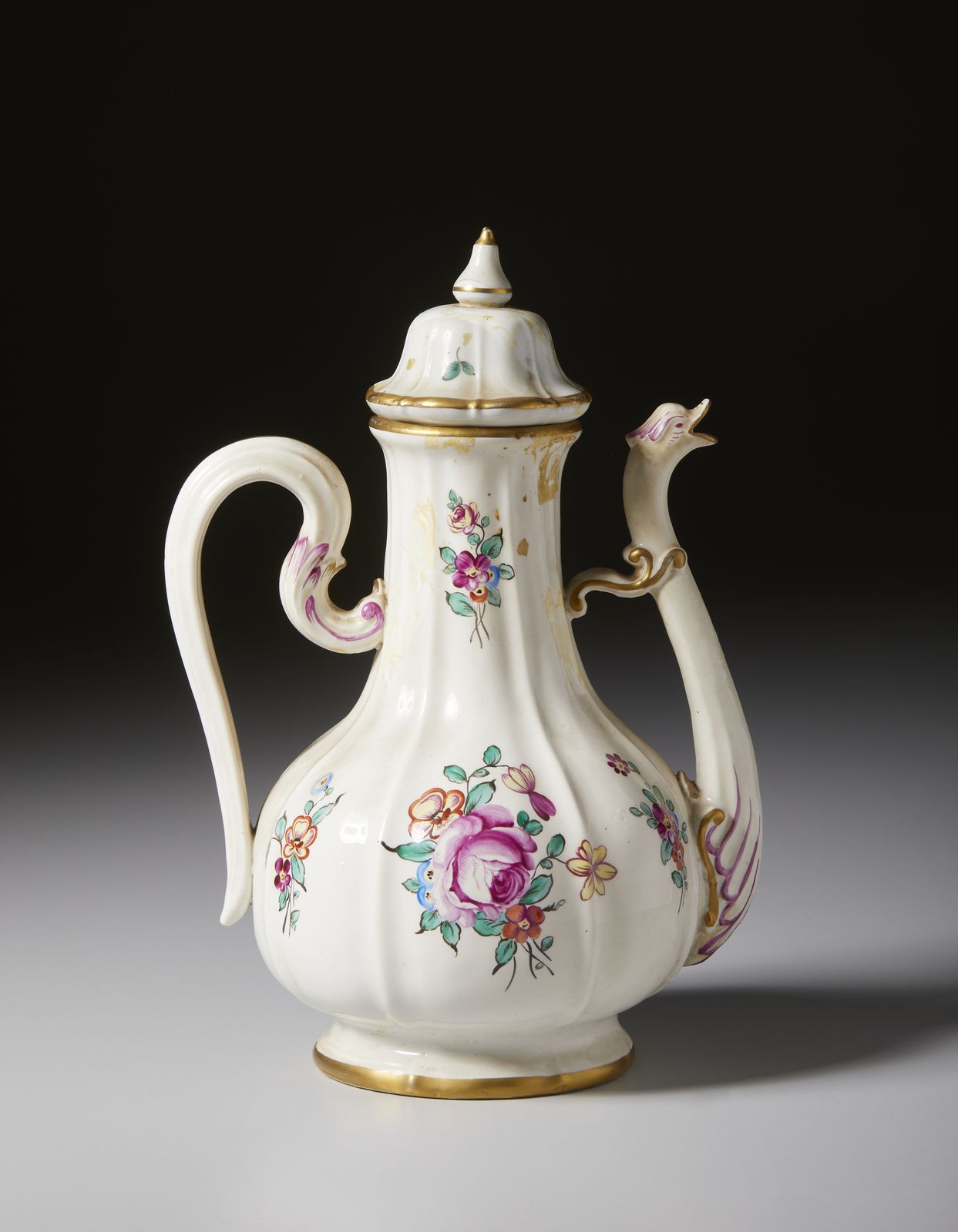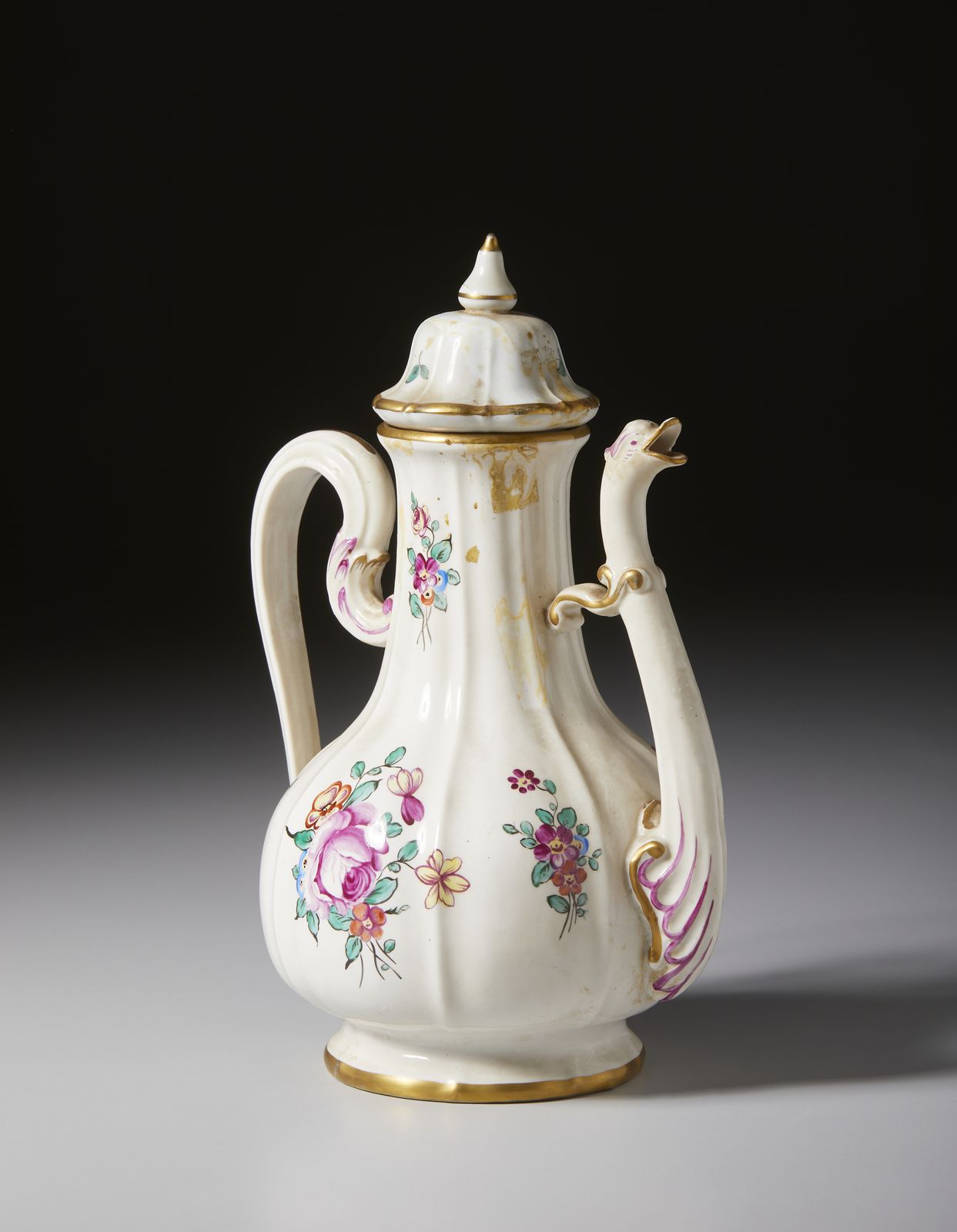 Caffettiera in porcellana dipinta in policromia e oro, corpo piriforme costolato [..]