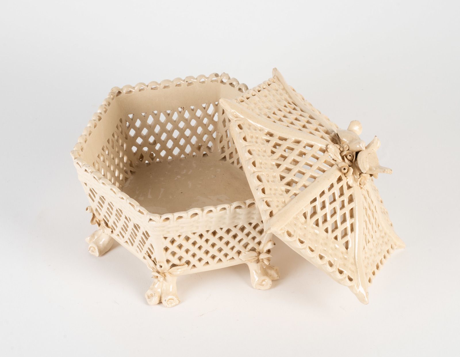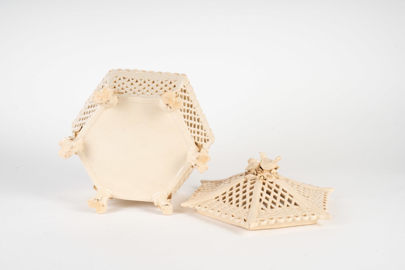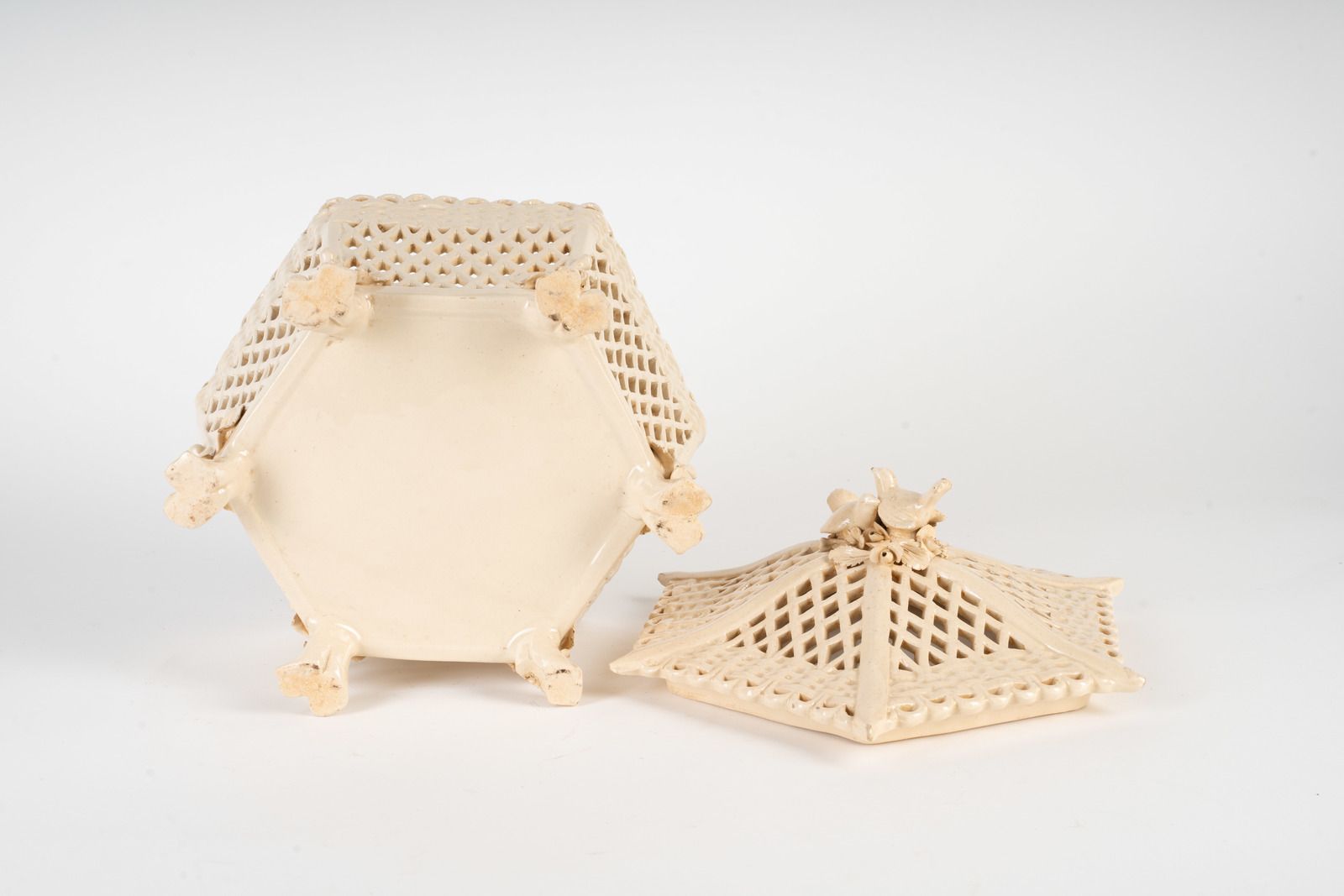 Cofanetto esagonale in terraglia traforata, presa decorata con colombe