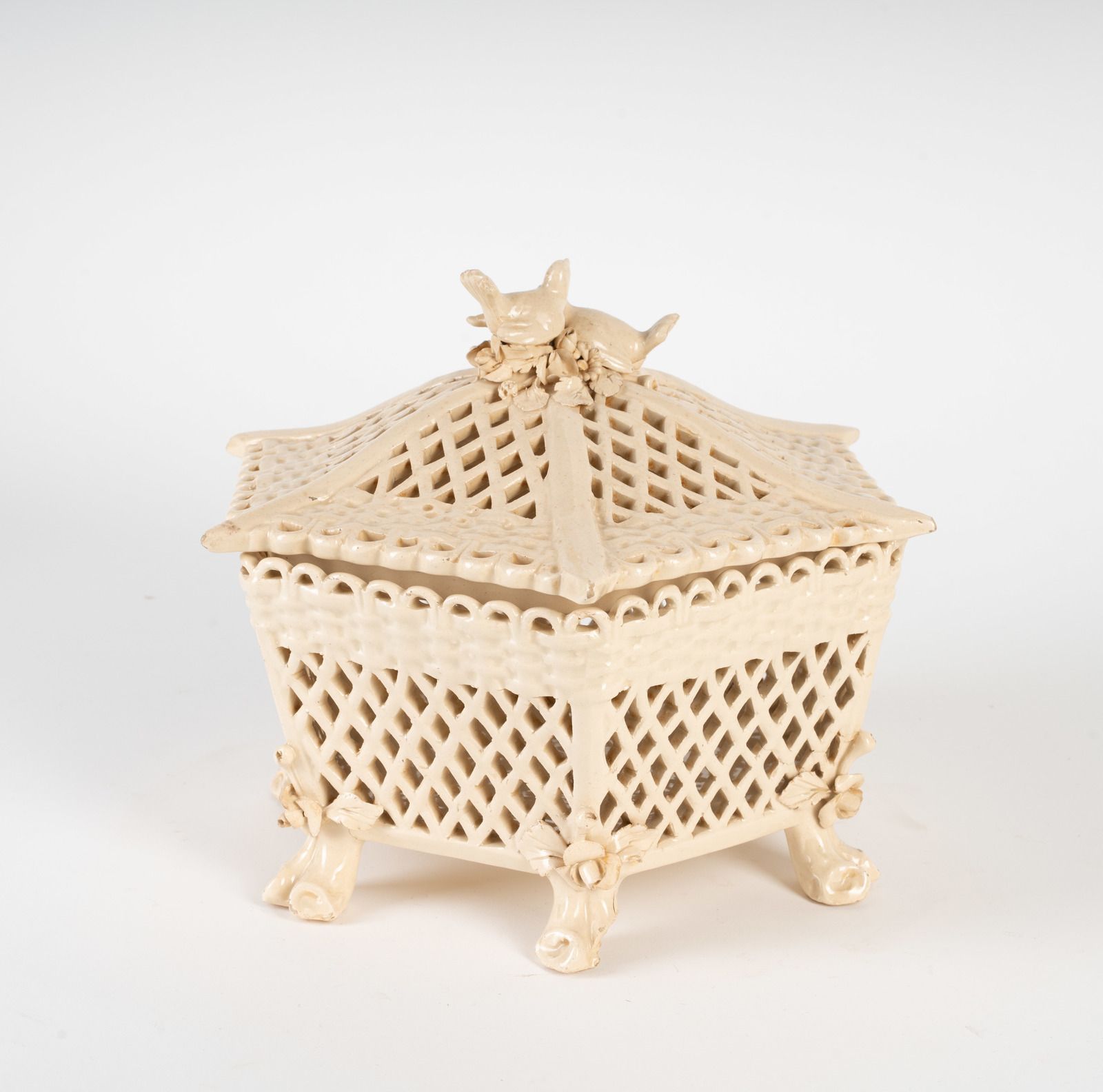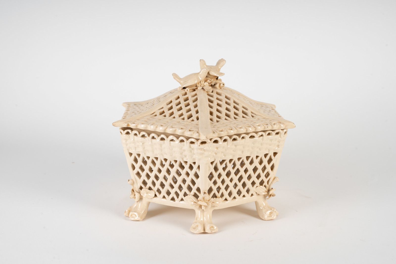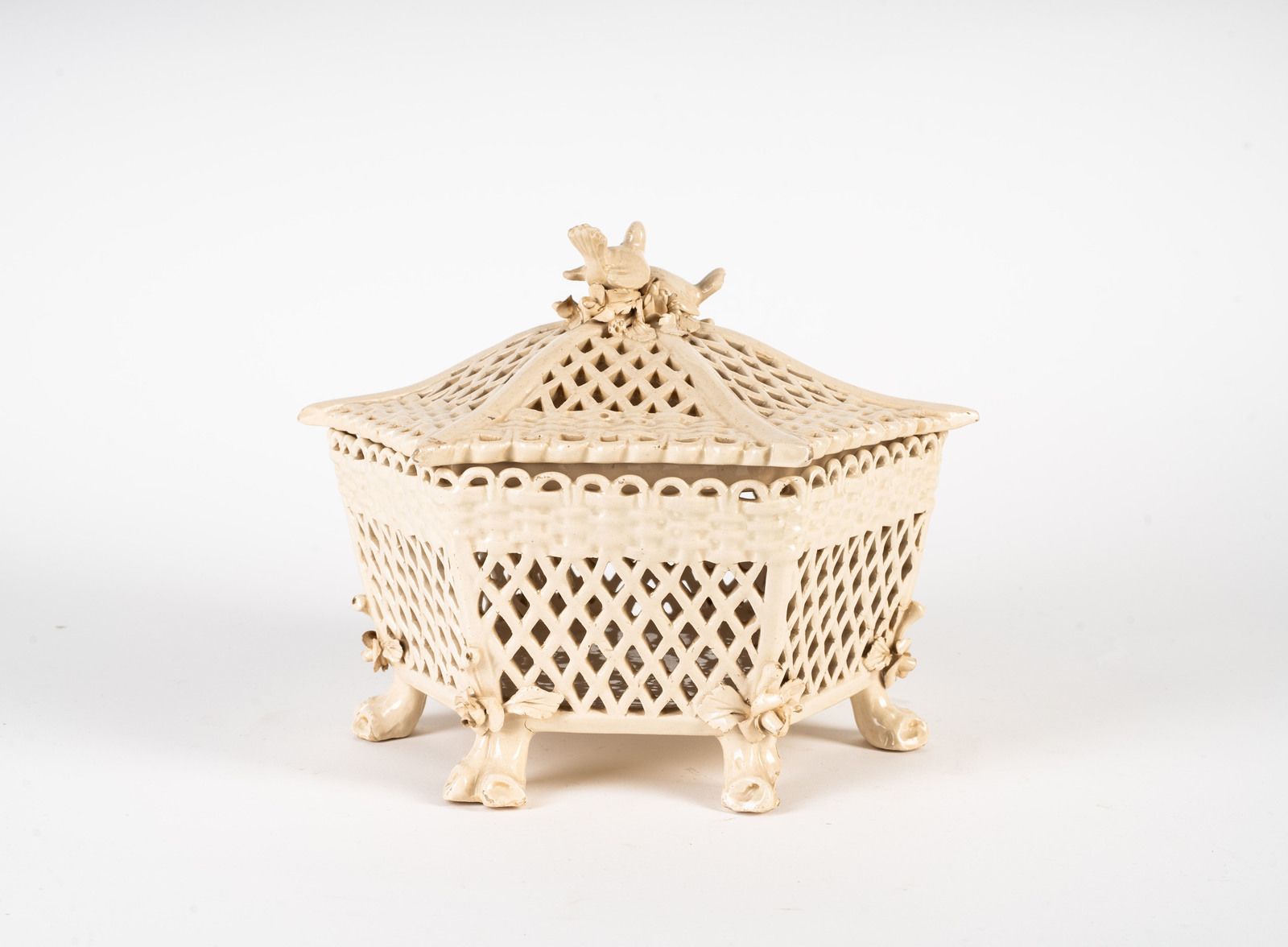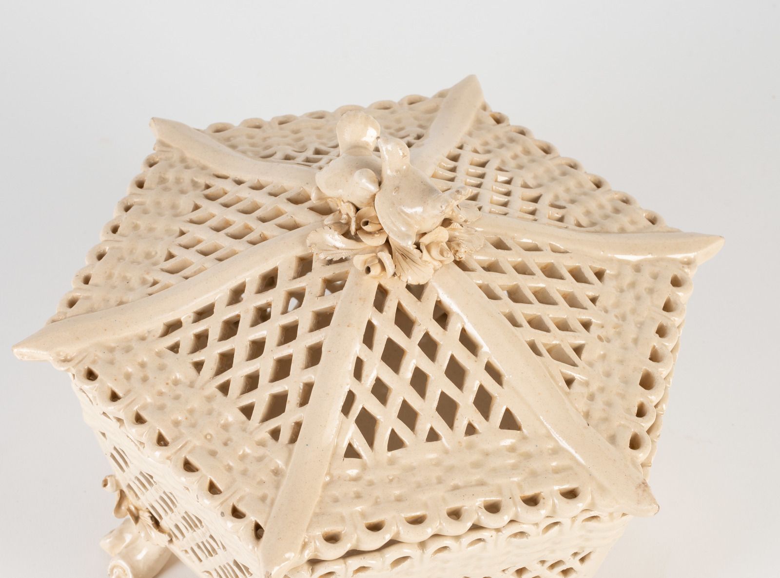 Cofanetto esagonale in terraglia traforata, presa decorata con colombe