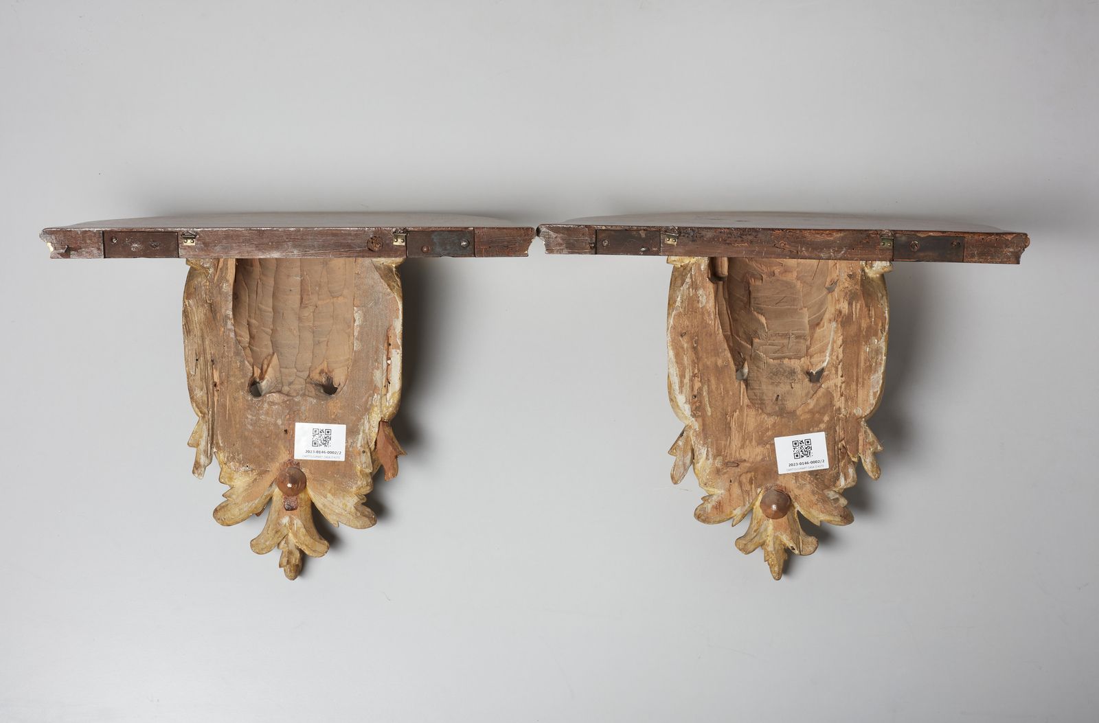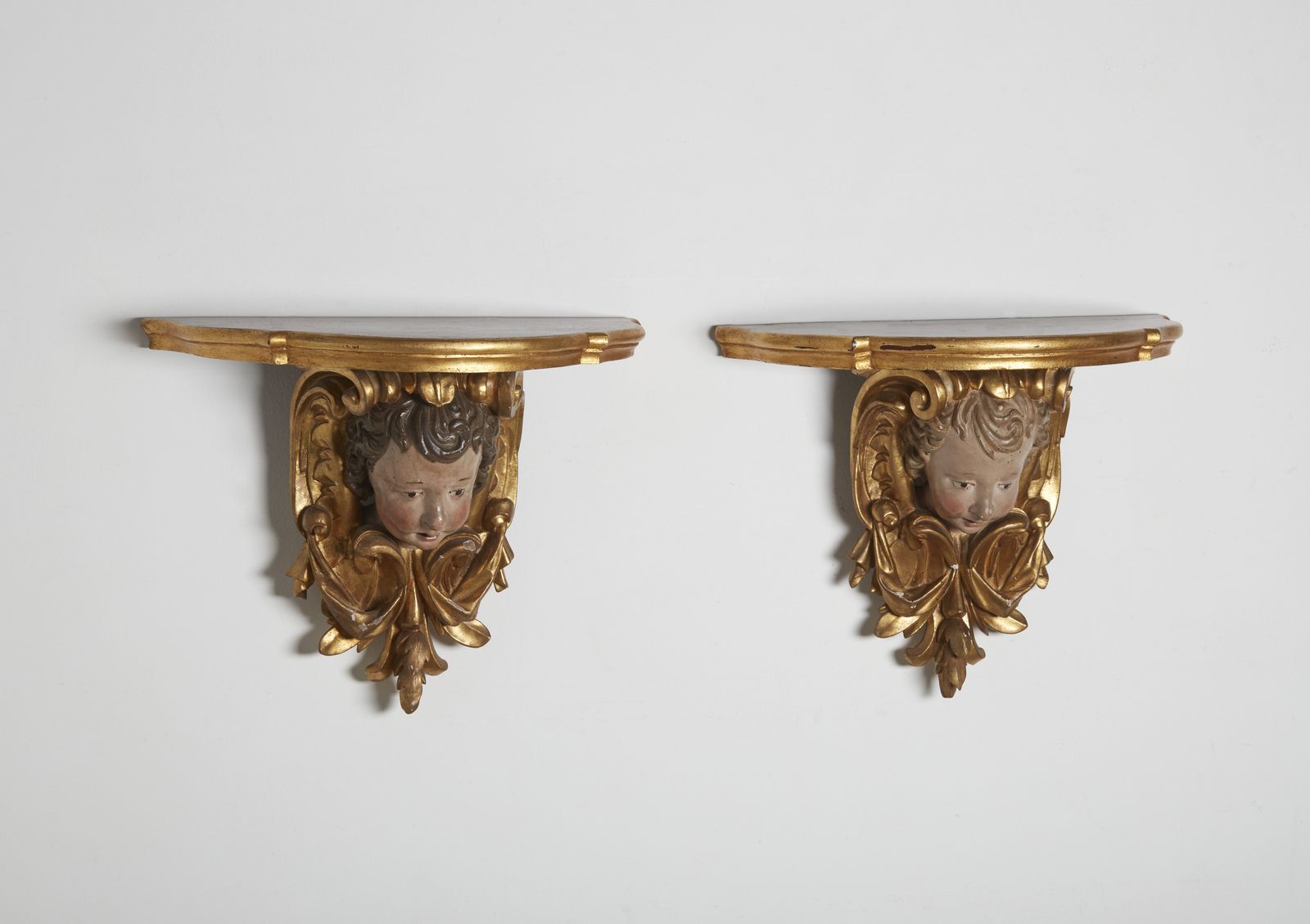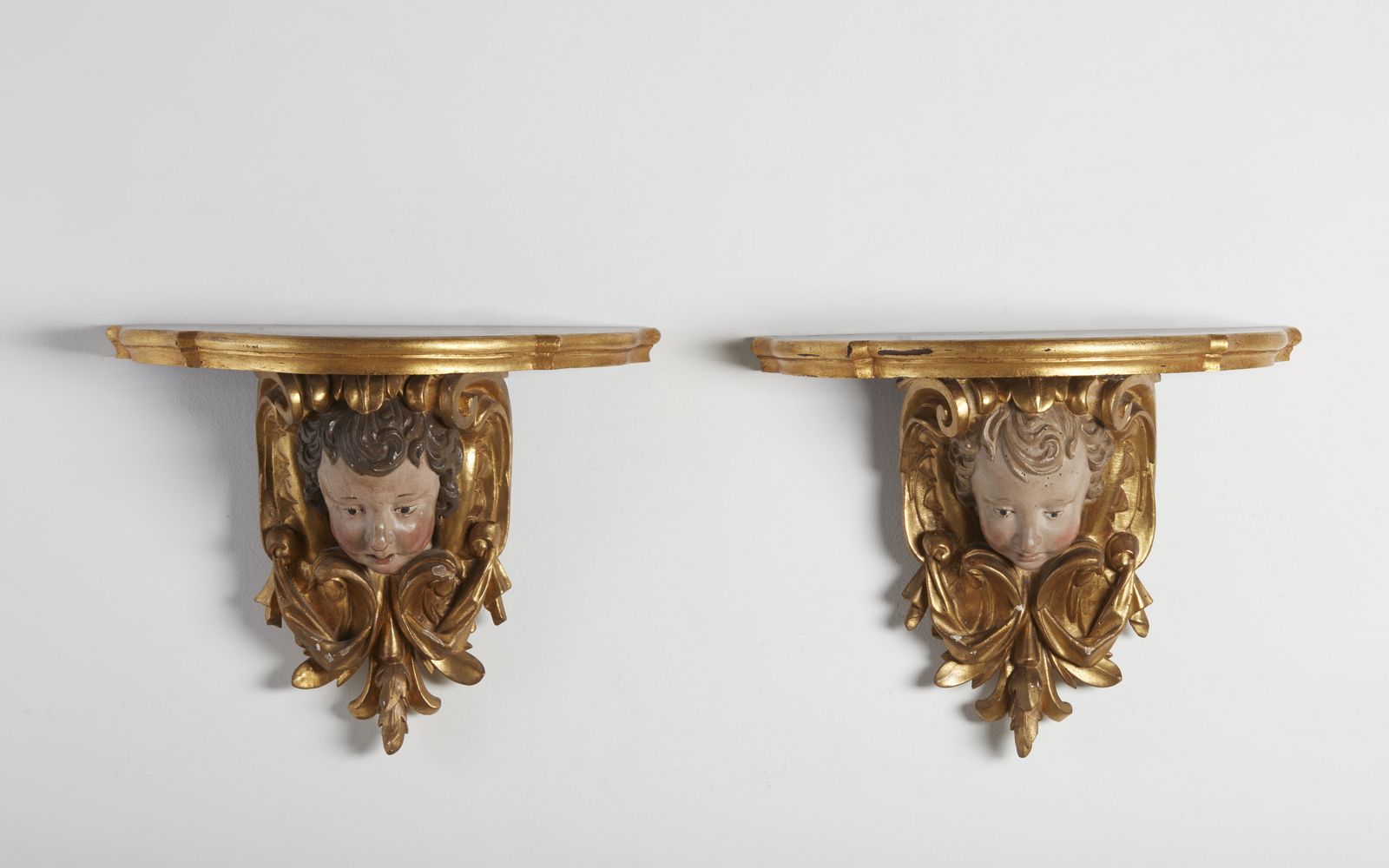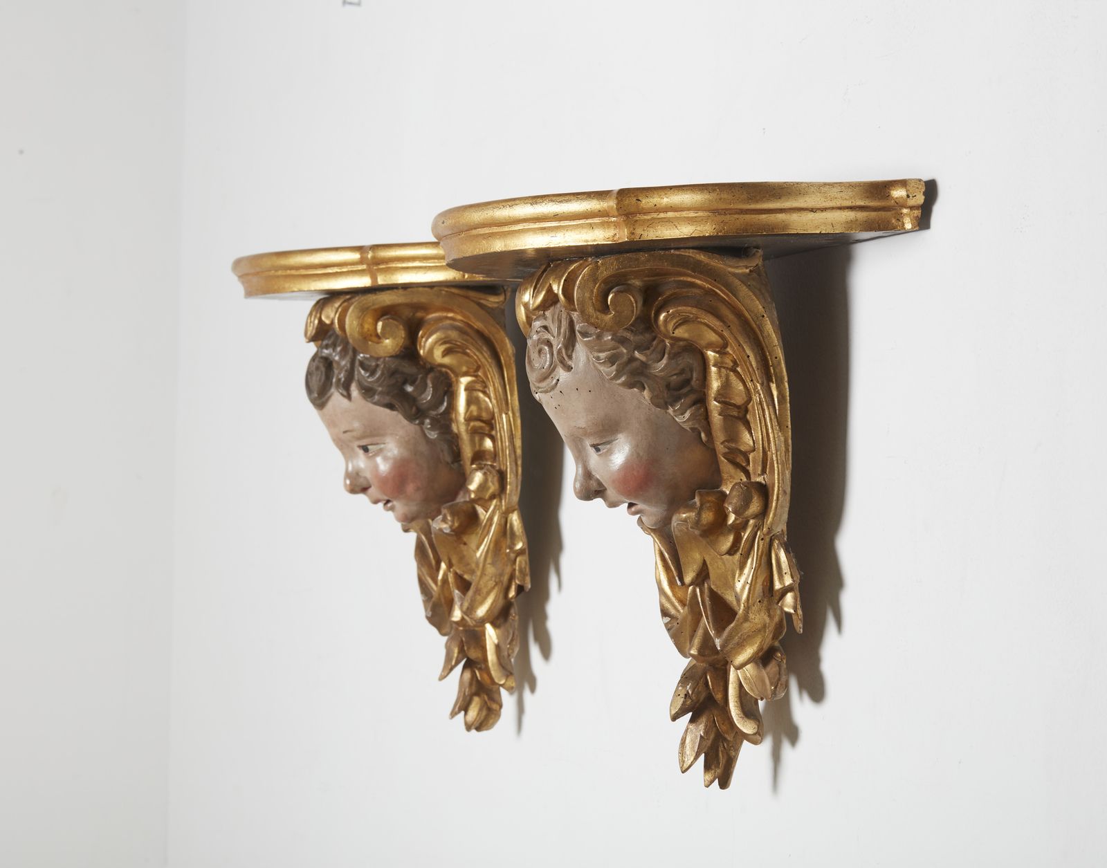 Coppia di mensole in legno scolpito, dipinto e parzialmente dorato in forma di volti [..]