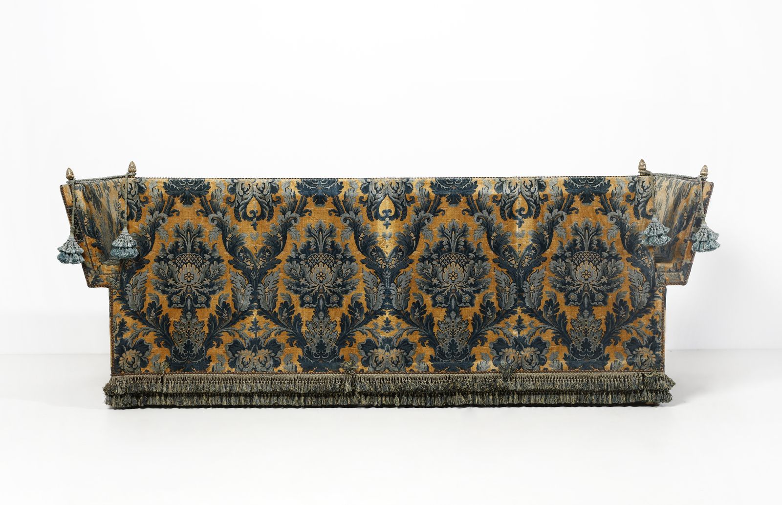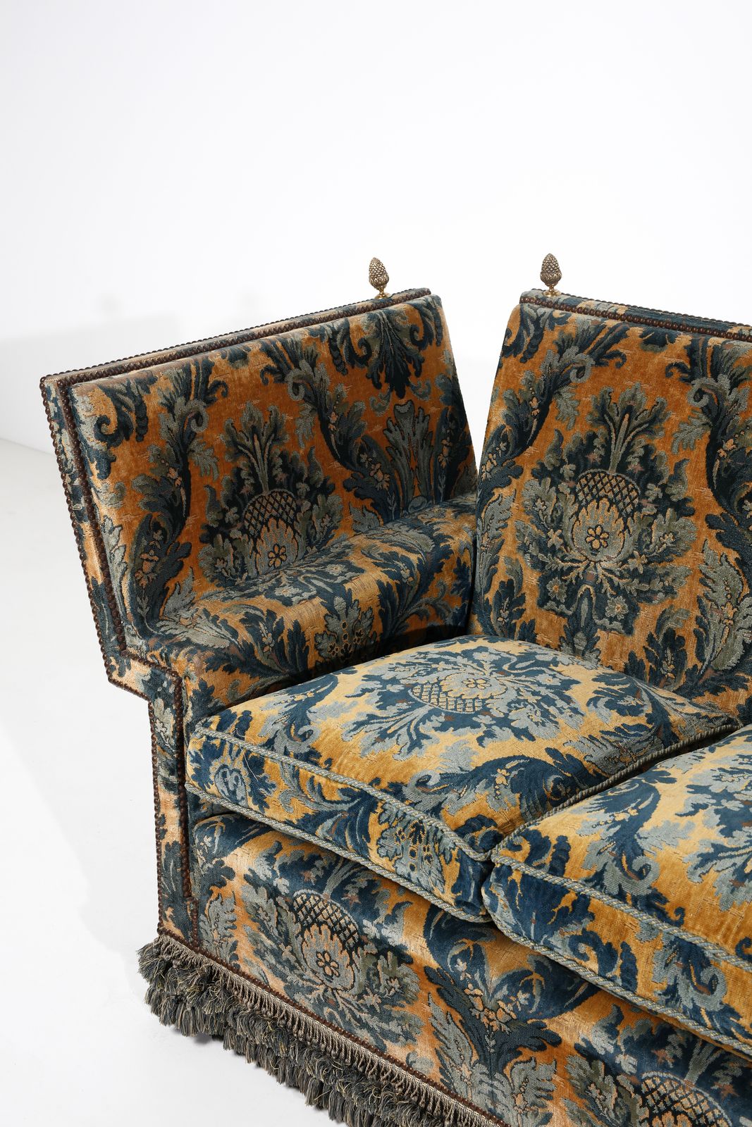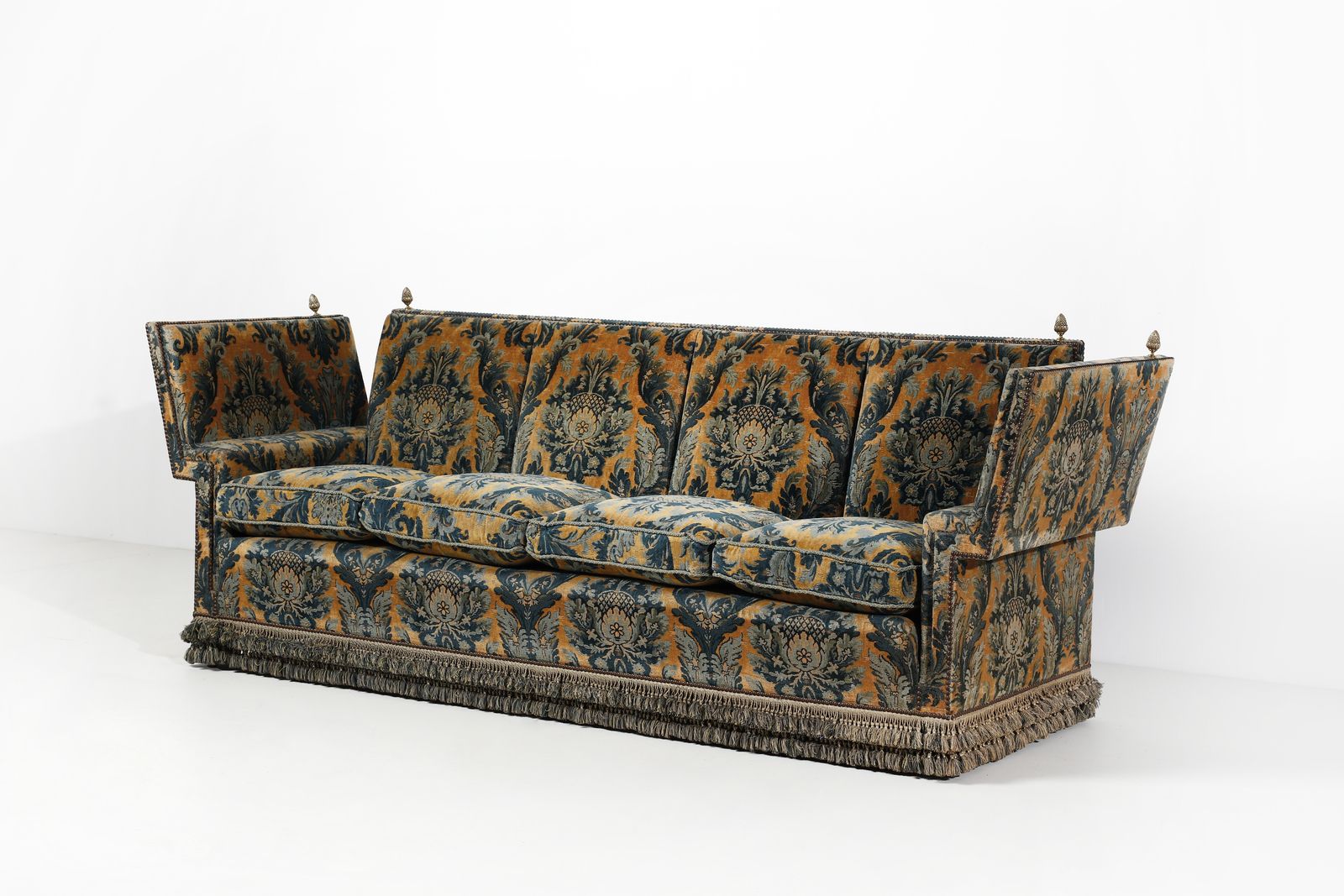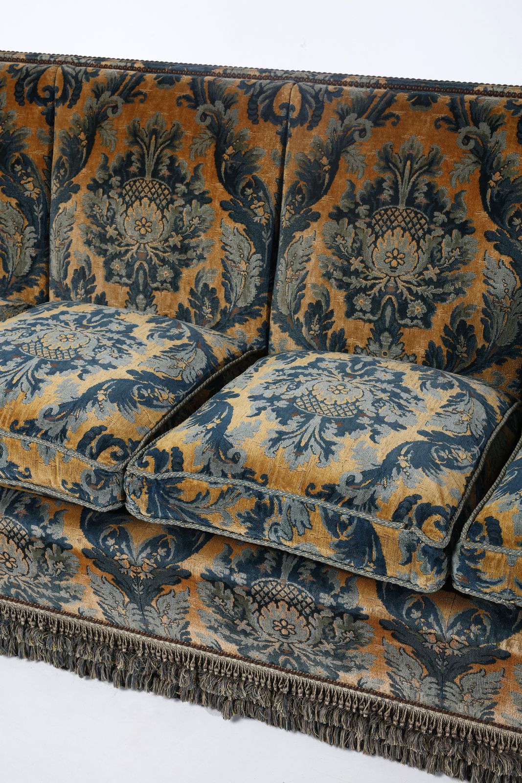 Divano a quattro sedute foderato a motivi vegetali con pigne dorate agli angoli [..]