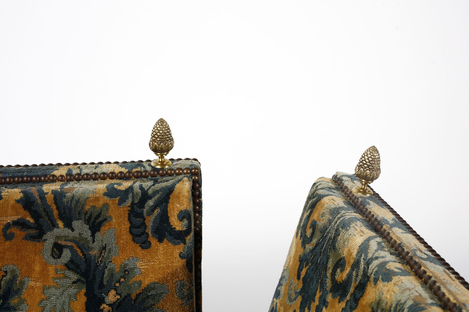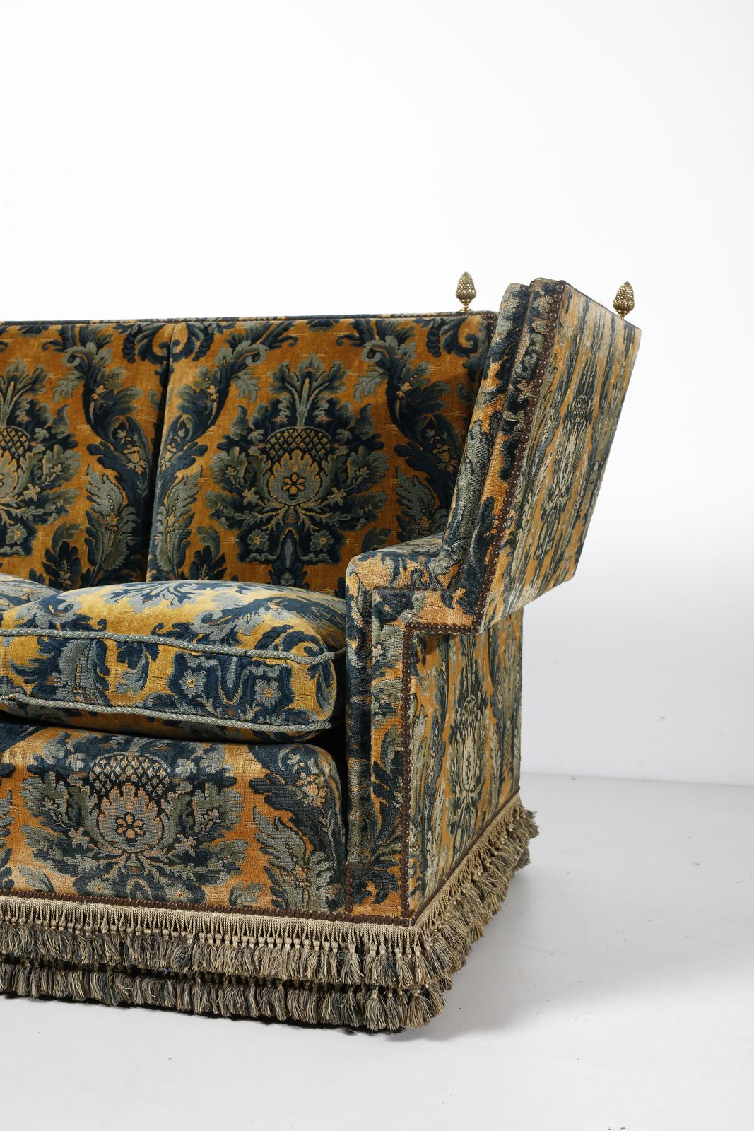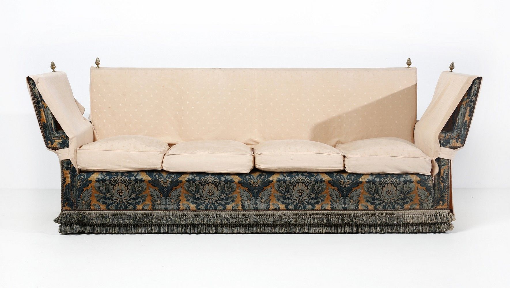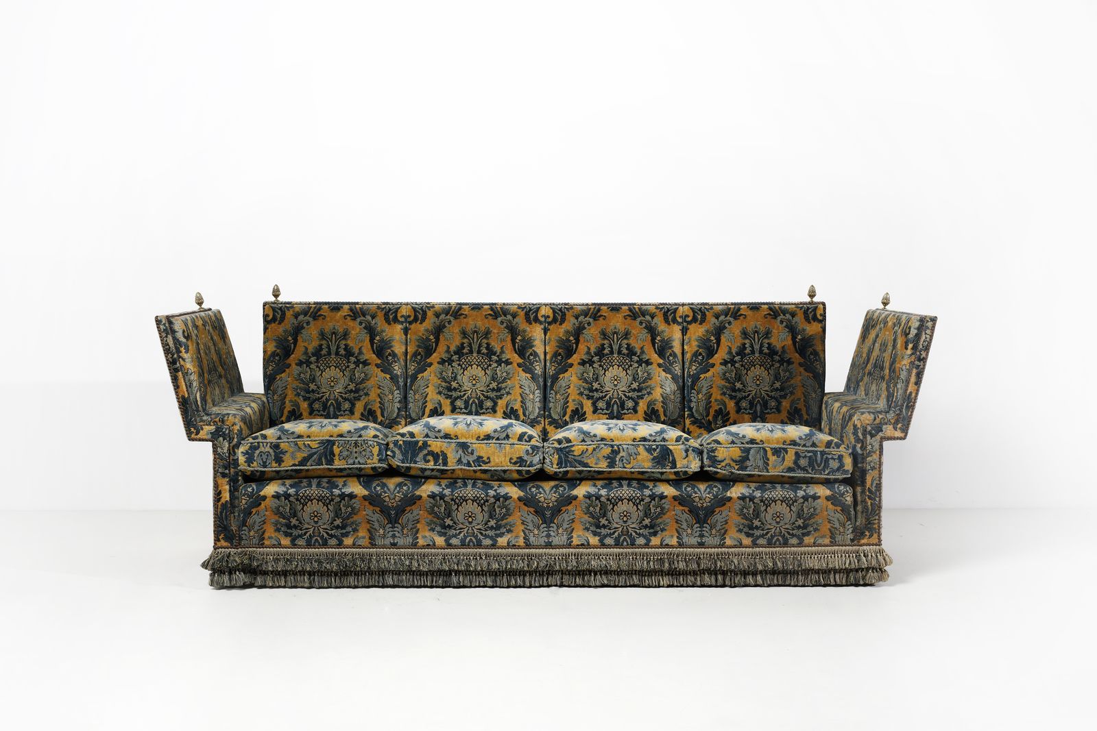 Divano a quattro sedute foderato a motivi vegetali con pigne dorate agli angoli [..]