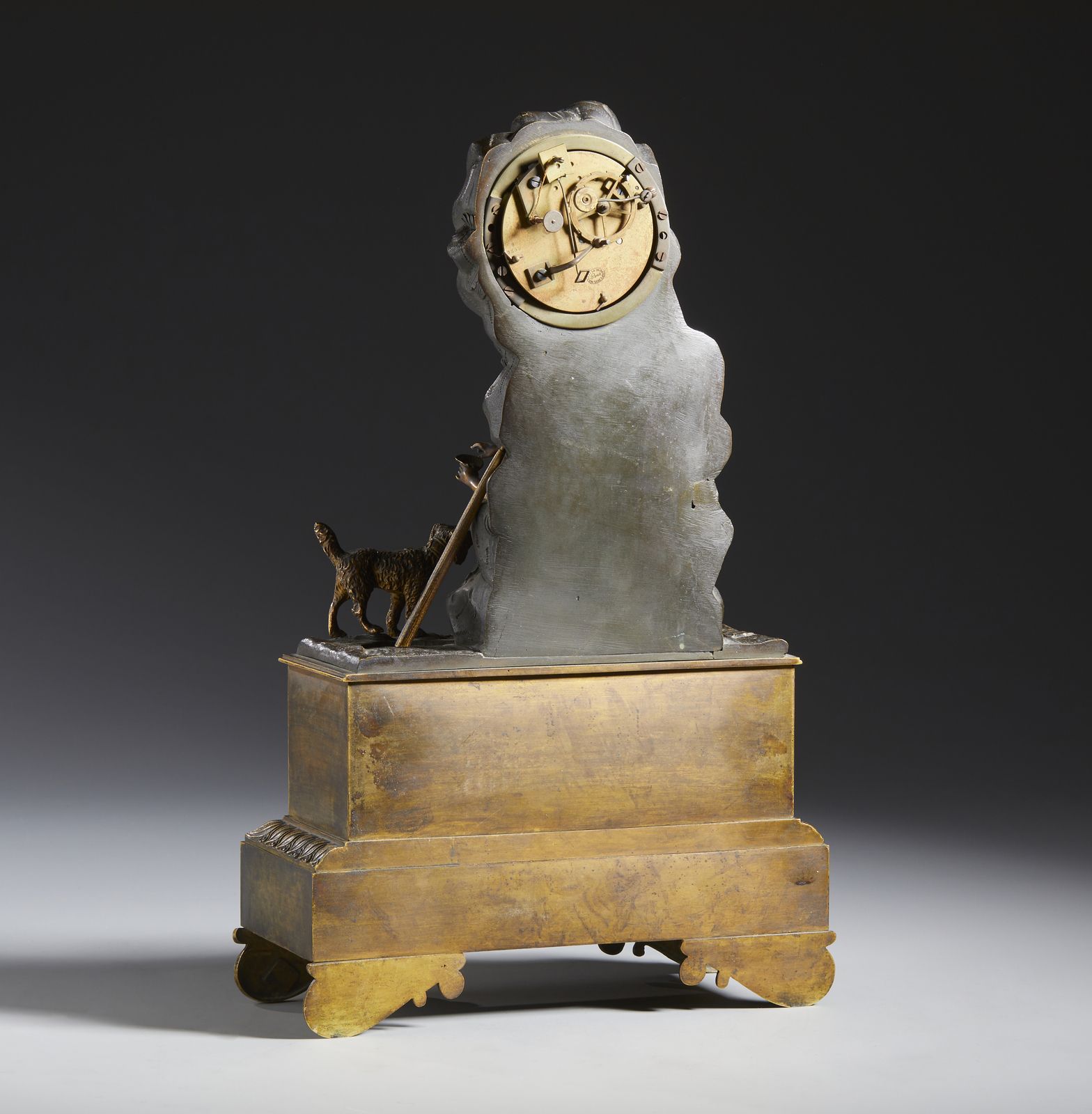 Orologio da tavolo in bronzo dorato con due figure e cane in un paesaggio roccioso, [..]