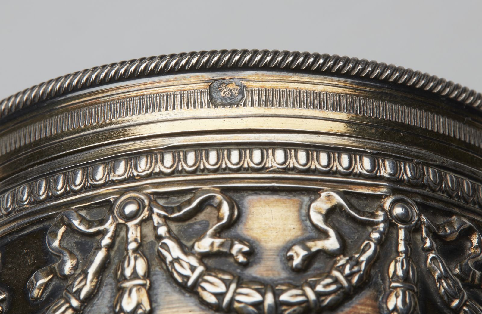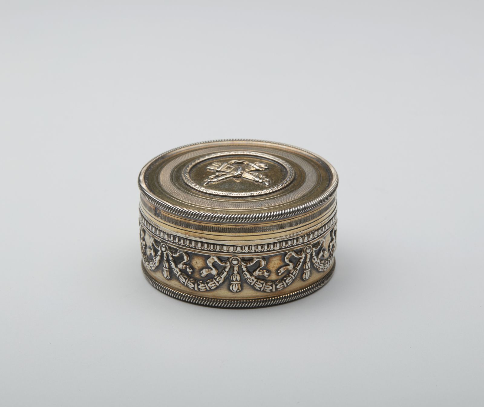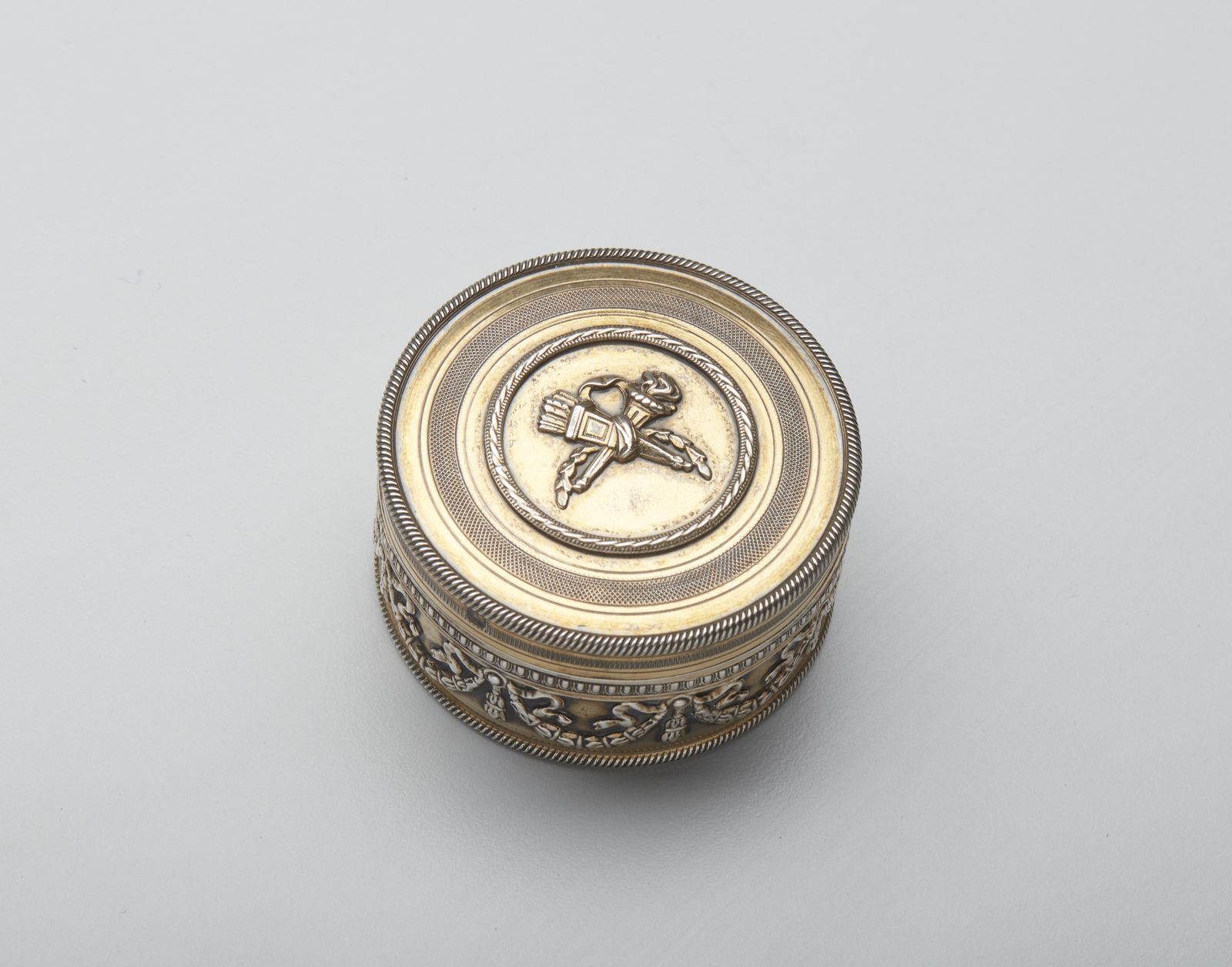Piccola scatola circolare in argento vermeil con decorazioni a ghirlande lungo il [..]