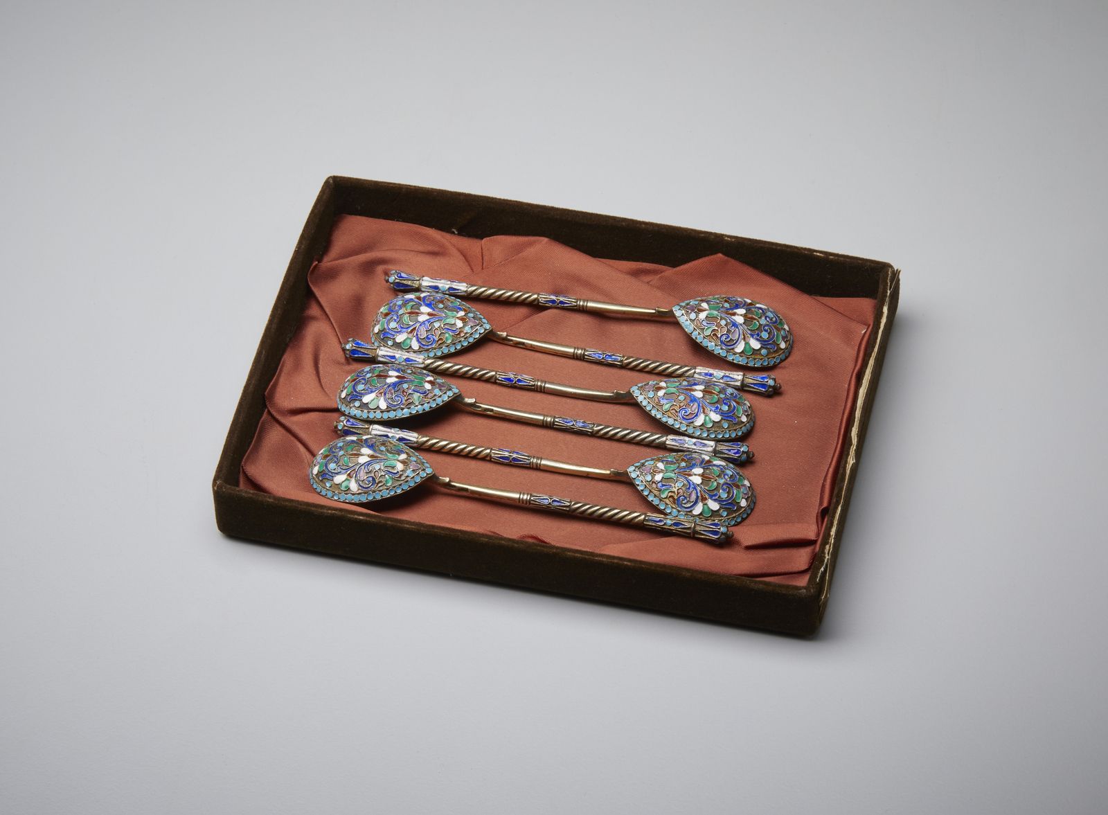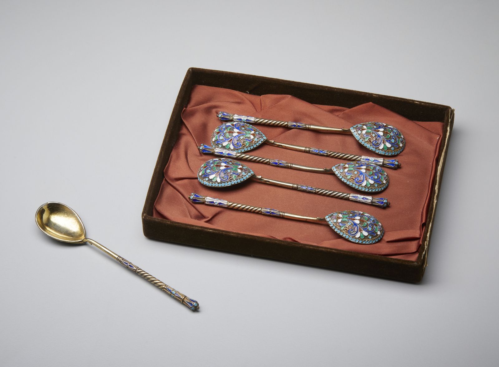 Sei cucchiaini da the in argento vermeil e smalto policromo
