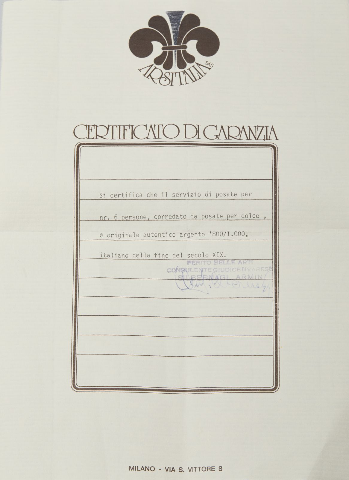 Marchi presenti. Titolo 800. Peso complessivo esclusi tutti i coltelli (manico in argento e lama in acciaio): 2,188 kg. Non presenti le piccole forchette da antipasto. Un cucchiaio grande da servizio non pertinente.