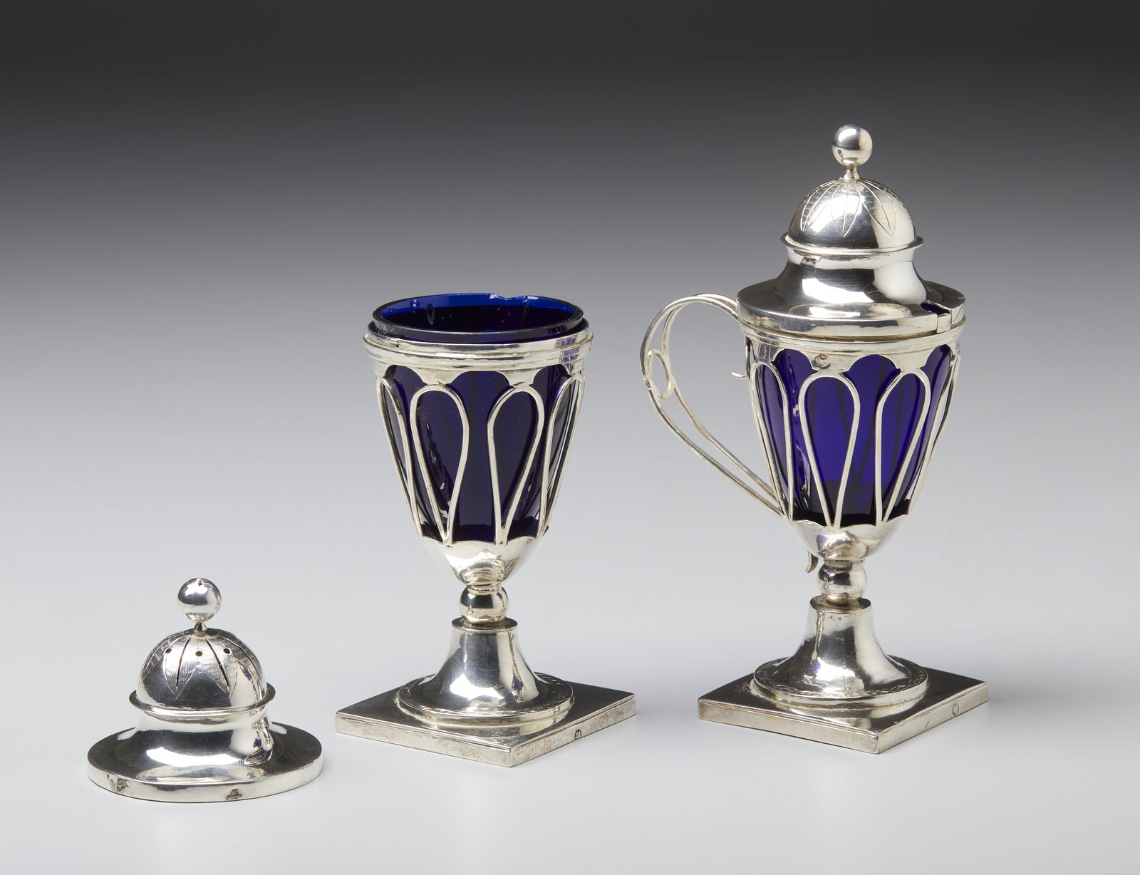 Spargisale e mostardiera in argento con cristalli blu