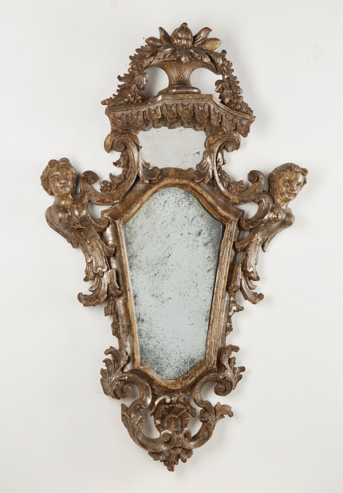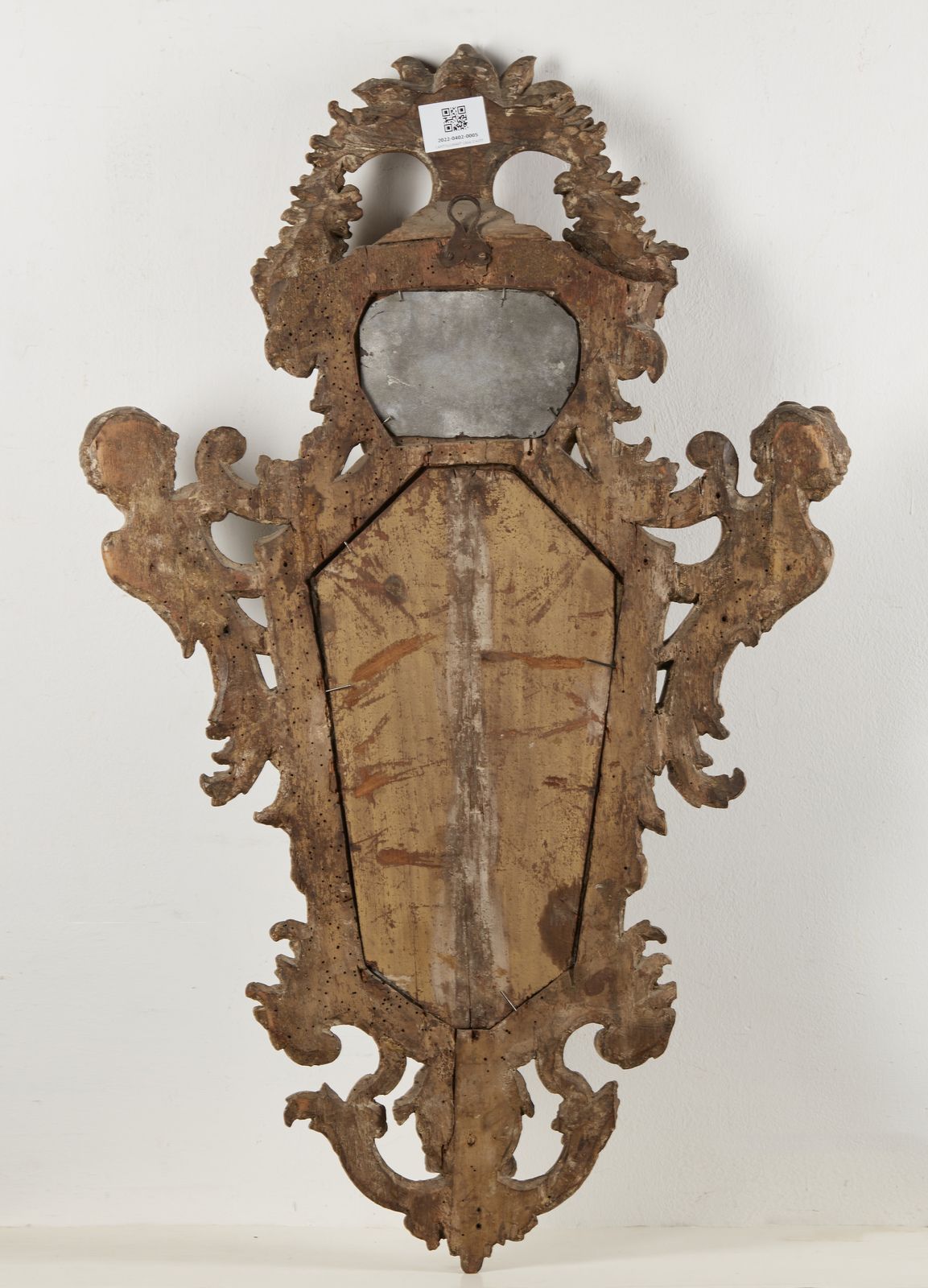 Specchiera in legno dorato a mecca con decorazioni a volute ed elementi fitomorfi, [..]
