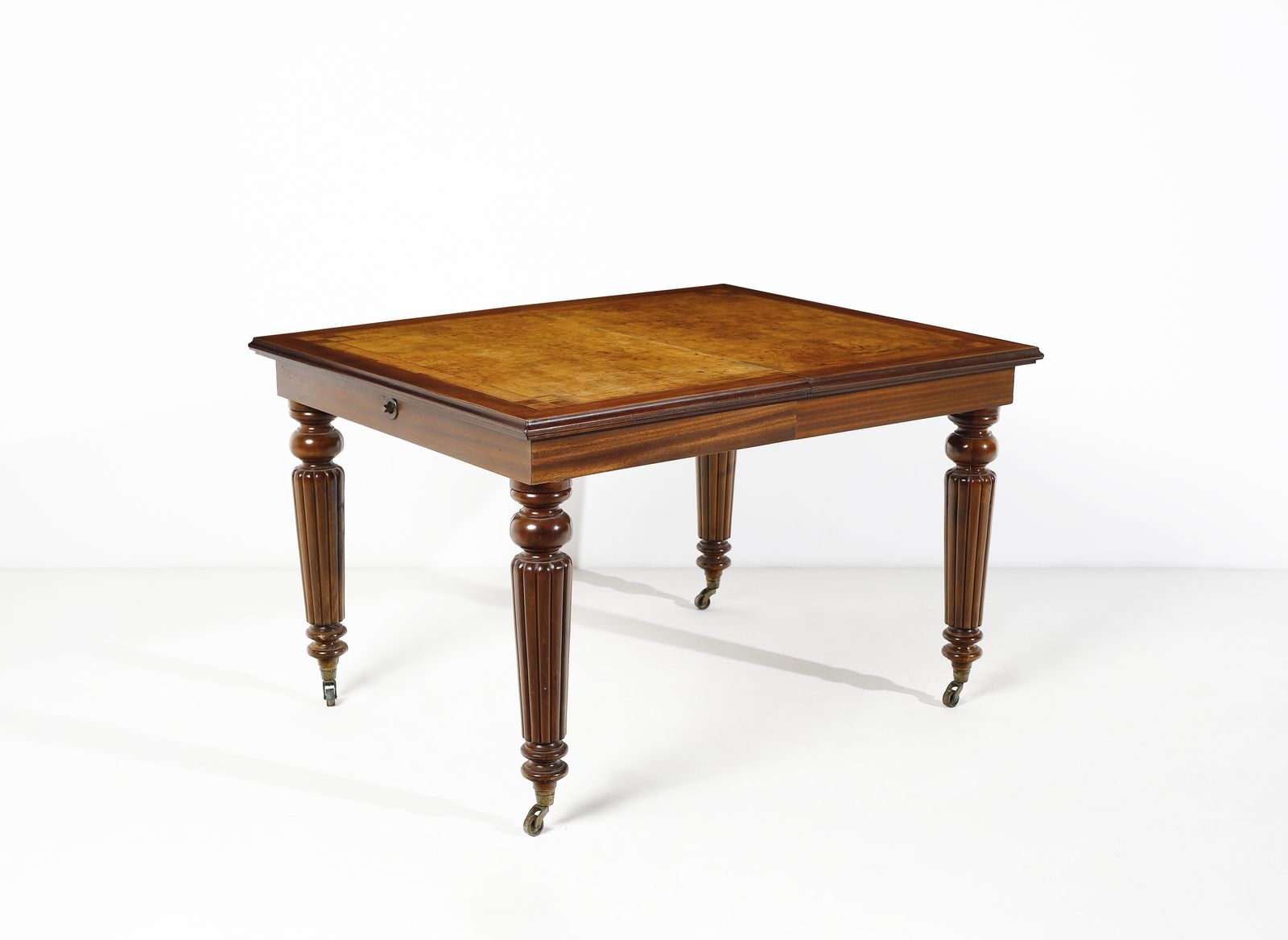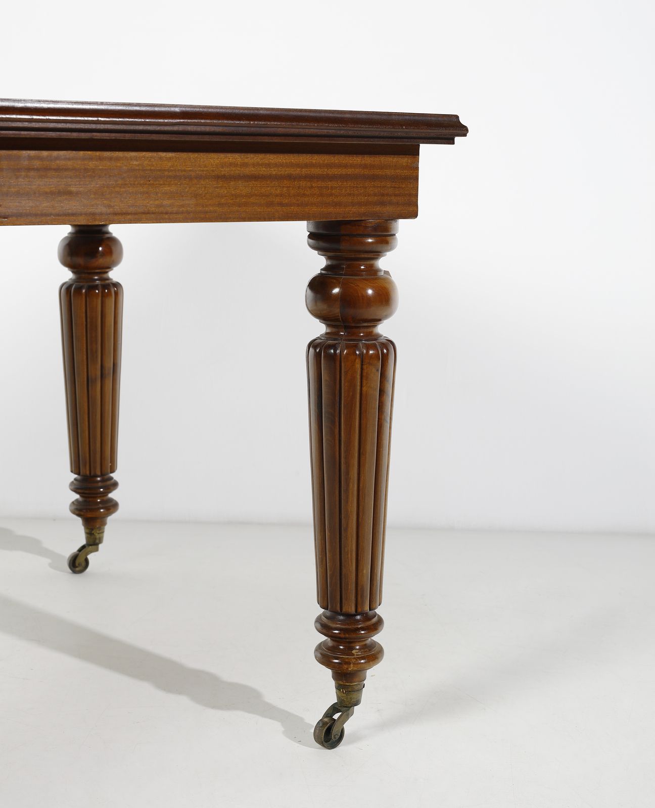 Tavolo da pranzo allungabile in mogano, piano rettangolare, gambe tornite e scanalate [..]
