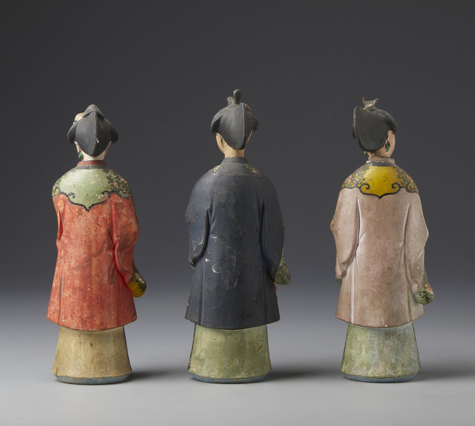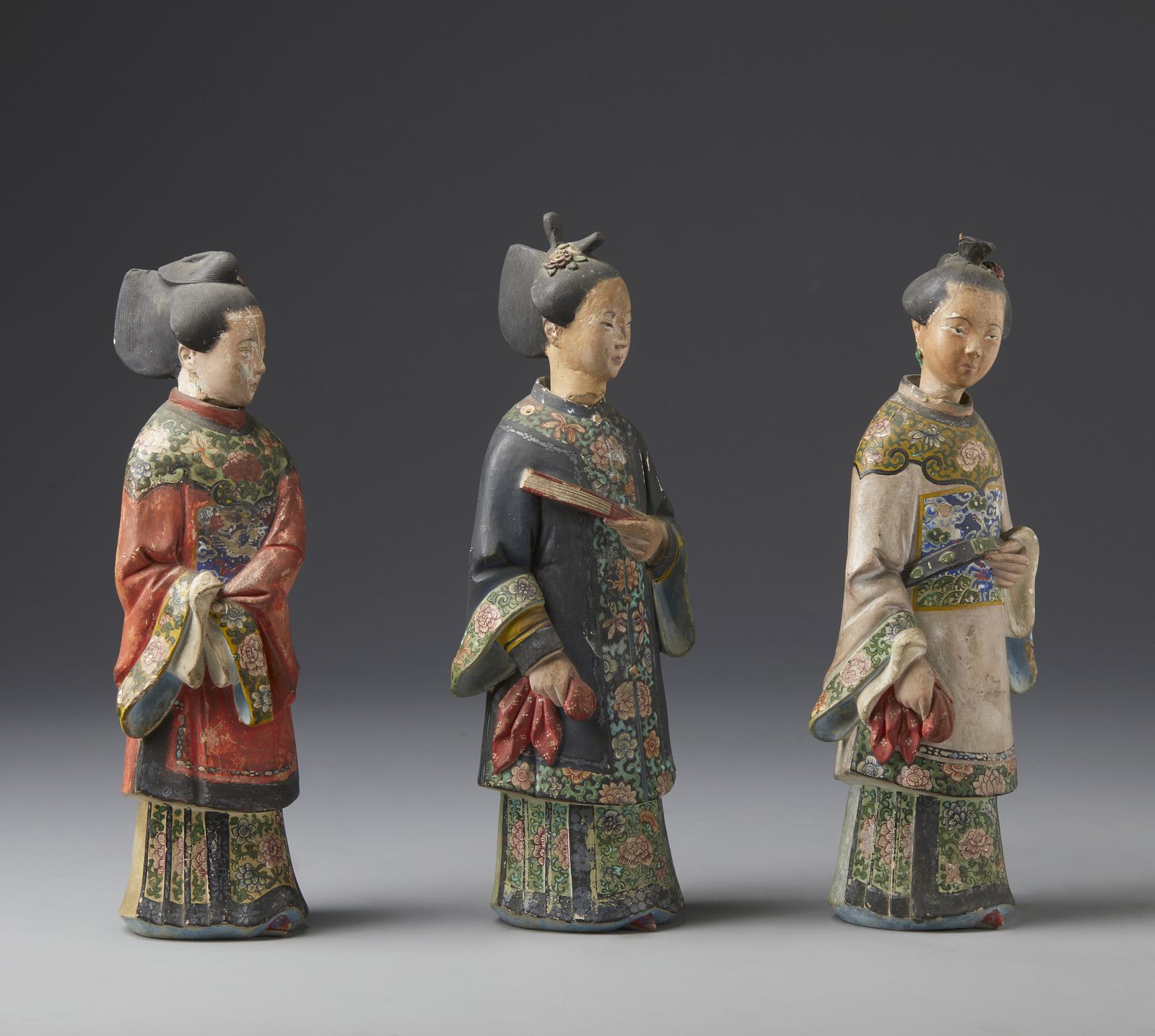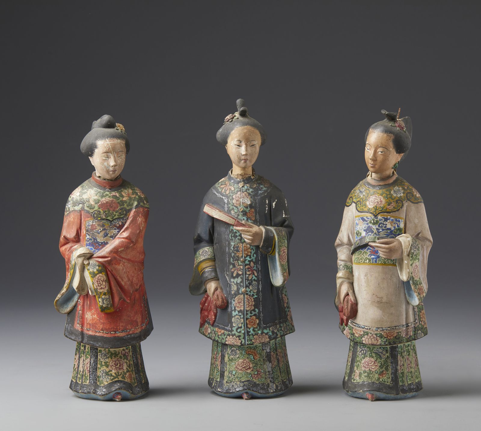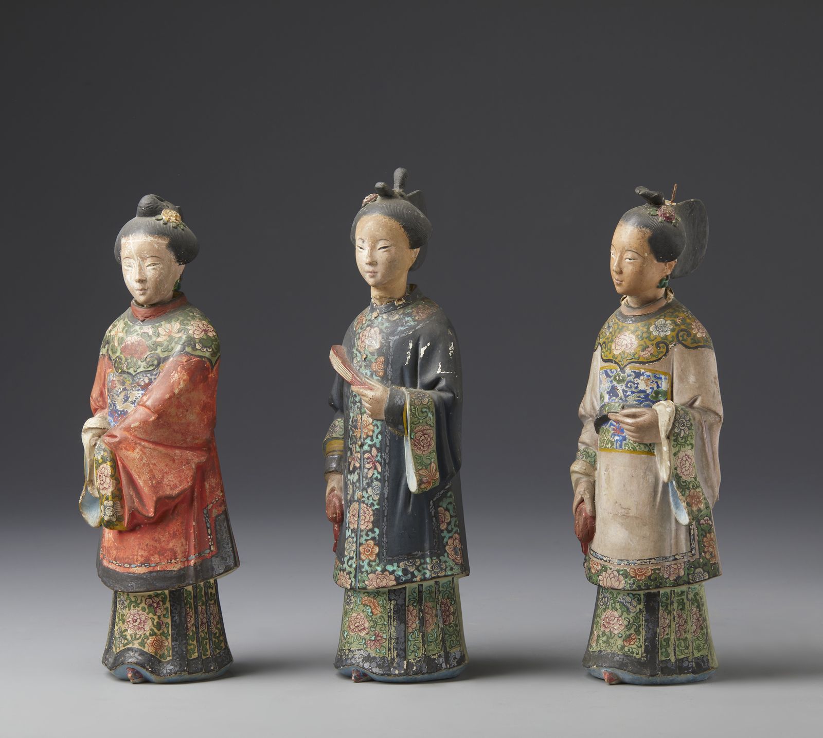 Tre magot in terracotta dipinta in policromia raffiguranti tre cortigiane cinesi