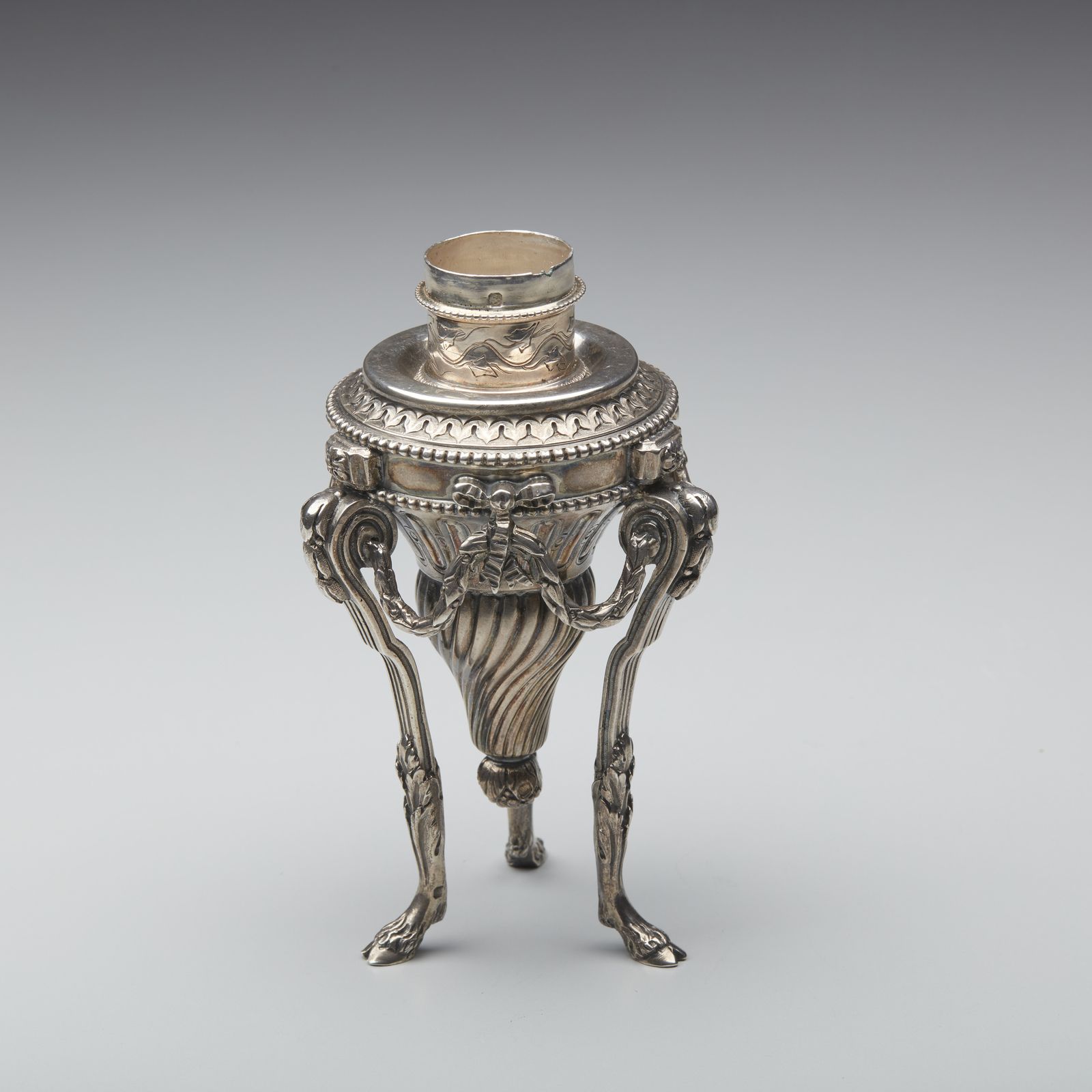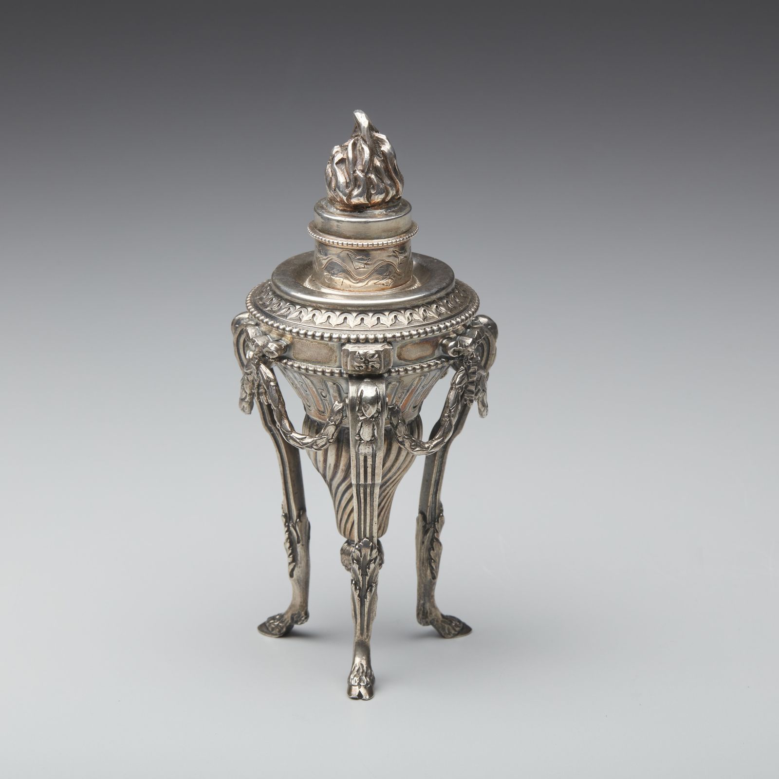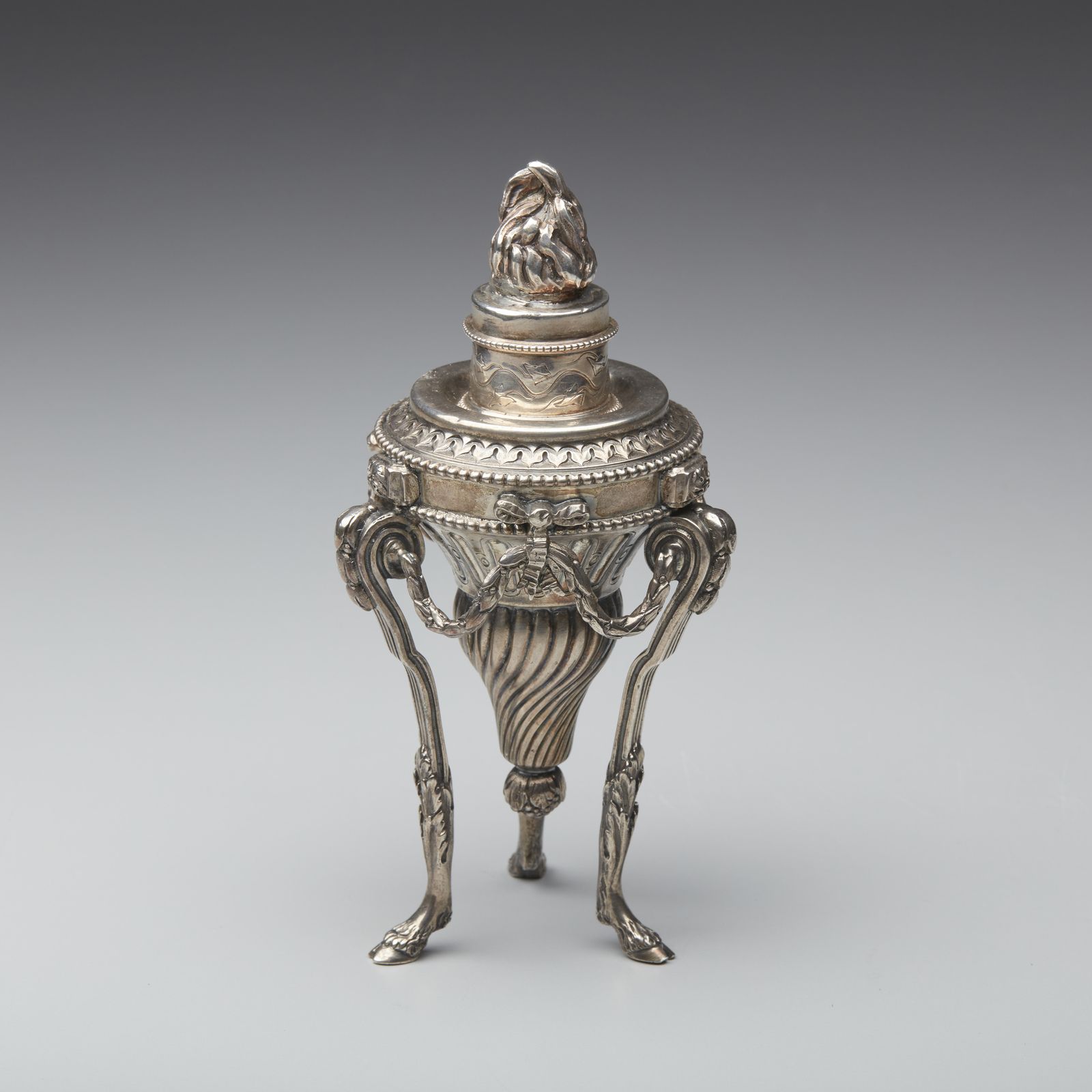 Tripode in argento con corpo a torchon e fiamma sulla sommità, poggiante su piedi [..]