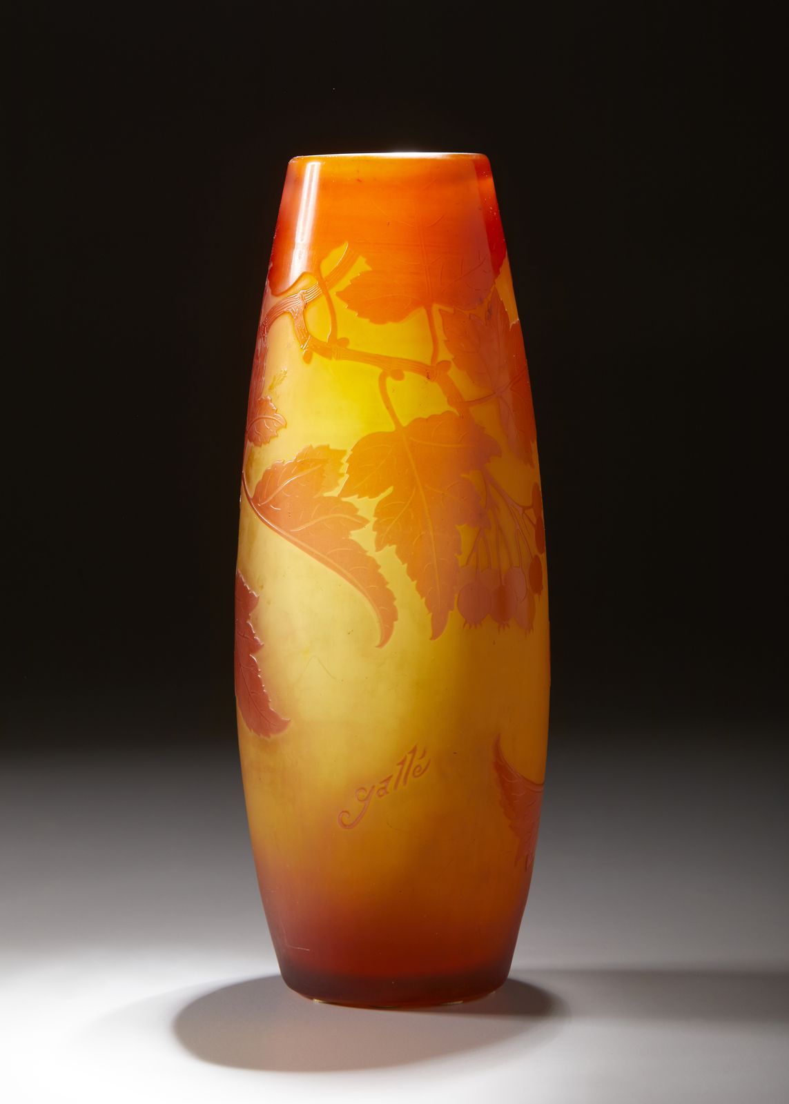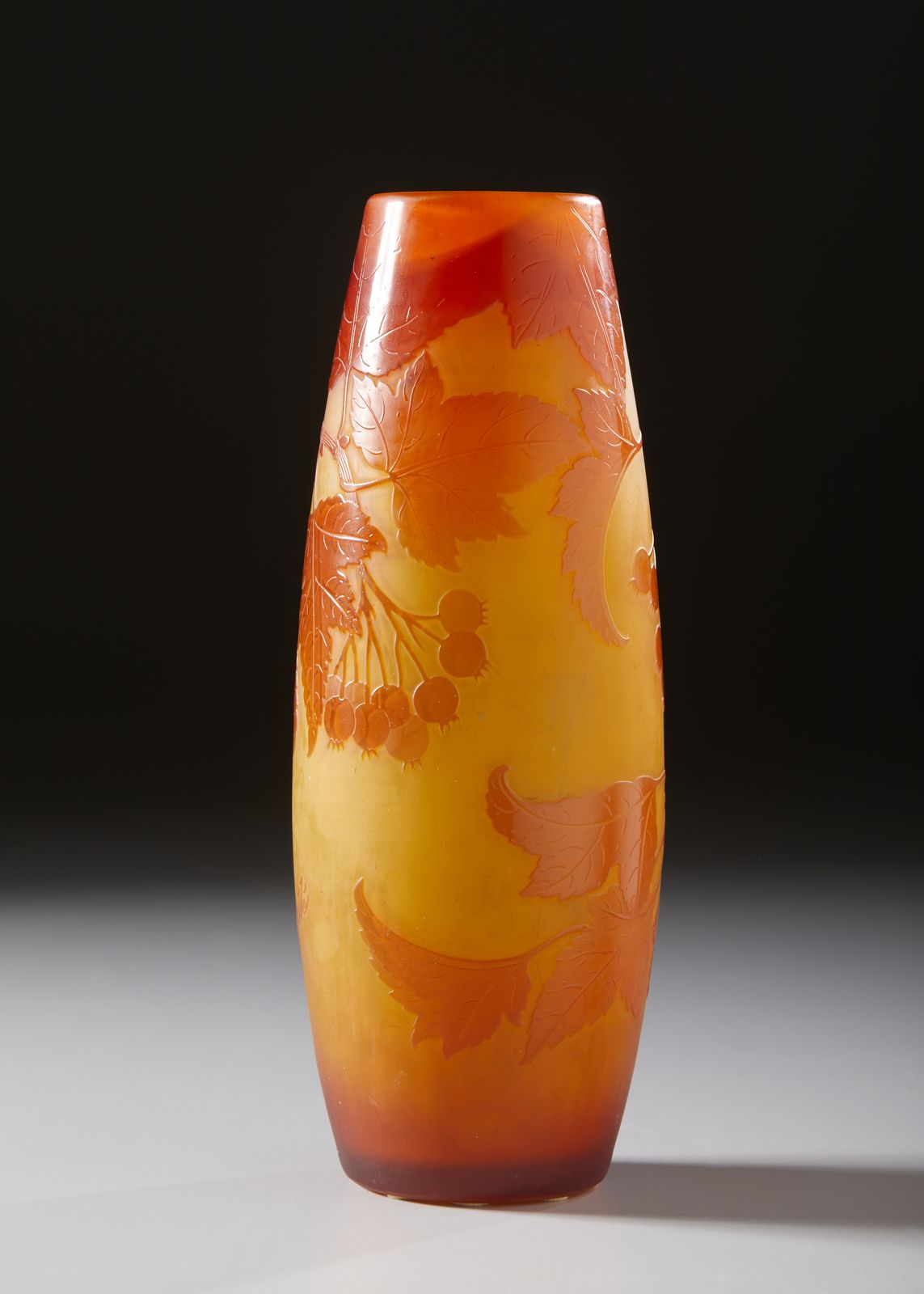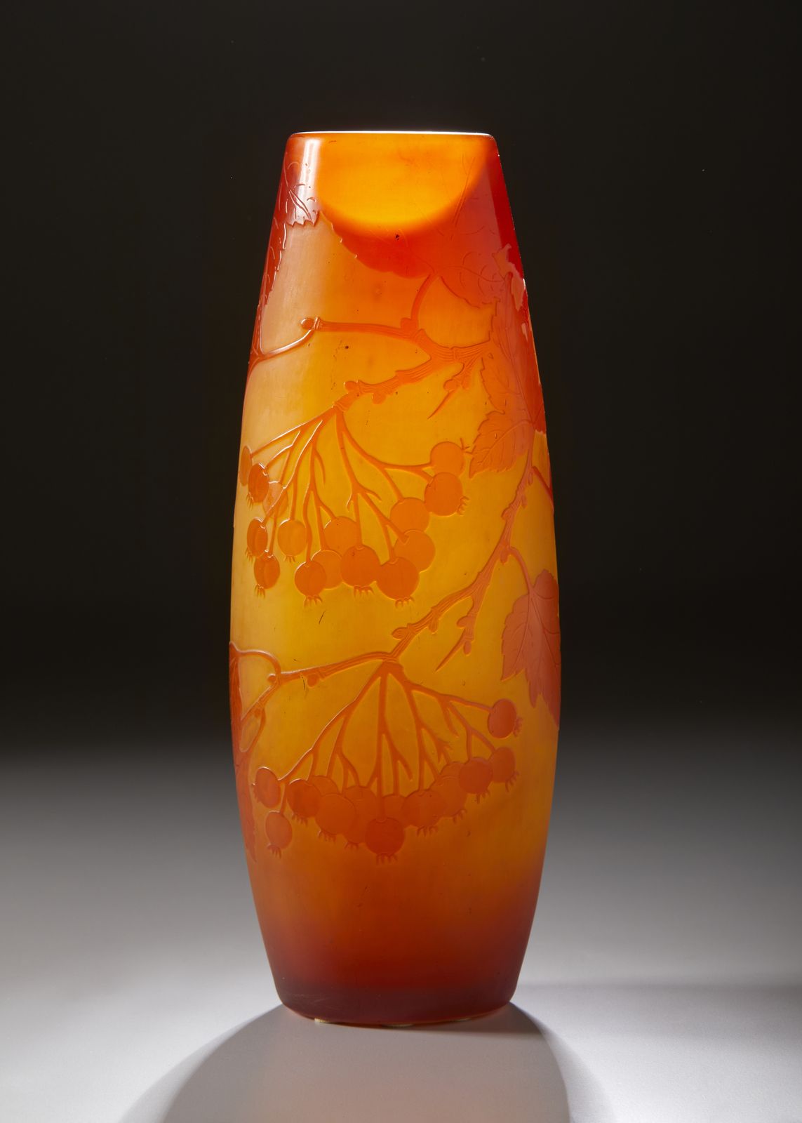 Vaso in vetro doppio, decoro di foglie e bacche nei toni dell'arancio e del rosso, [..]