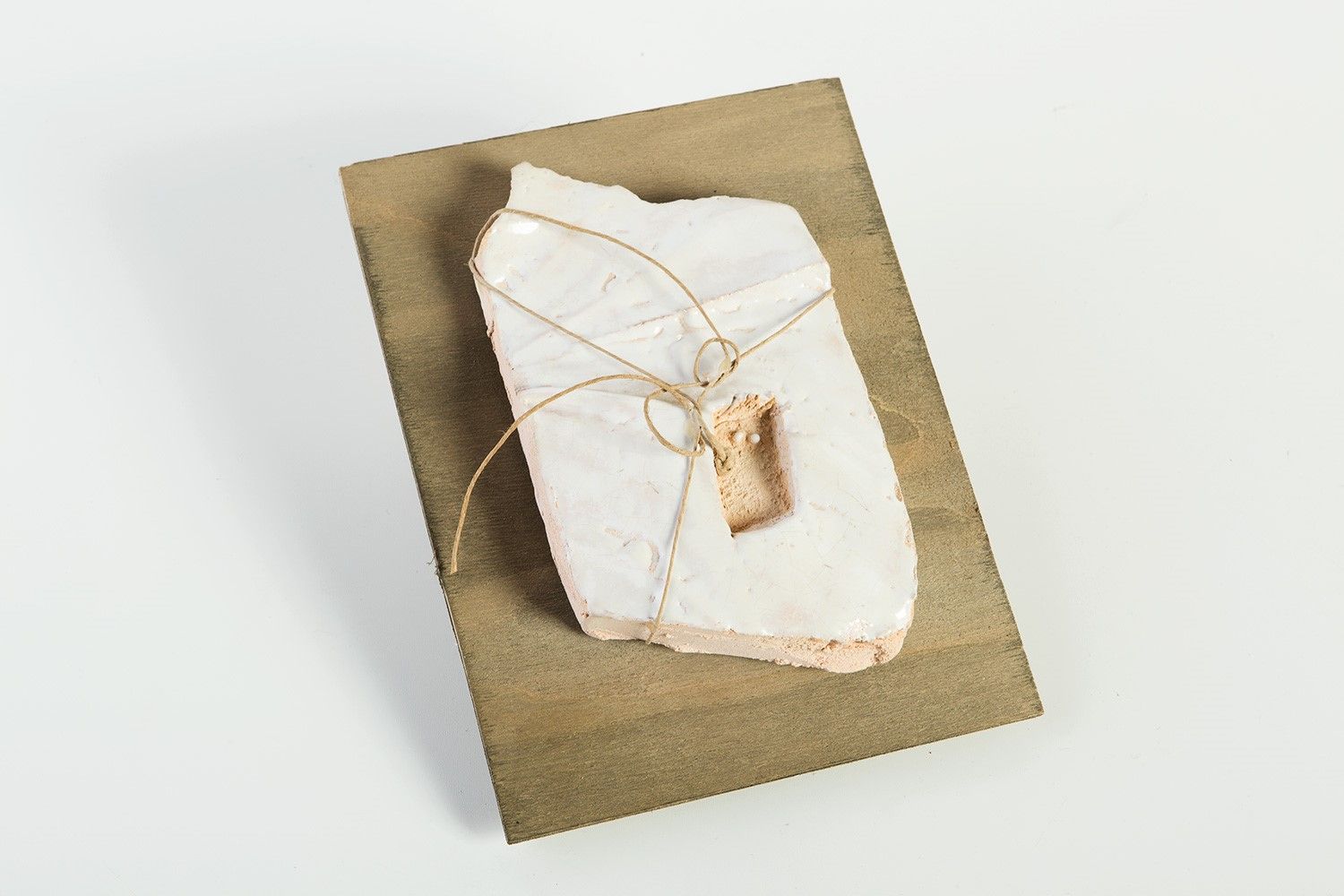 ceramica smaltata bianca, spago e legno, cm 20 x 15 x 6